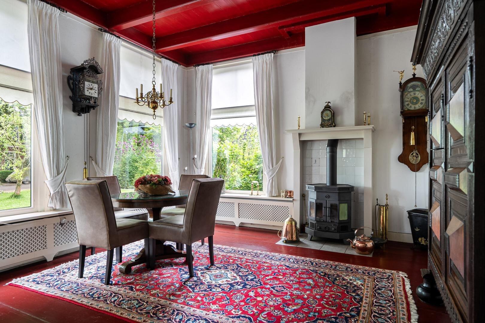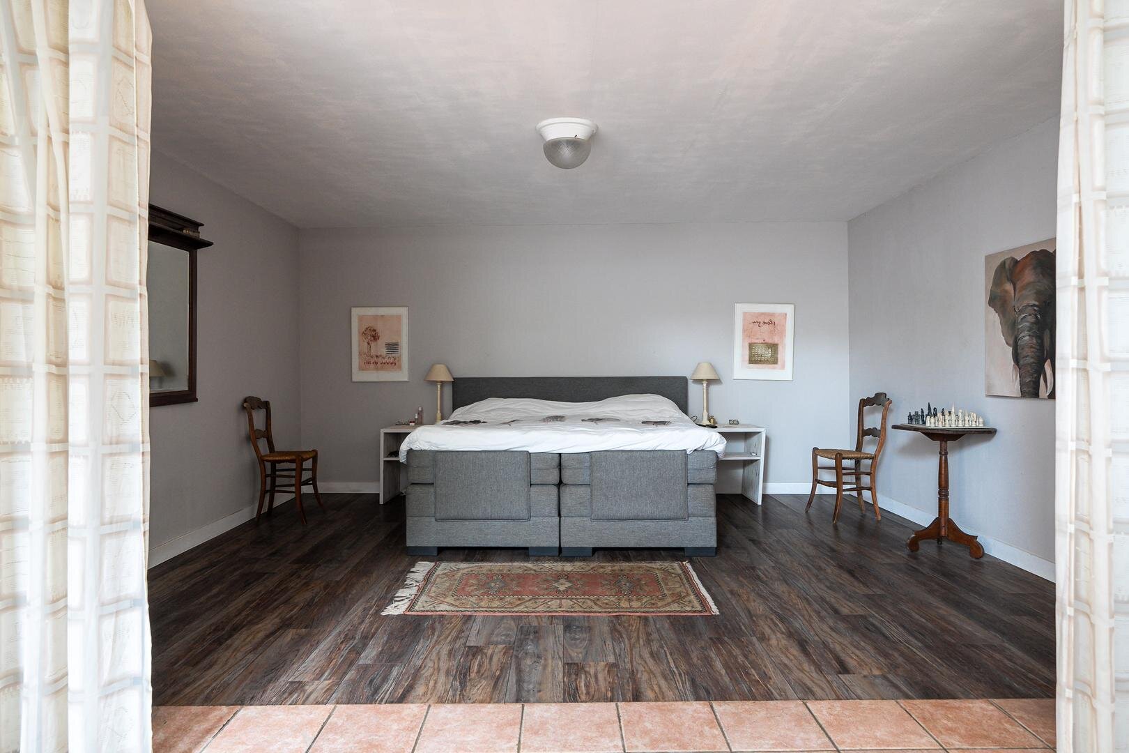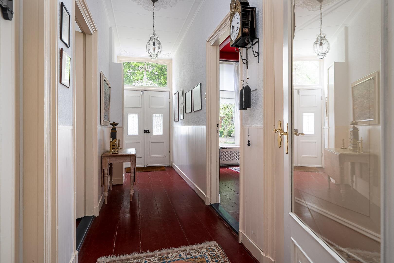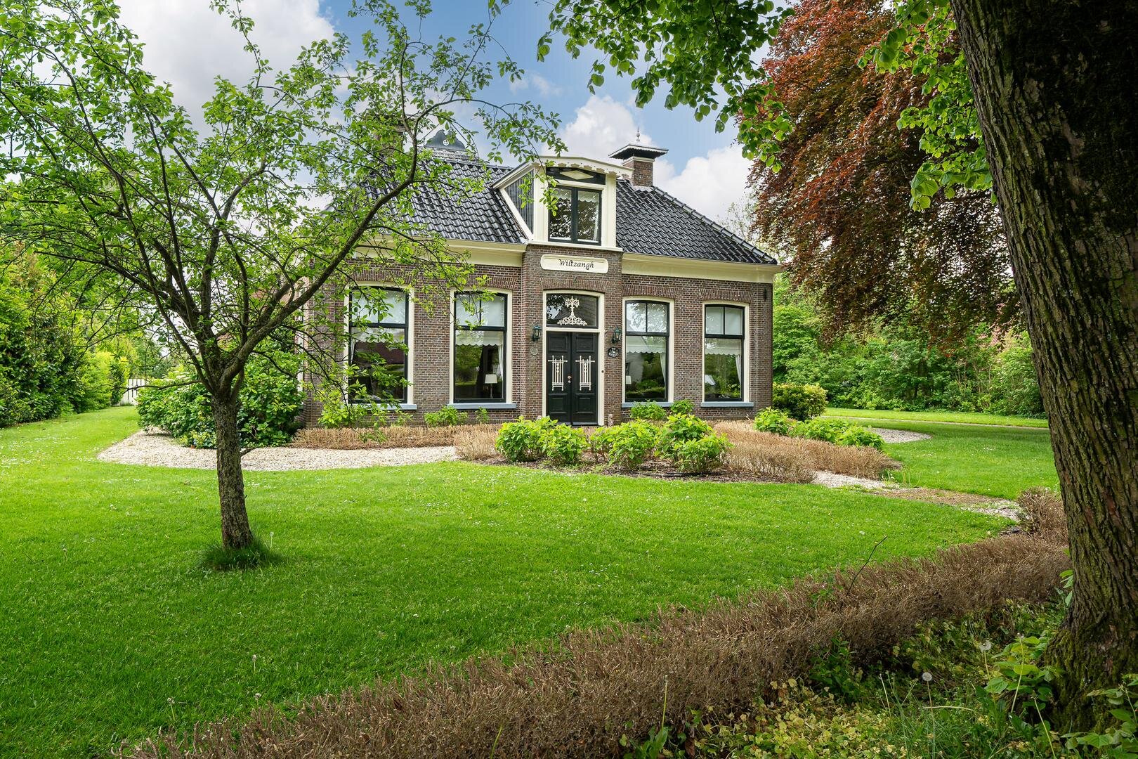 Zoals gebruikelijk is hier de entree aan de zijkant, maar voor de beschrijving beginnen we met de statige entree aan de voorzijde van de woning. U komt binnen in de royale hal en wat hier direct opvalt is de authentieke sfeer en hoogte van de plafonds. Aan weerzijden bevindt zich een woonkamer met prachtige balkenplafonds, waarbij één woonkamer beschikt over een houtkachel en de andere beschikt over een sfeervolle openhaard. Beide kamers hebben prettig uitzicht over de rustige straat, waar alleen bestemmingsverkeer langsrijdt. De woonkeuken is toegankelijk vanuit de gang en vanuit de woonkamer en beschikt over diverse inbouwapparatuur o.a. magnetron, oven, groot gasfornuis, vaatwasser en koelkast. Aan de andere zijde van de gang vindt u de royale bijkeuken met vaste kasten en de aansluiting voor het witgoed en de vrieskist. Wanneer we verder gaan door de gang, komen we langs de toiletruimte met fontein en een separaat urinoir. Er achter is de zeer ruime badkamer met jacuzzi, infraroodcabine, douche, toilet en twee wastafels. Daarna volgt de kantoorruimte, hier is voldoende ruimte voor verschillende werkplekken en de ruimte heeft een prettige lichtinval door de vele raampartijen en de loopdeur naar de tuin. De masterbedroom is zeer royaal te noemen, tevens is er een kleine logeerkamer aanwezig op de begane grond.