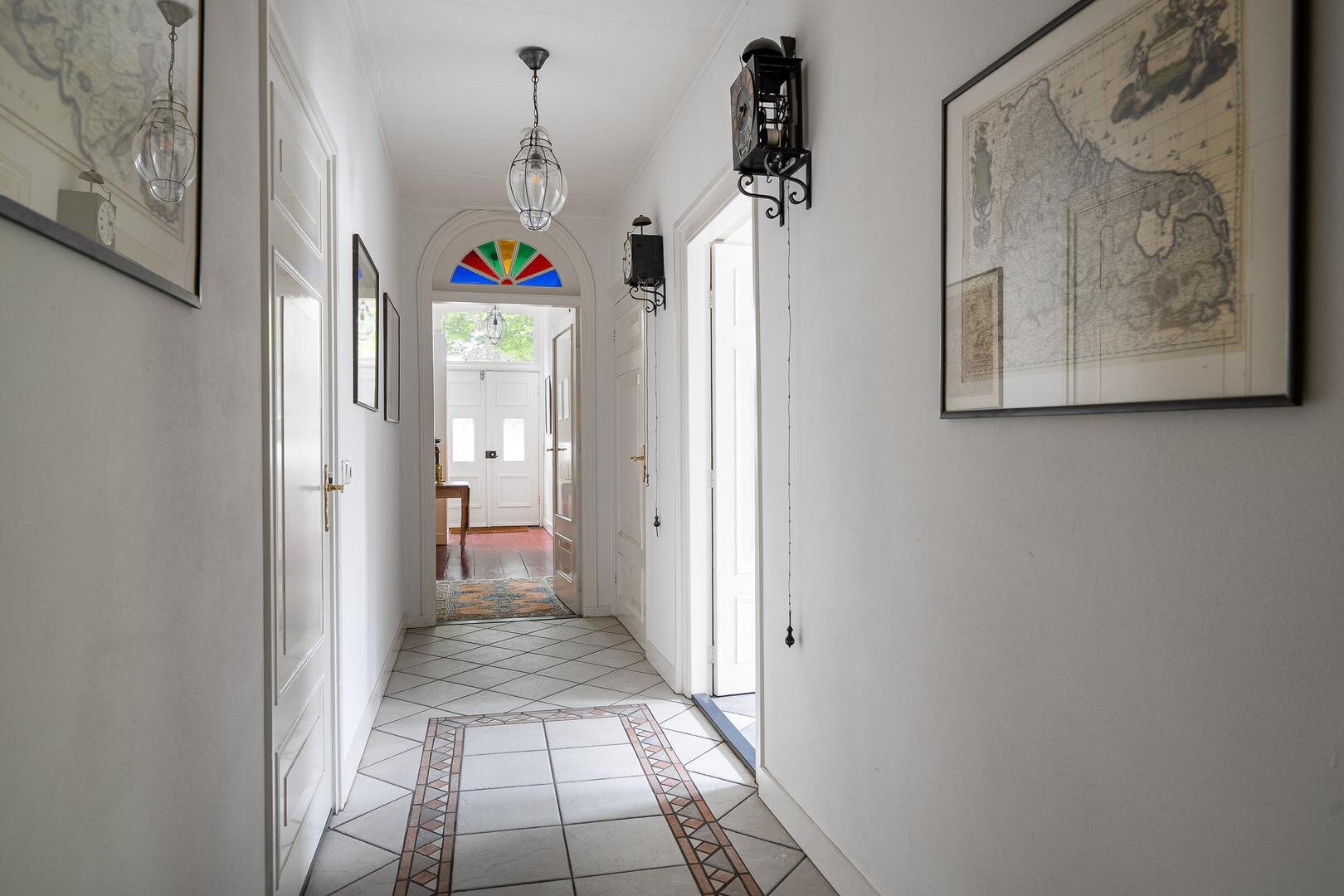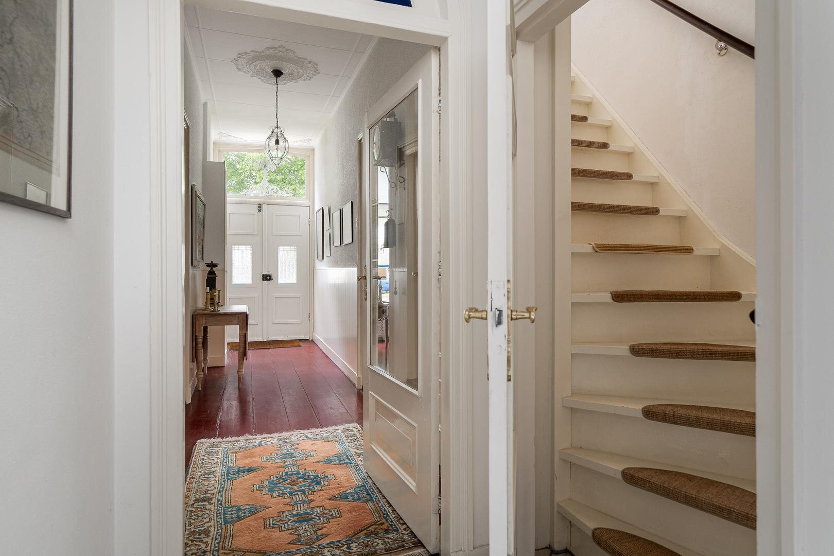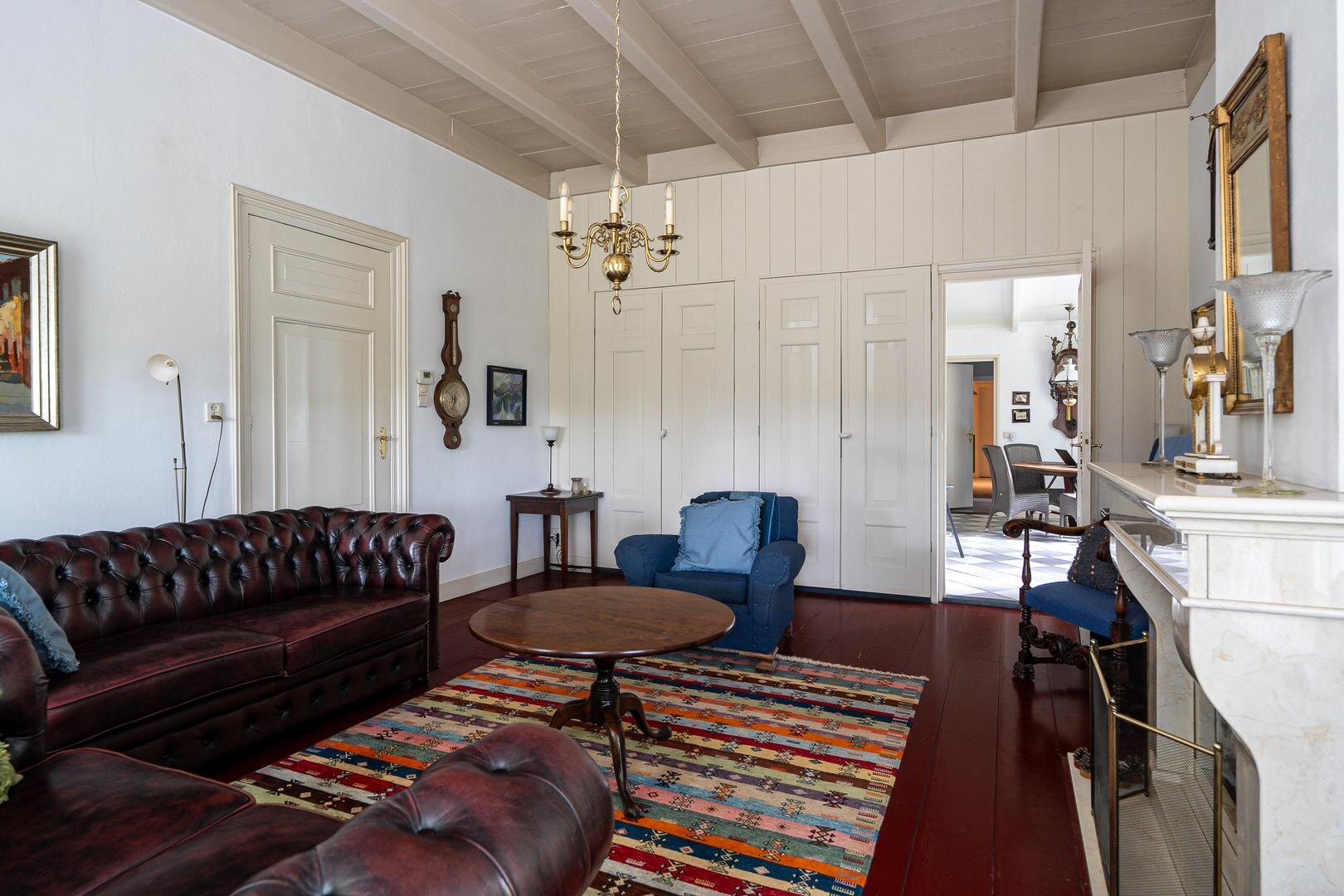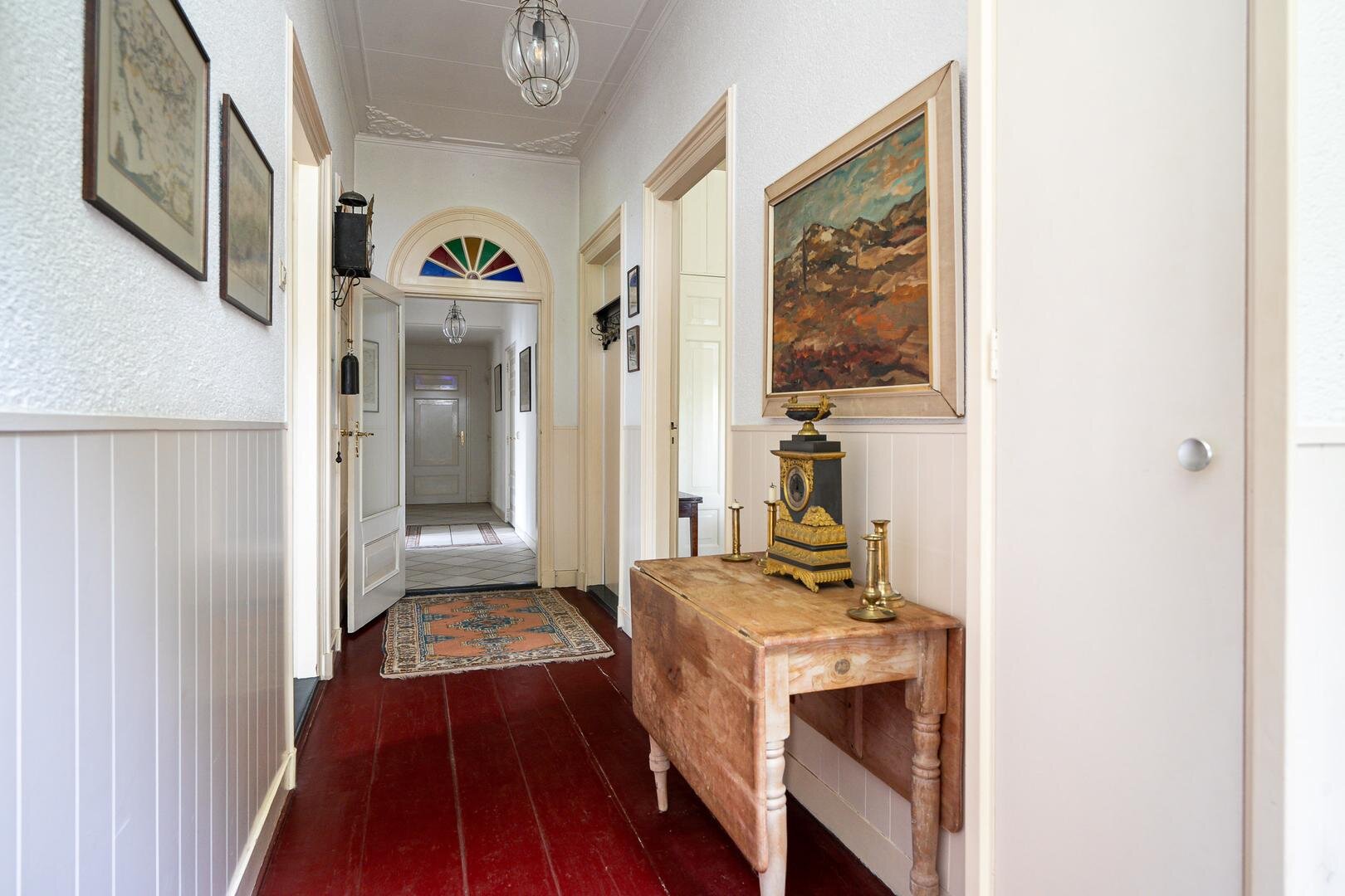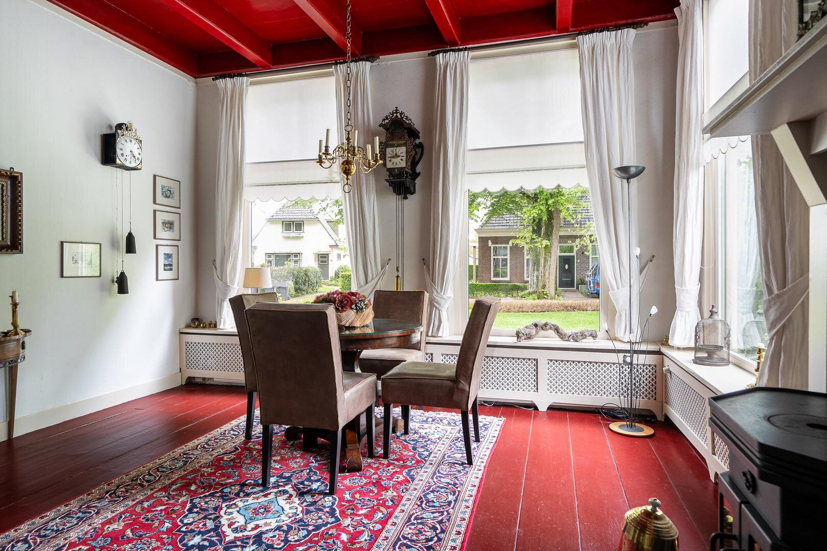 Zoals gebruikelijk is hier de entree aan de zijkant, maar voor de beschrijving beginnen we met de statige entree aan de voorzijde van de woning. U komt binnen in de royale hal en wat hier direct opvalt is de authentieke sfeer en hoogte van de plafonds. Aan weerzijden bevindt zich een woonkamer met prachtige balkenplafonds, waarbij één woonkamer beschikt over een houtkachel en de andere beschikt over een sfeervolle openhaard. Beide kamers hebben prettig uitzicht over de rustige straat, waar alleen bestemmingsverkeer langsrijdt. De woonkeuken is toegankelijk vanuit de gang en vanuit de woonkamer en beschikt over diverse inbouwapparatuur o.a. magnetron, oven, groot gasfornuis, vaatwasser en koelkast. Aan de andere zijde van de gang vindt u de royale bijkeuken met vaste kasten en de aansluiting voor het witgoed en de vrieskist. Wanneer we verder gaan door de gang, komen we langs de toiletruimte met fontein en een separaat urinoir. Er achter is de zeer ruime badkamer met jacuzzi, infraroodcabine, douche, toilet en twee wastafels. Daarna volgt de kantoorruimte, hier is voldoende ruimte voor verschillende werkplekken en de ruimte heeft een prettige lichtinval door de vele raampartijen en de loopdeur naar de tuin. De masterbedroom is zeer royaal te noemen, tevens is er een kleine logeerkamer aanwezig op de begane grond.
