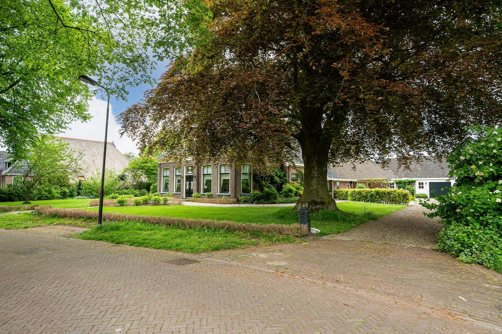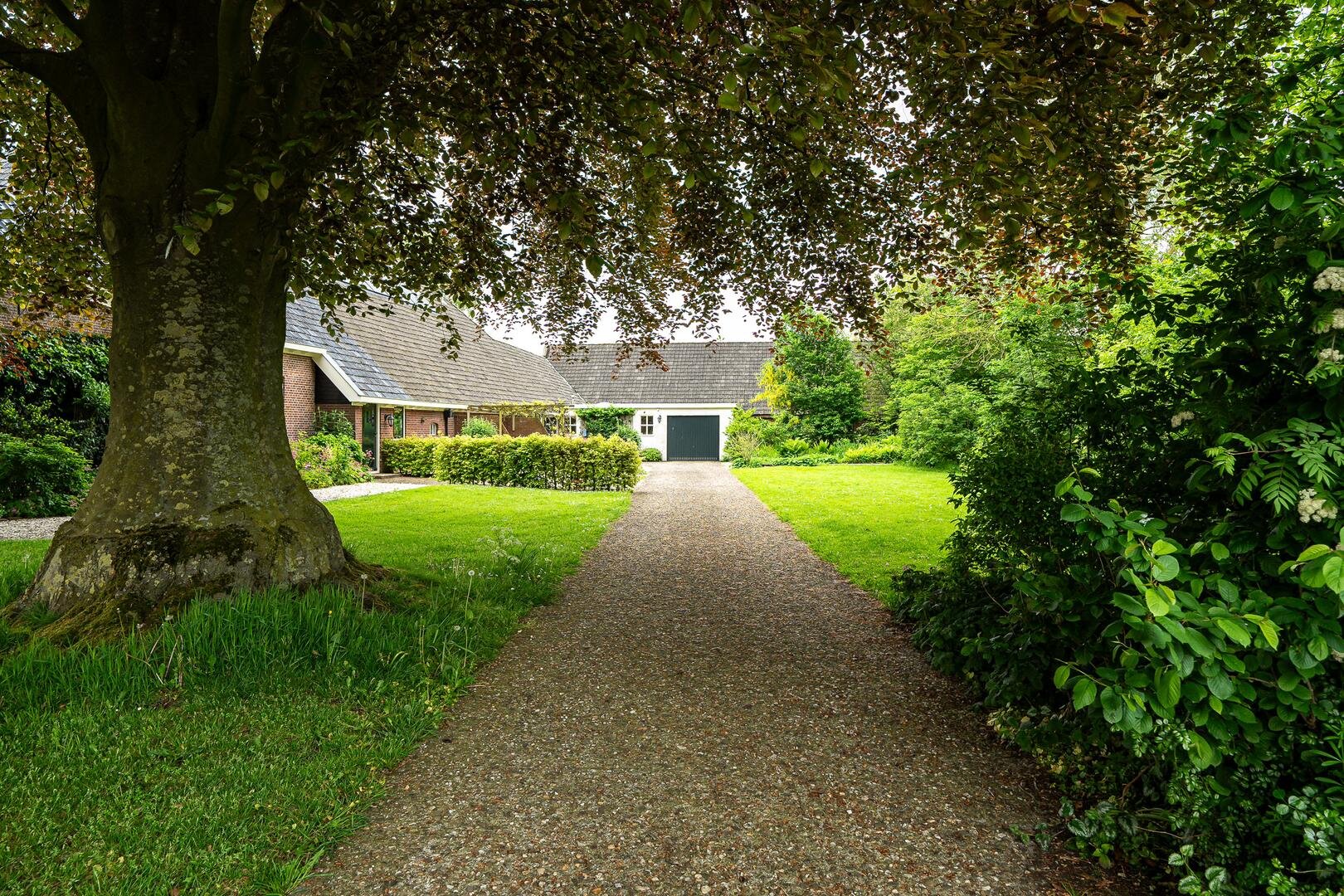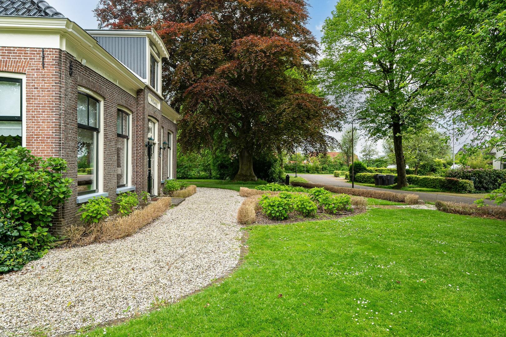 Wat opvalt aan de voorzijde van de woning is de prachtige bomenrij in de straat met in de tuin de beukenboom aan de zijkant van de oprit. Op de oprit is voldoende ruimte voor meer auto's.