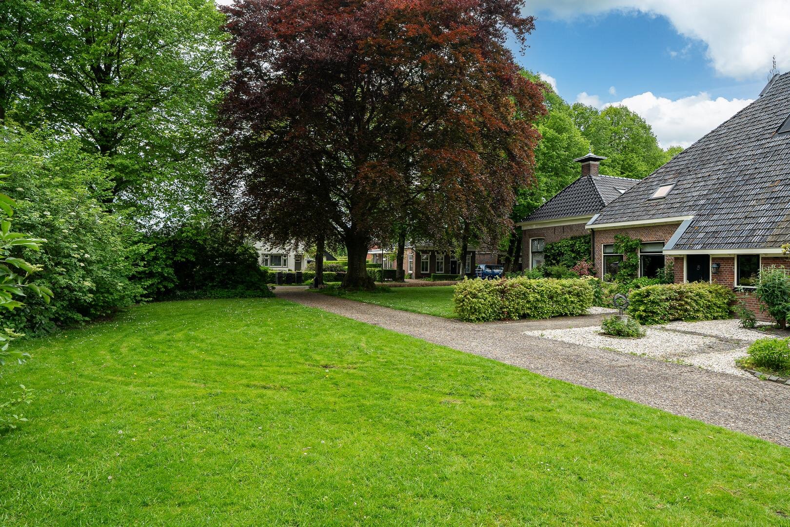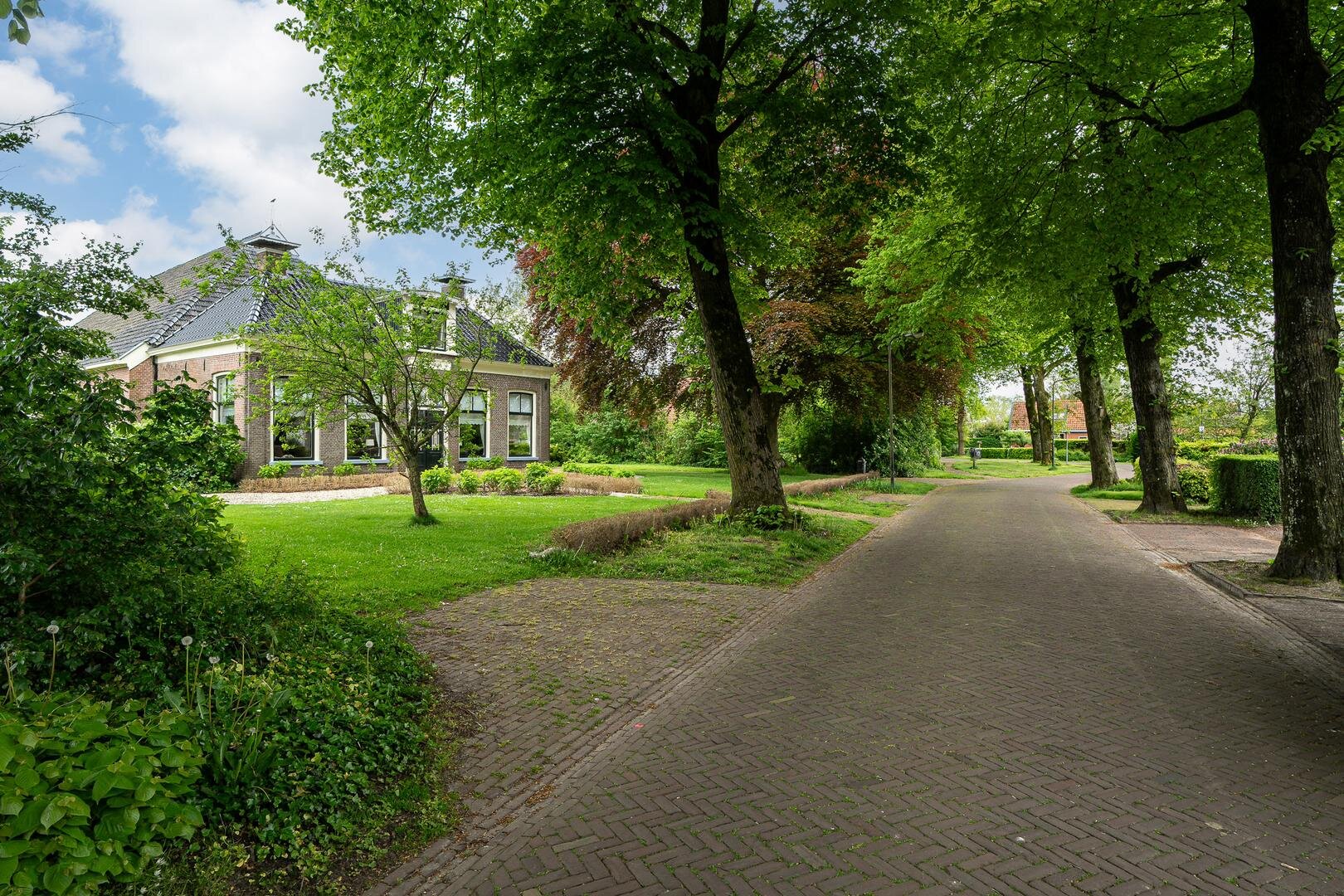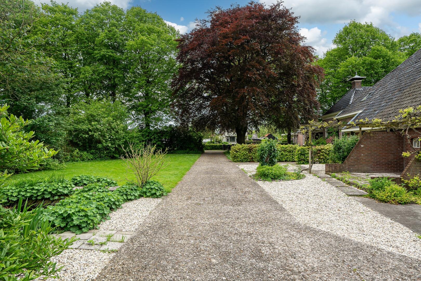 Wat opvalt aan de voorzijde van de woning is de prachtige bomenrij in de straat met in de tuin de beukenboom aan de zijkant van de oprit. Op de oprit is voldoende ruimte voor meer auto's.