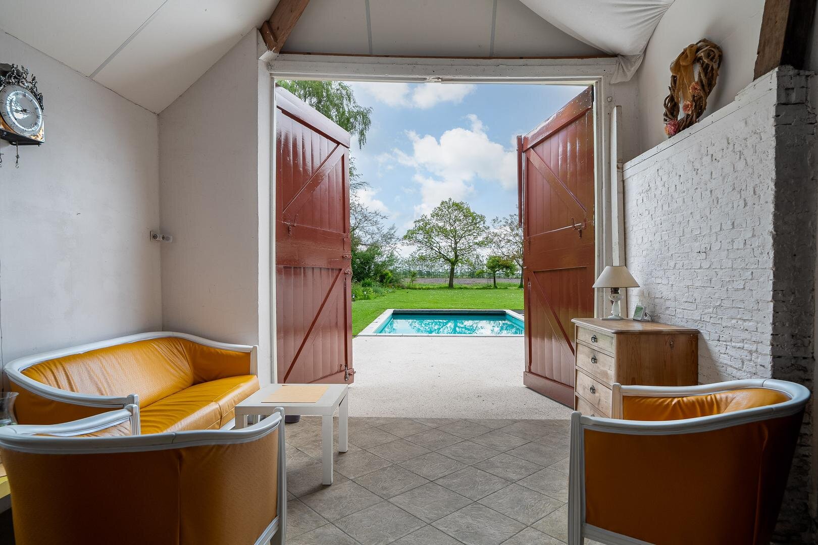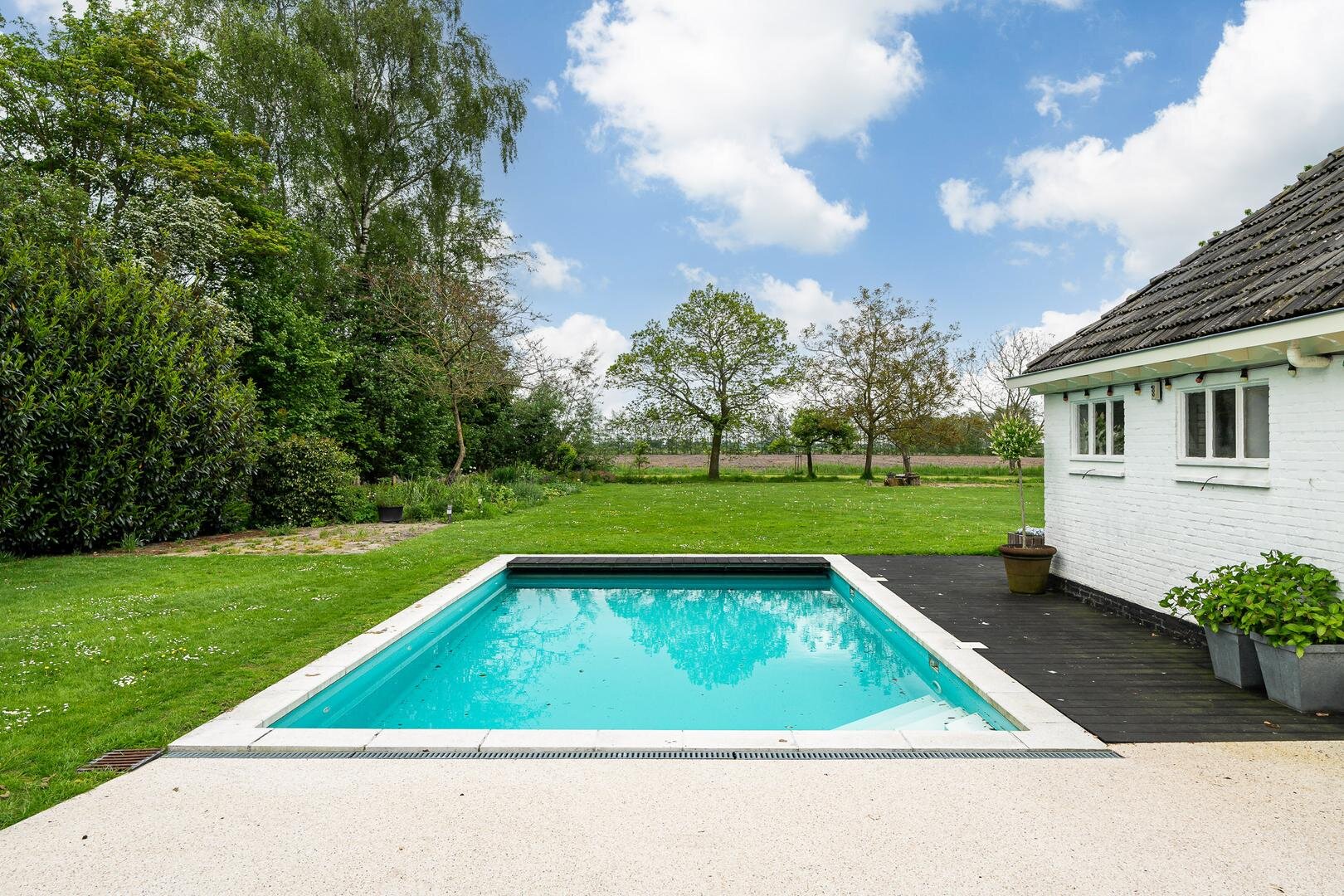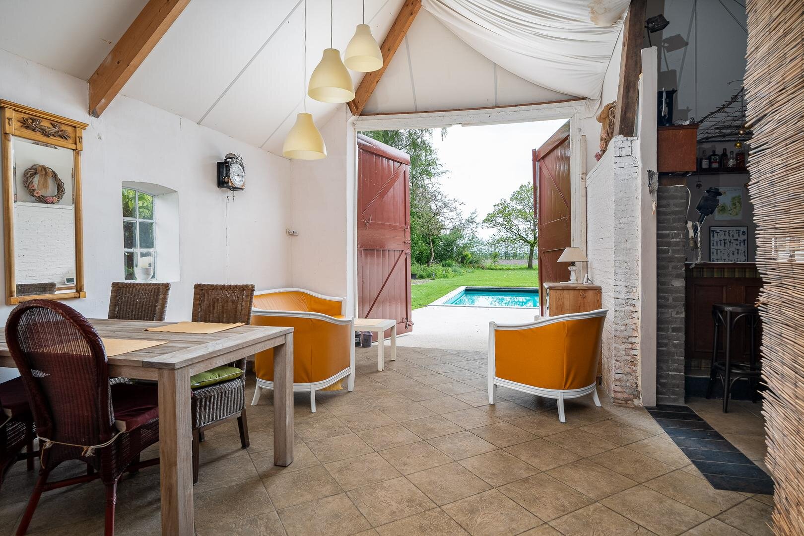 Aan de achterzijde is er een tuinkamer met openslaande deuren. Aansluitend vindt u een zwembad en een bar, dit is een ideale ruimte voor feesten en partijen, maar ook om zelf 's avonds nog even heerlijk te zitten en te genieten van de tuin met verlichting.
