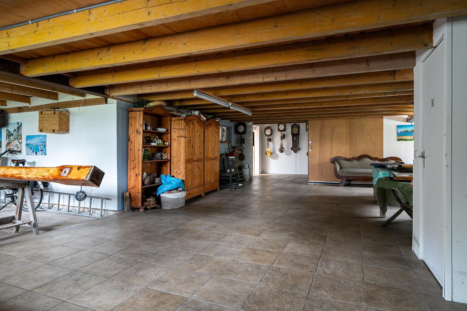 Aan de voorzijde is een aangebouwde garage geschikt voor één auto, daarnaast zit een royale berging. Aan de achterzijde is een zeer grote ruimte die gebruikt kan worden als opslag of klusruimte. Verder is hier een toilet, aanrechtblok met spoelbak en de technische installatie voor het zwembad aanwezig.