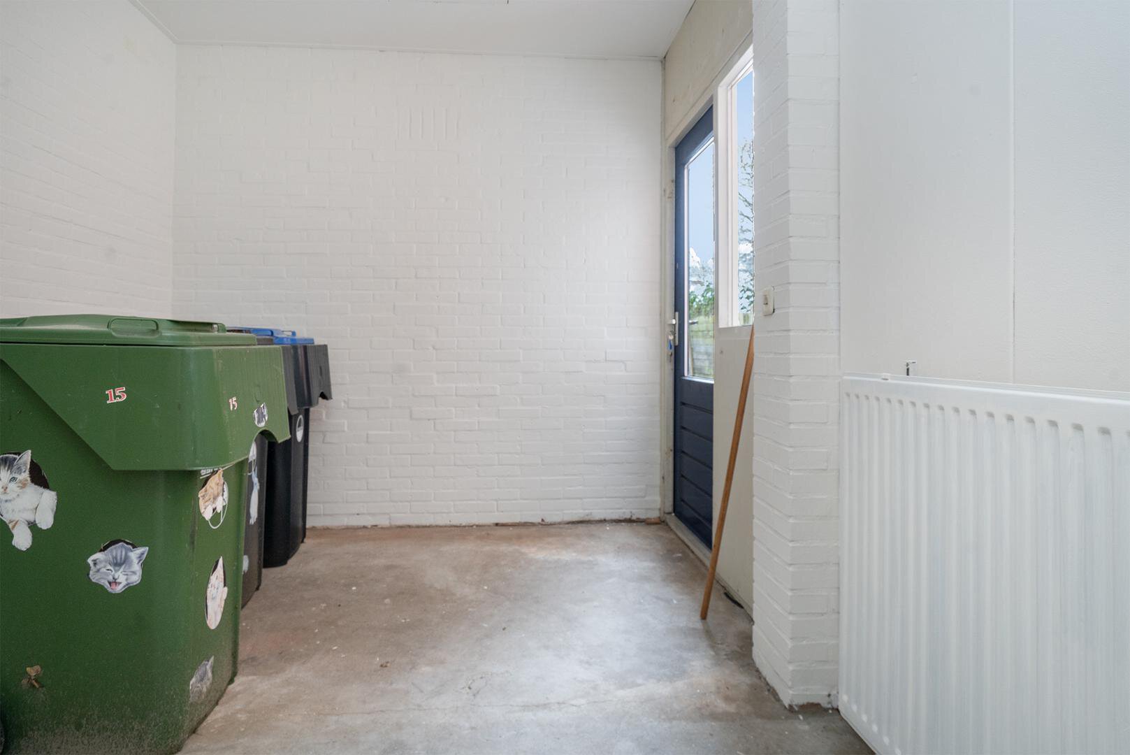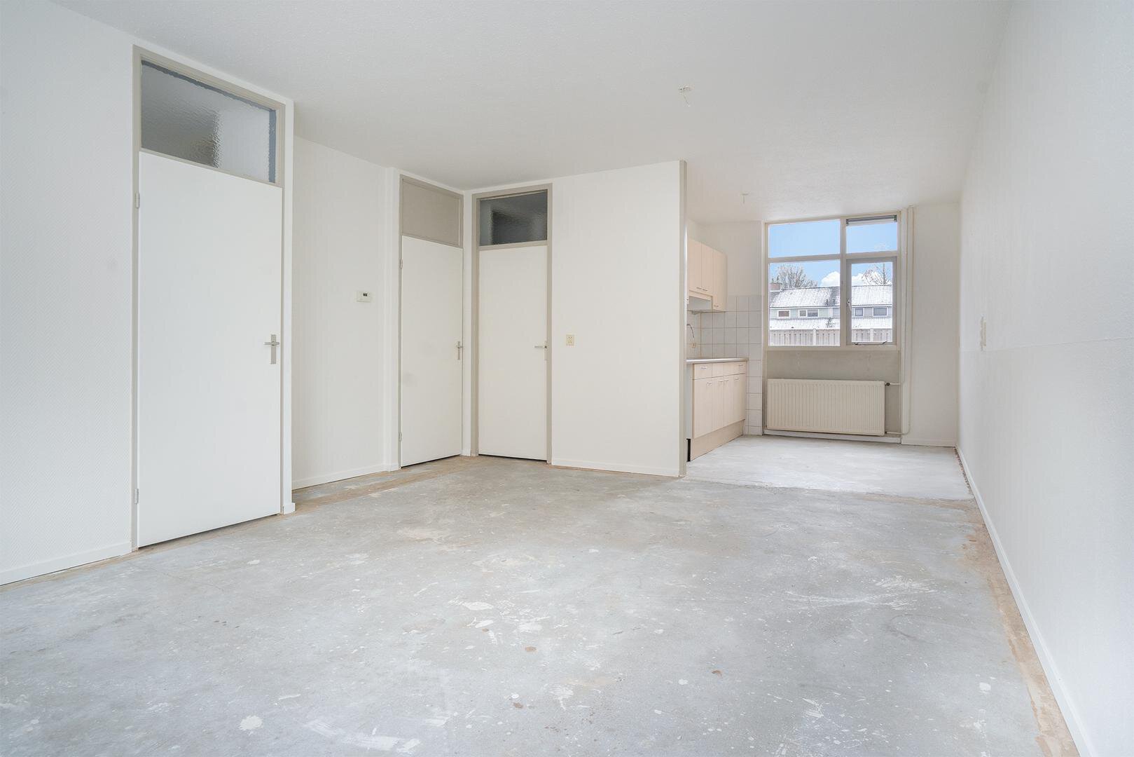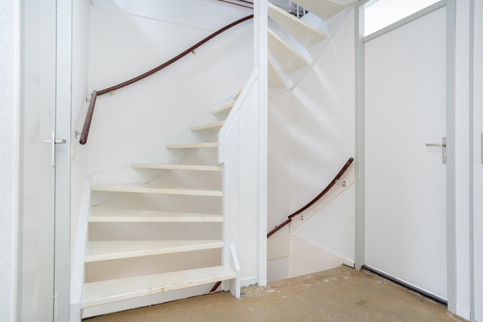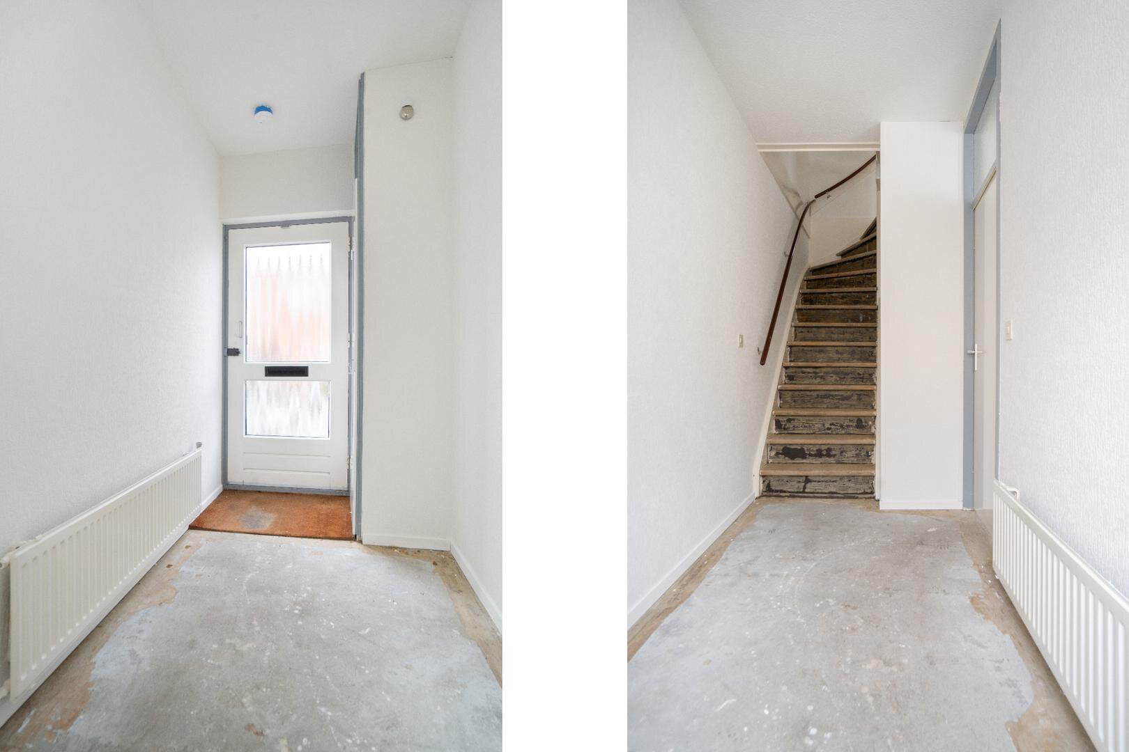 De entree aan de voorzijde geeft toegang tot de ruime hal met trapopgang en meterkast. De royale woonkamer aan de voorzijde is door de grote raampartijen een licht geheel. De open keuken aan de achterzijde beschikt over een eenvoudig keukenblok, hier zou je eventueel openslaande deuren kunnen plaatsen zodat je vanuit de keuken de tuin in kan lopen. Er is in het midden van de woning nog een hal waar zich de toiletruimte en doorgang naar de bijkeuken/berging bevindt. In de bijkeuken zit nog een vlizotrap naar de bergzolder.