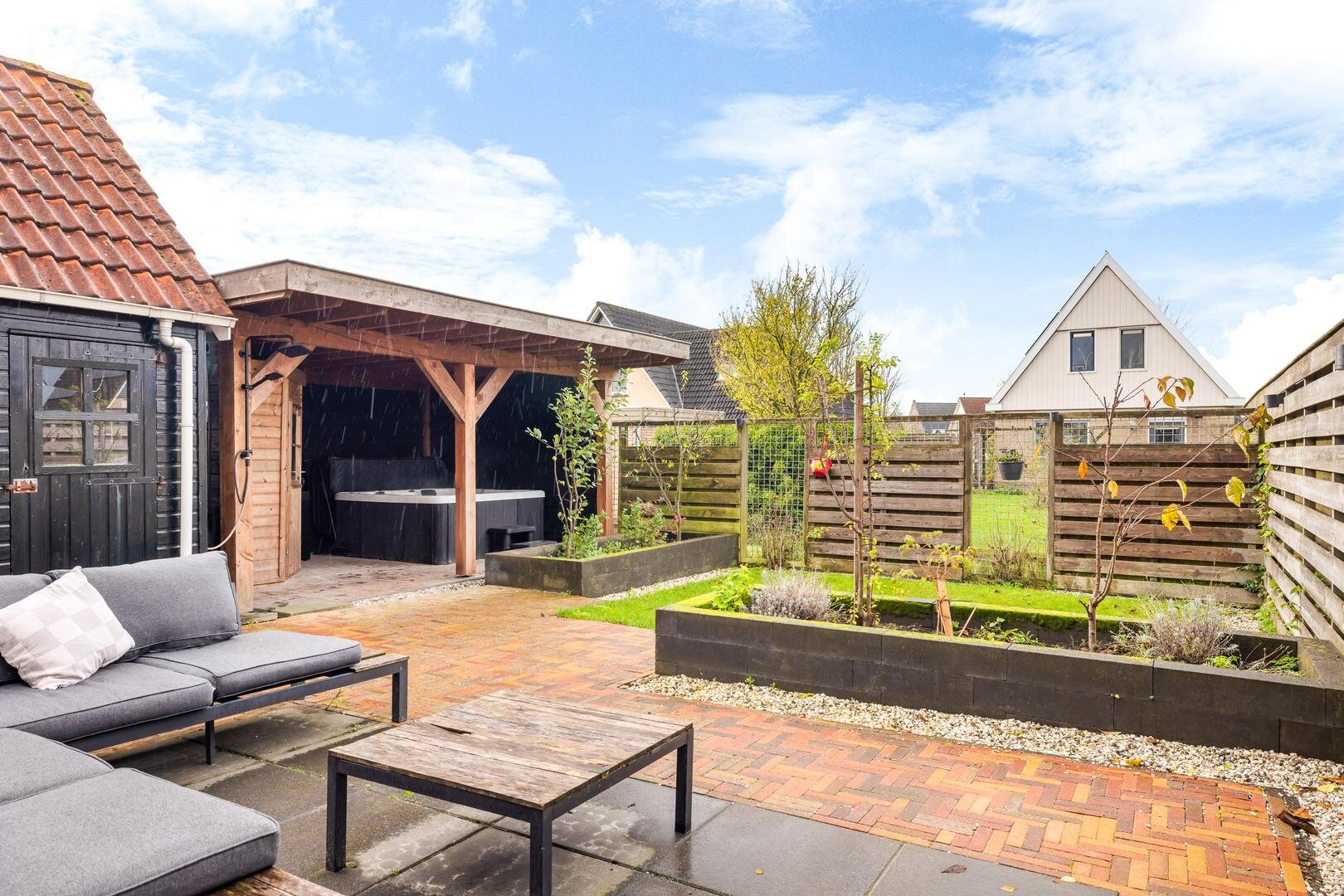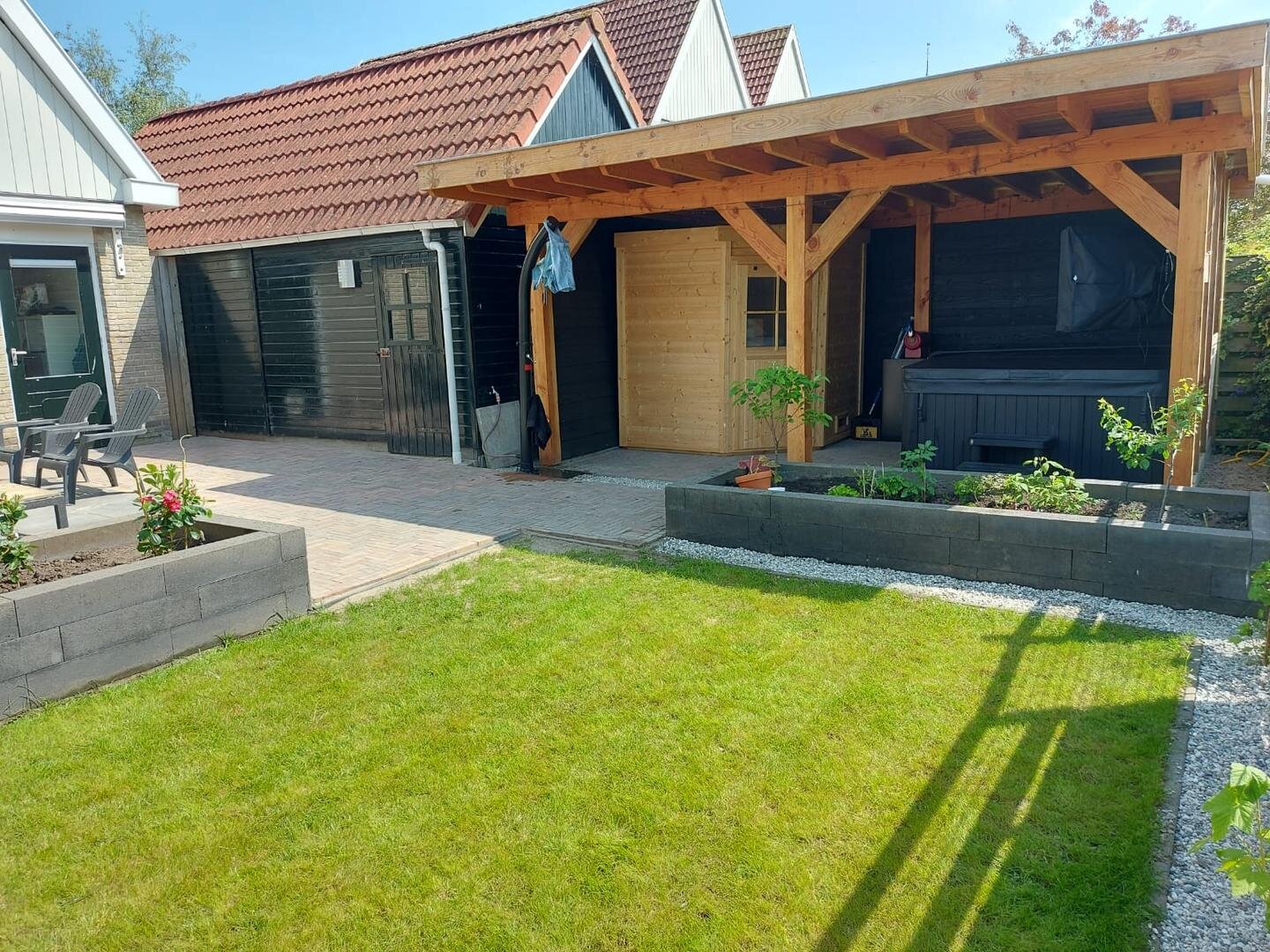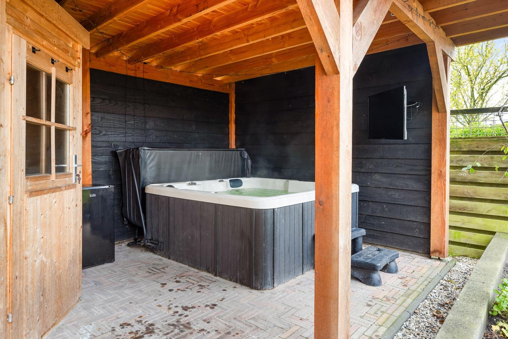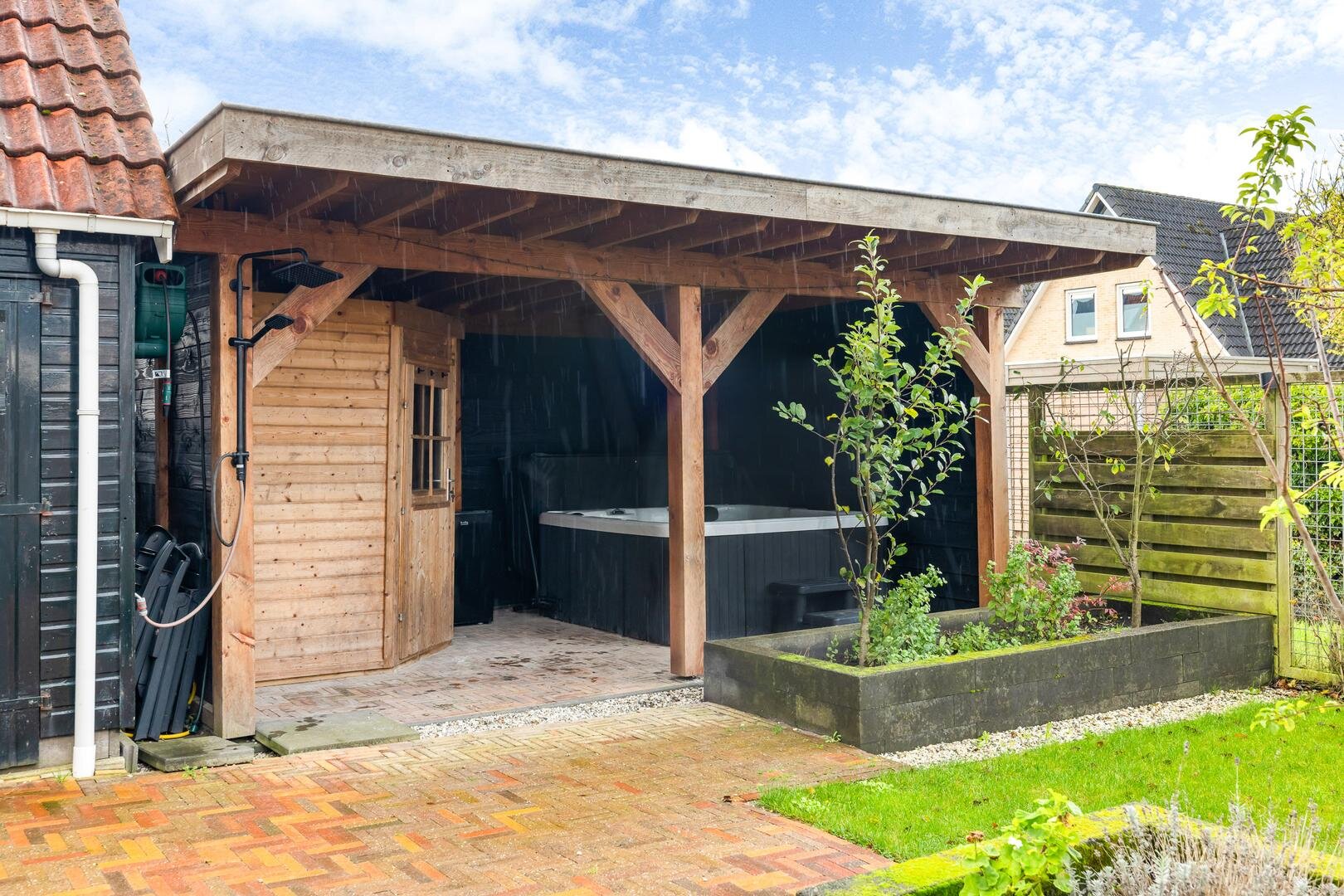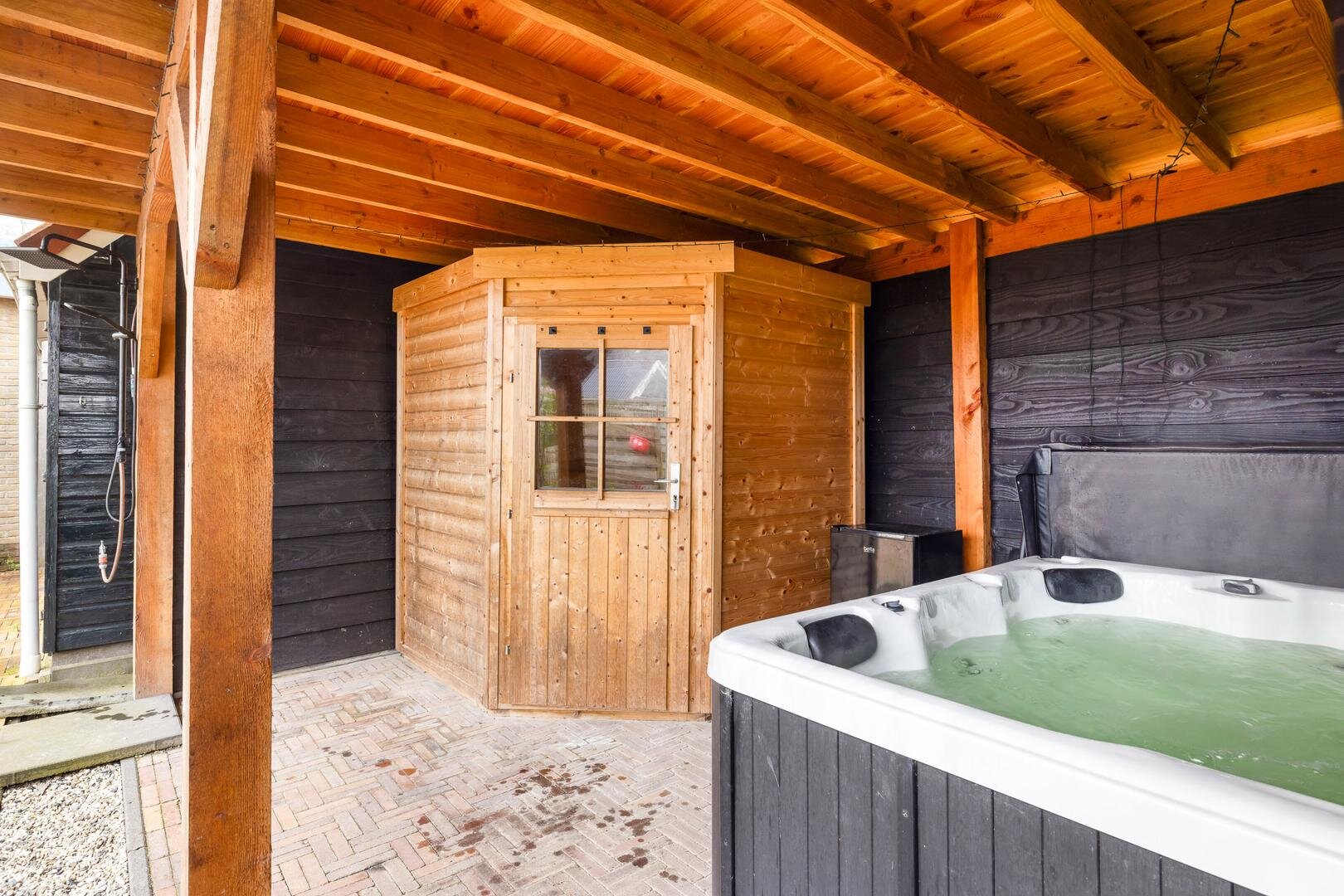 Achterin de tuin vind je een royale overkapping uit 2022, uitgerust met een jacuzzi, netwerkkabels en een sauna met kachel. Er is tevens een buitendouche aanwezig.