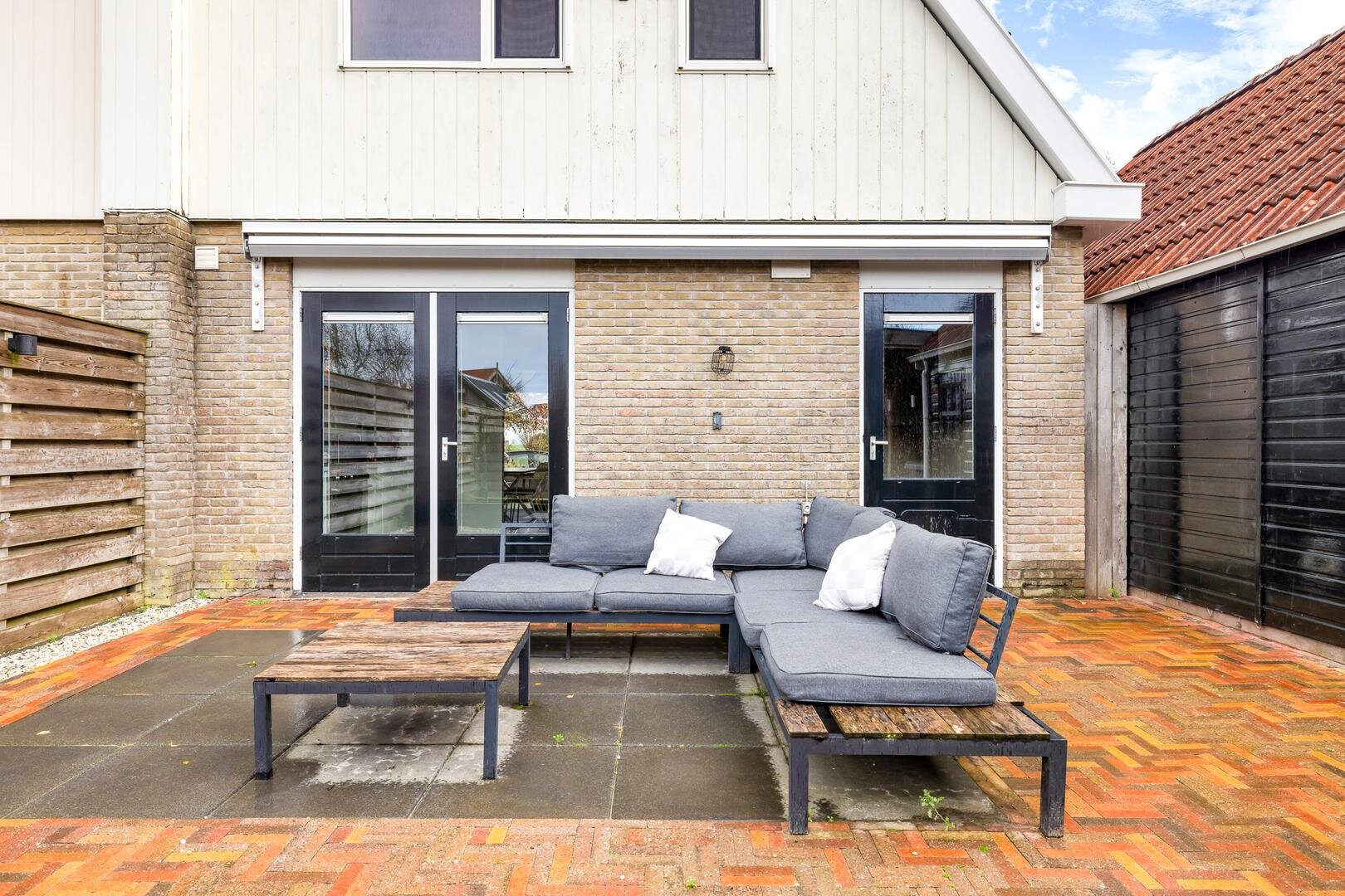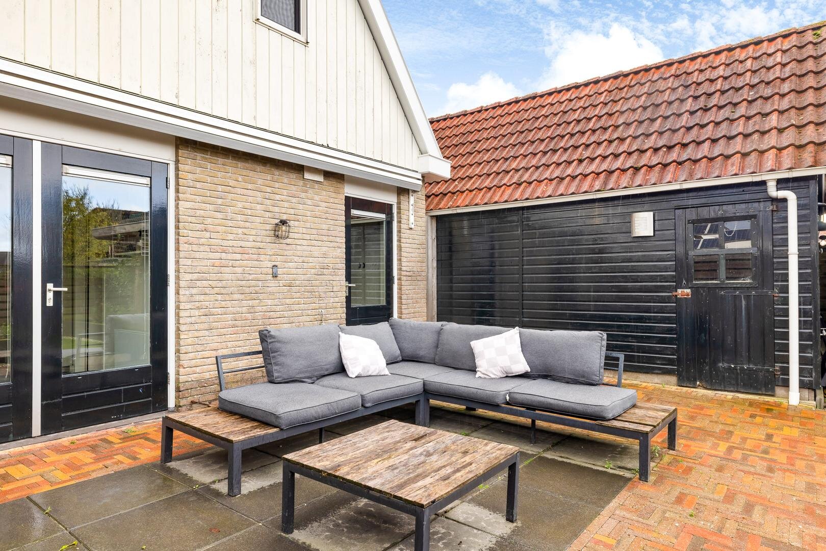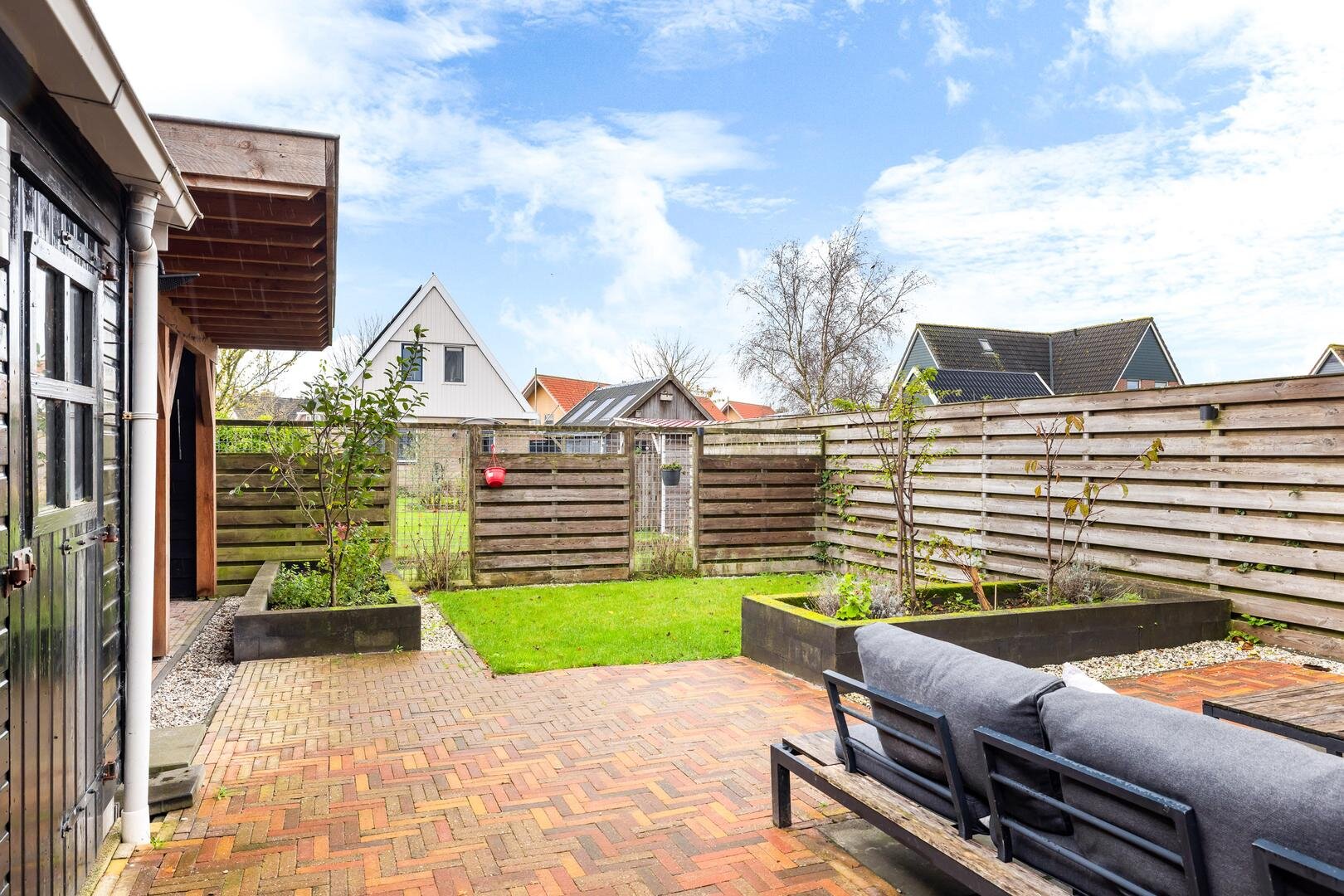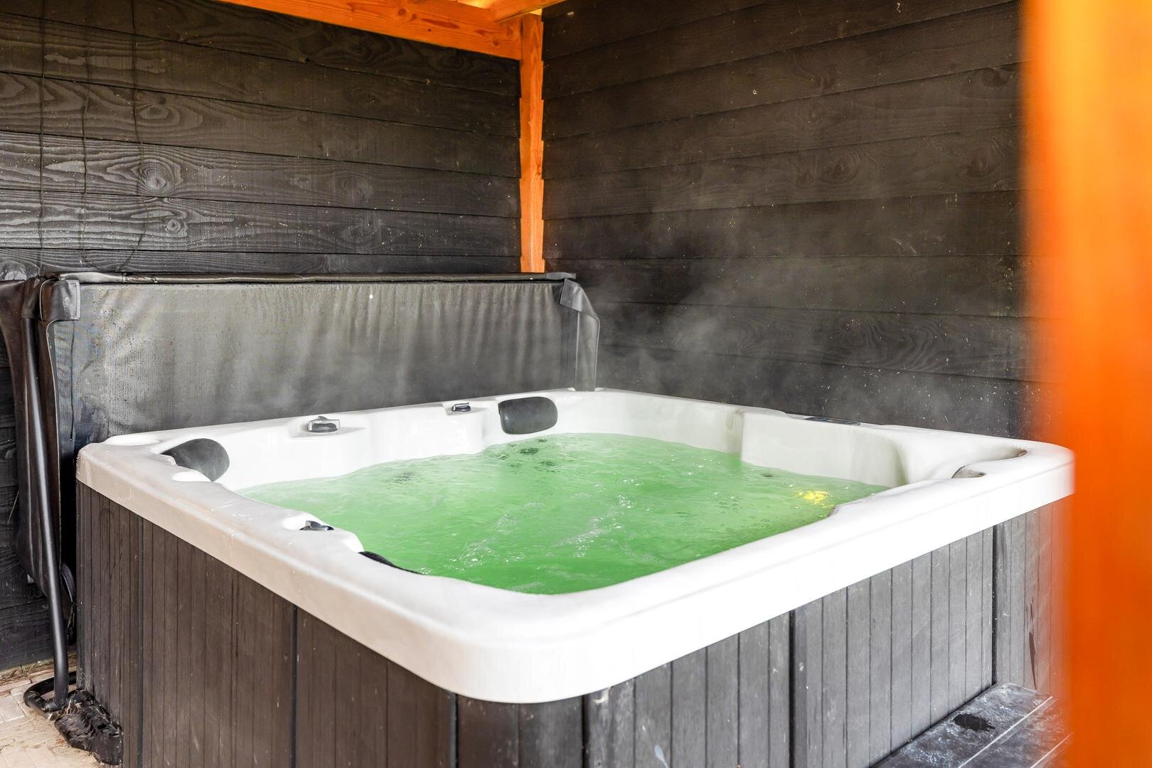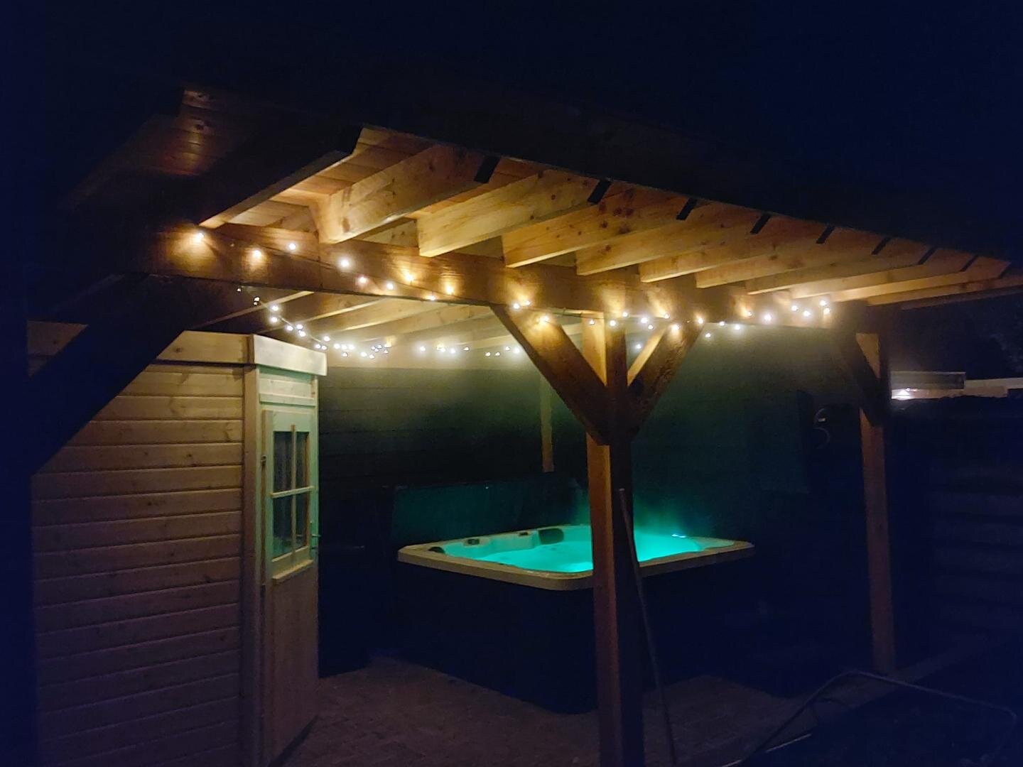 Achterin de tuin vind je een royale overkapping uit 2022, uitgerust met een jacuzzi, netwerkkabels en een sauna met kachel. Er is tevens een buitendouche aanwezig.