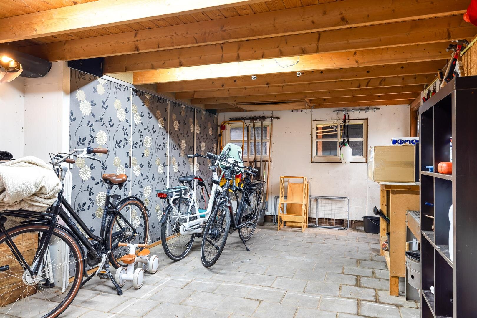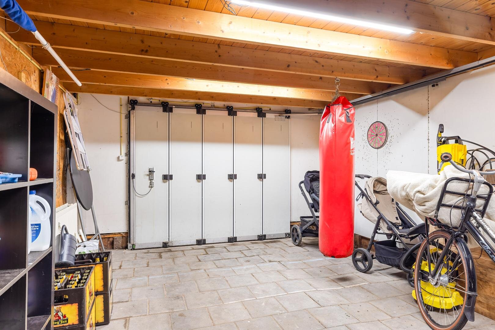 De garage is volledig geïsoleerd en voorzien van verwarming. De elektrische garagedeur opent zijwaarts en bovenin bevindt zich een grote, droge vliering.