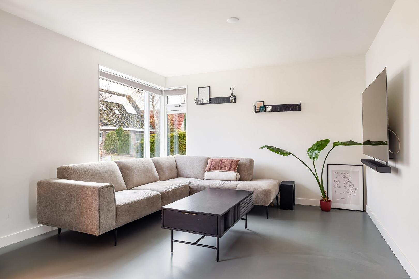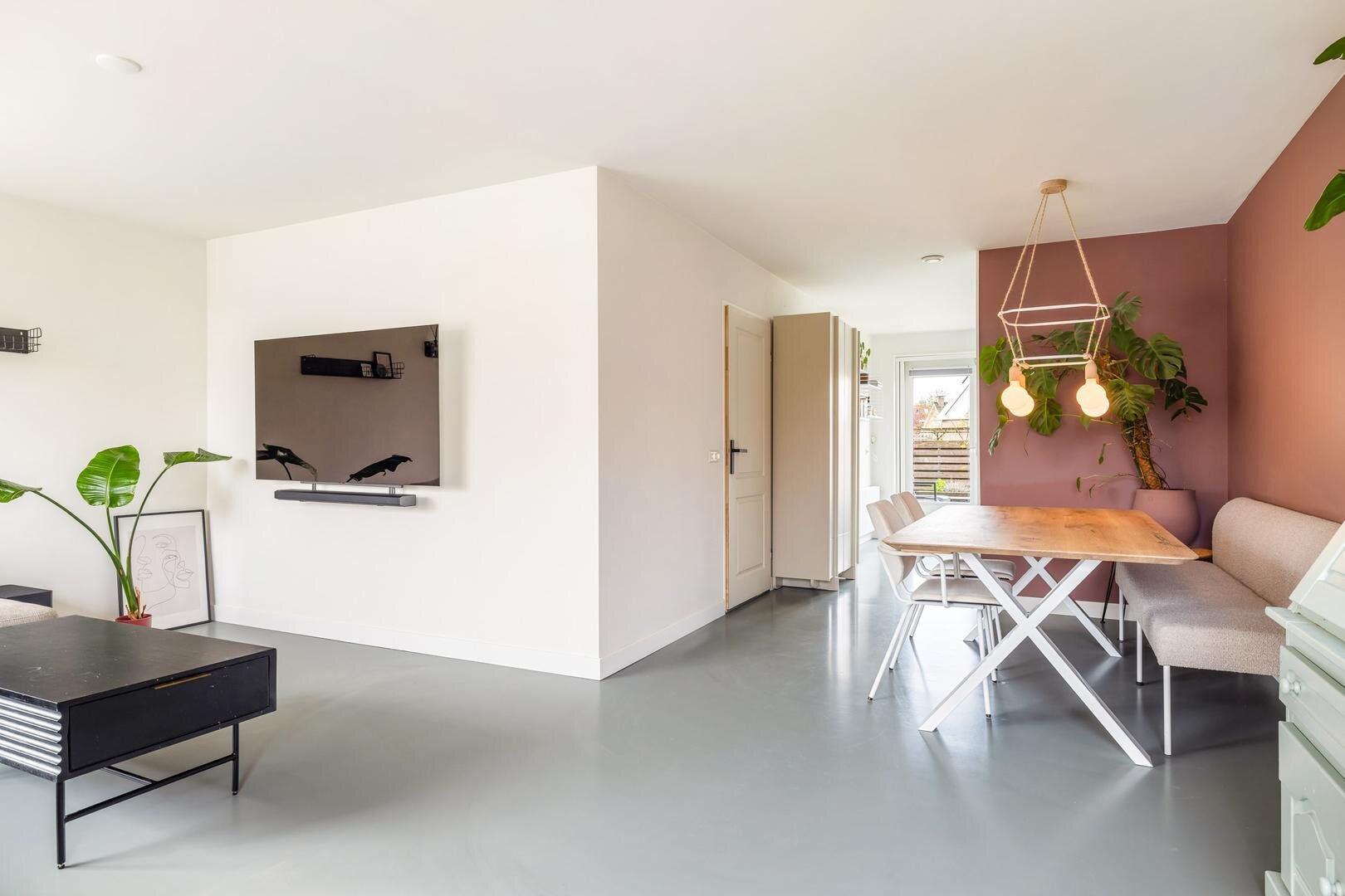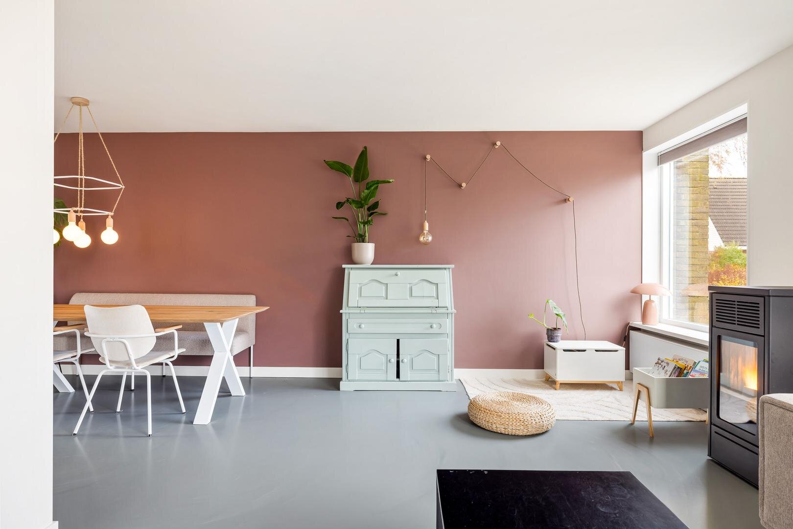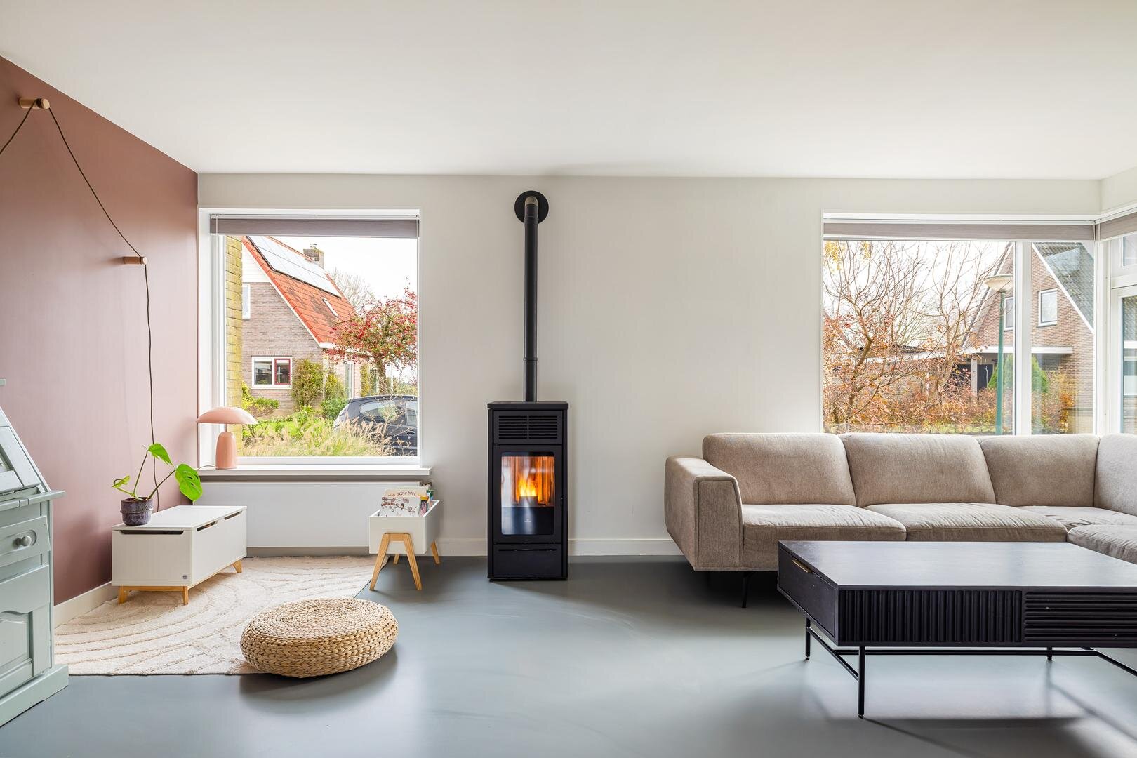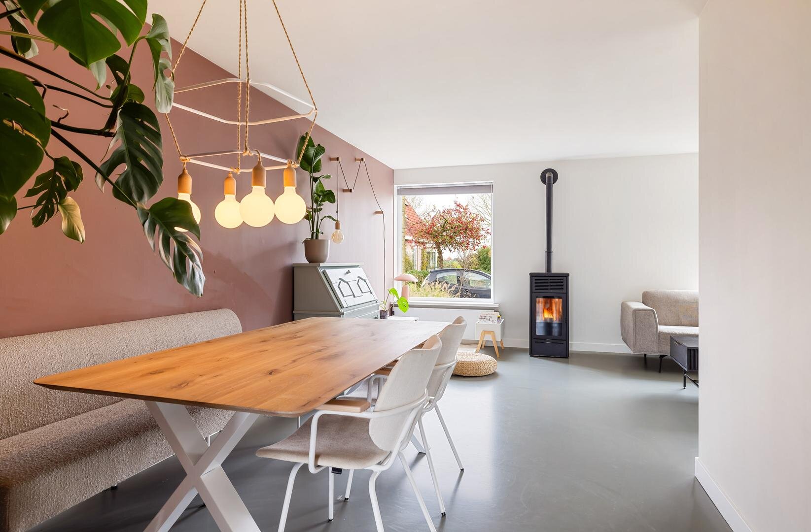 De woonkamer is in 2022 voorzien van een palletkachel en biedt daardoor een aangename en energiezuinige warmtebron.