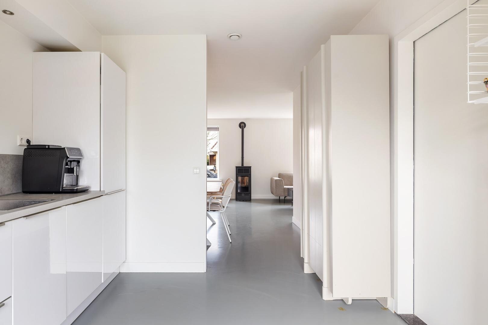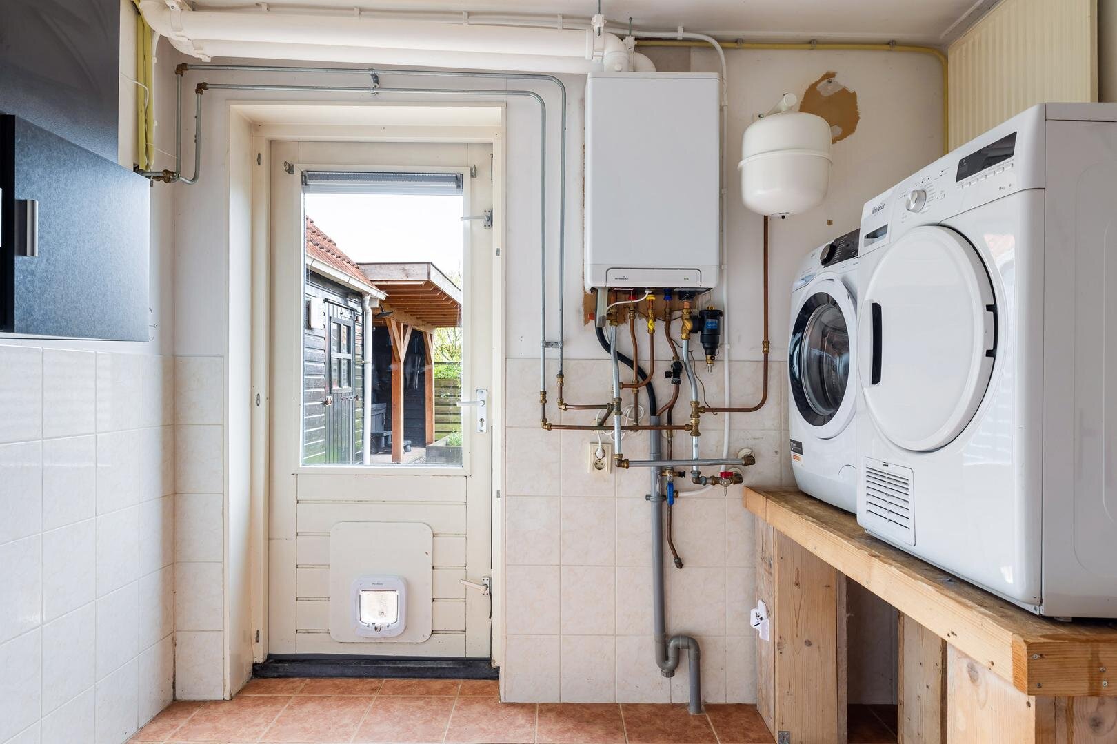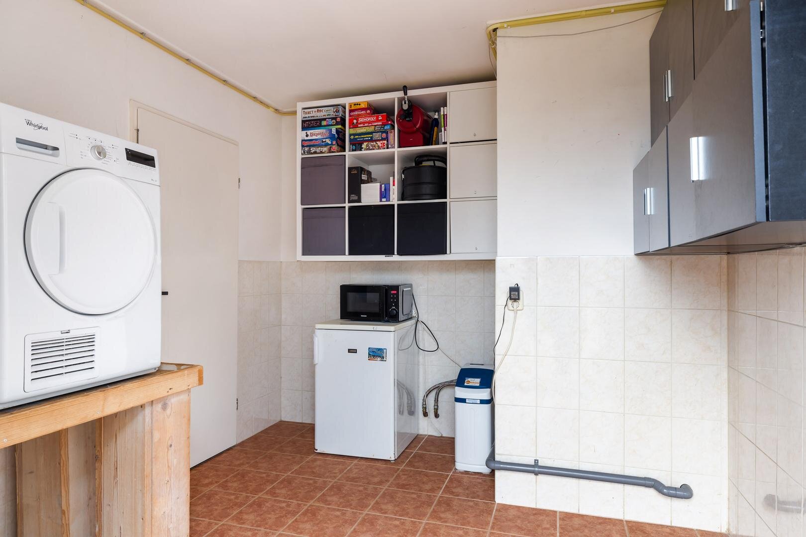 Aangrenzend bevindt zich de praktische bijkeuken met aansluitingen voor witgoed, een waterontharder en de Intergas cv-ketel uit 2021.
