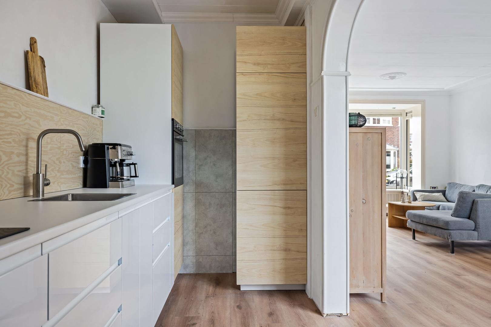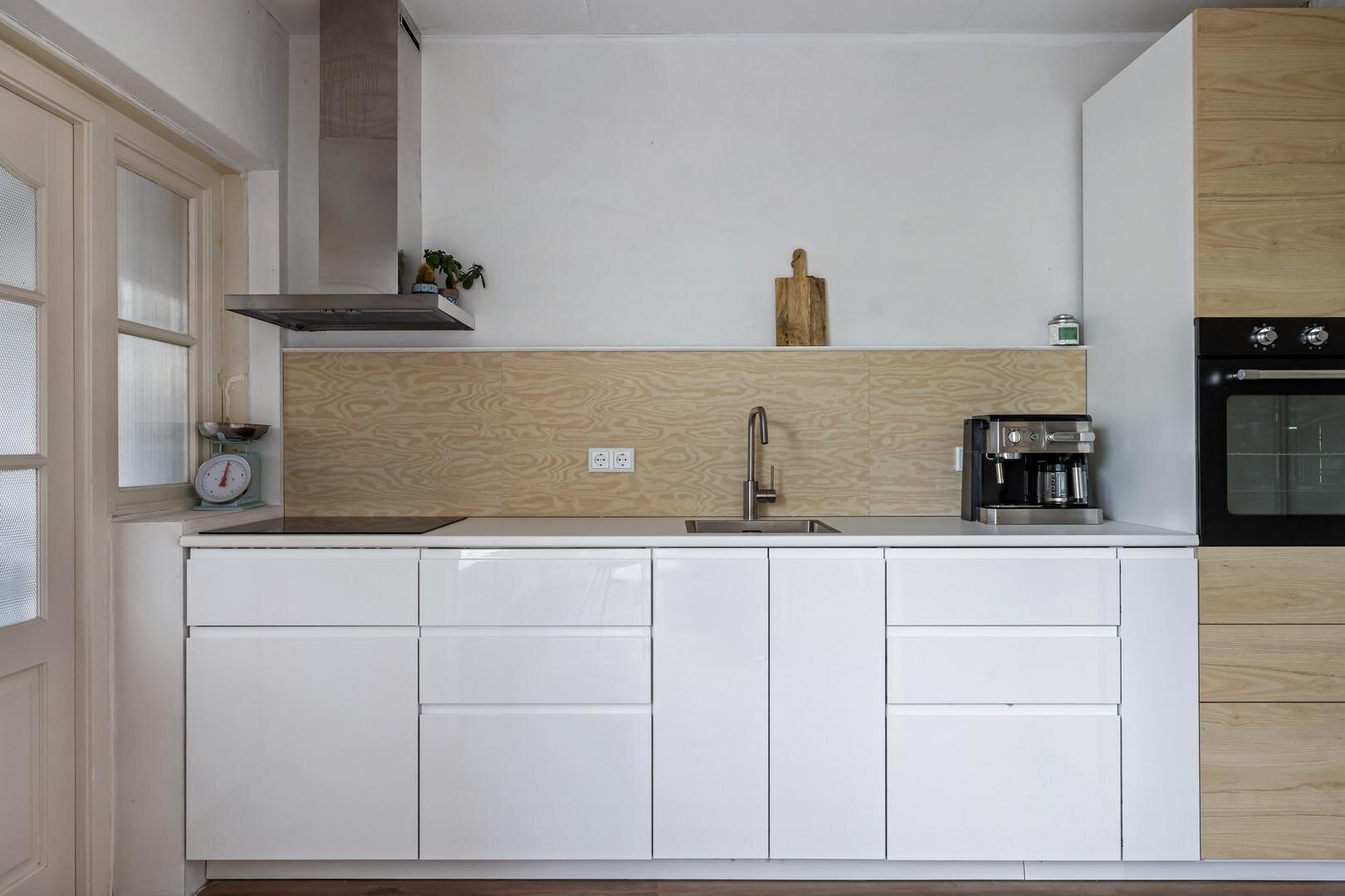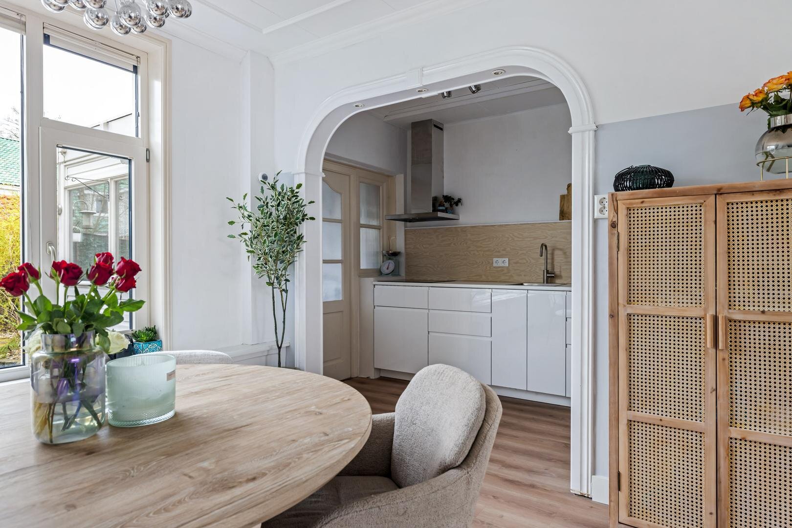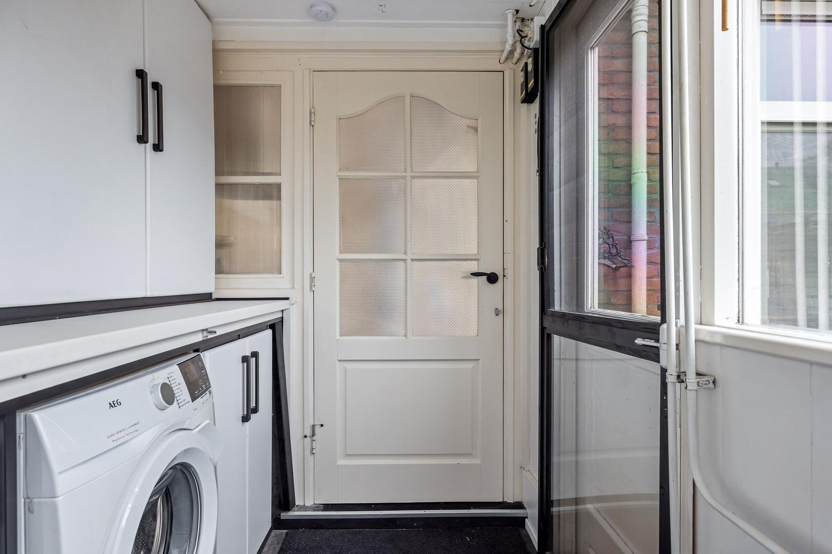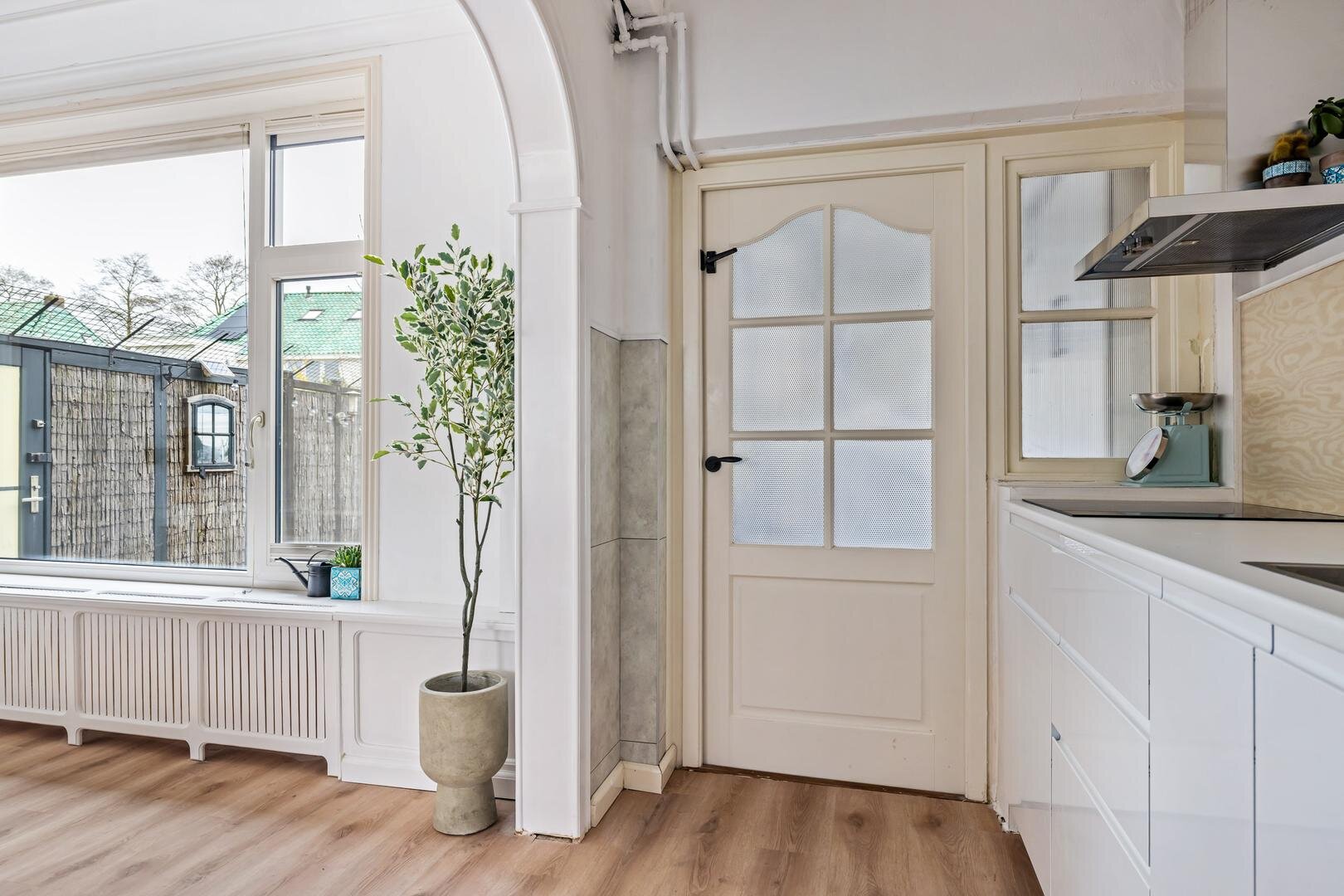 Aan de achterzijde bevindt zich de keuken, die praktisch is ingericht en in directe verbinding staat met de leefruimte. Aansluitend vind je de bijkeuken, een waardevolle extra ruimte die ideaal is voor extra opslag. Vanuit de bijkeuken heb je toegang tot de achtertuin.