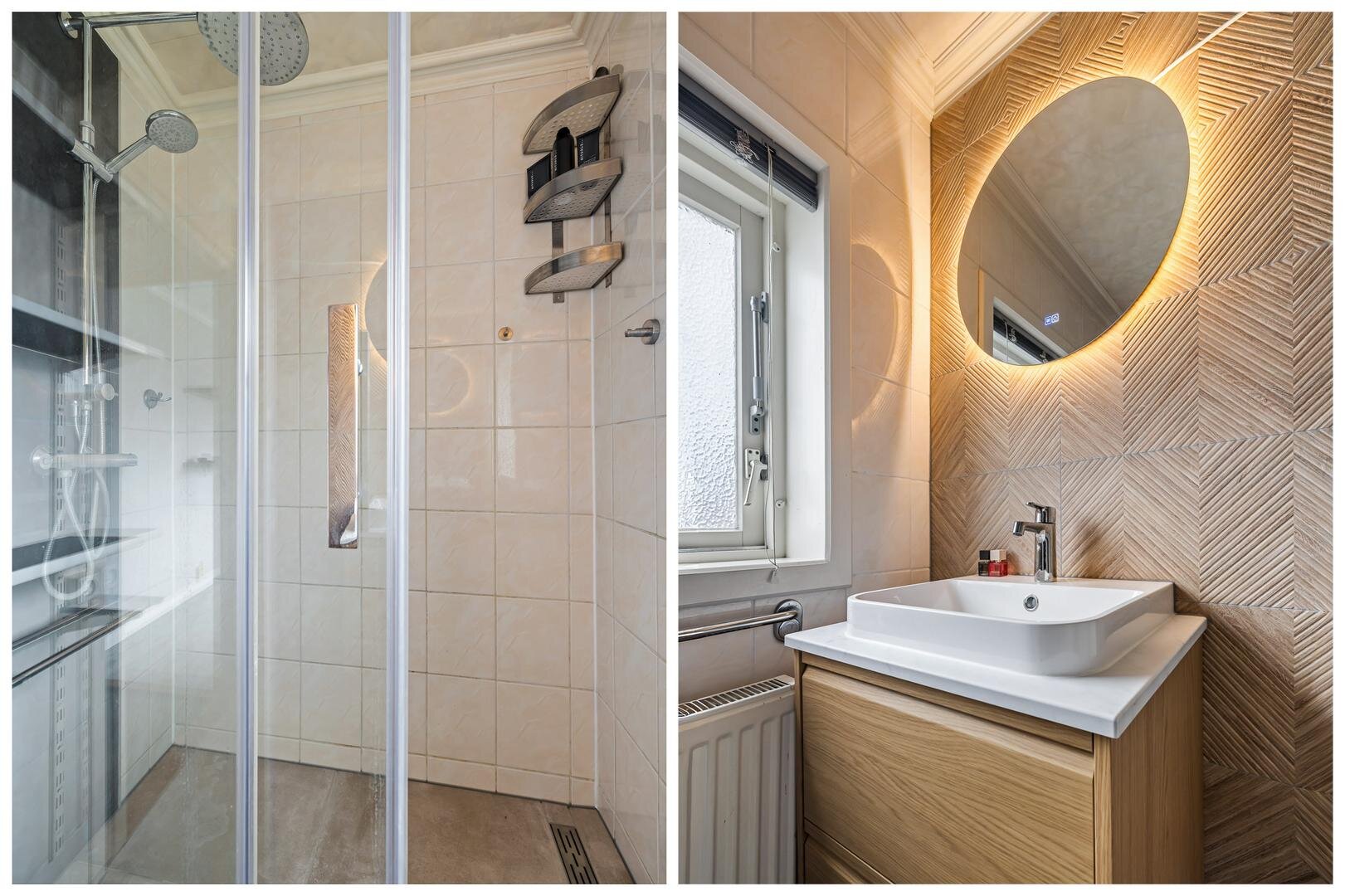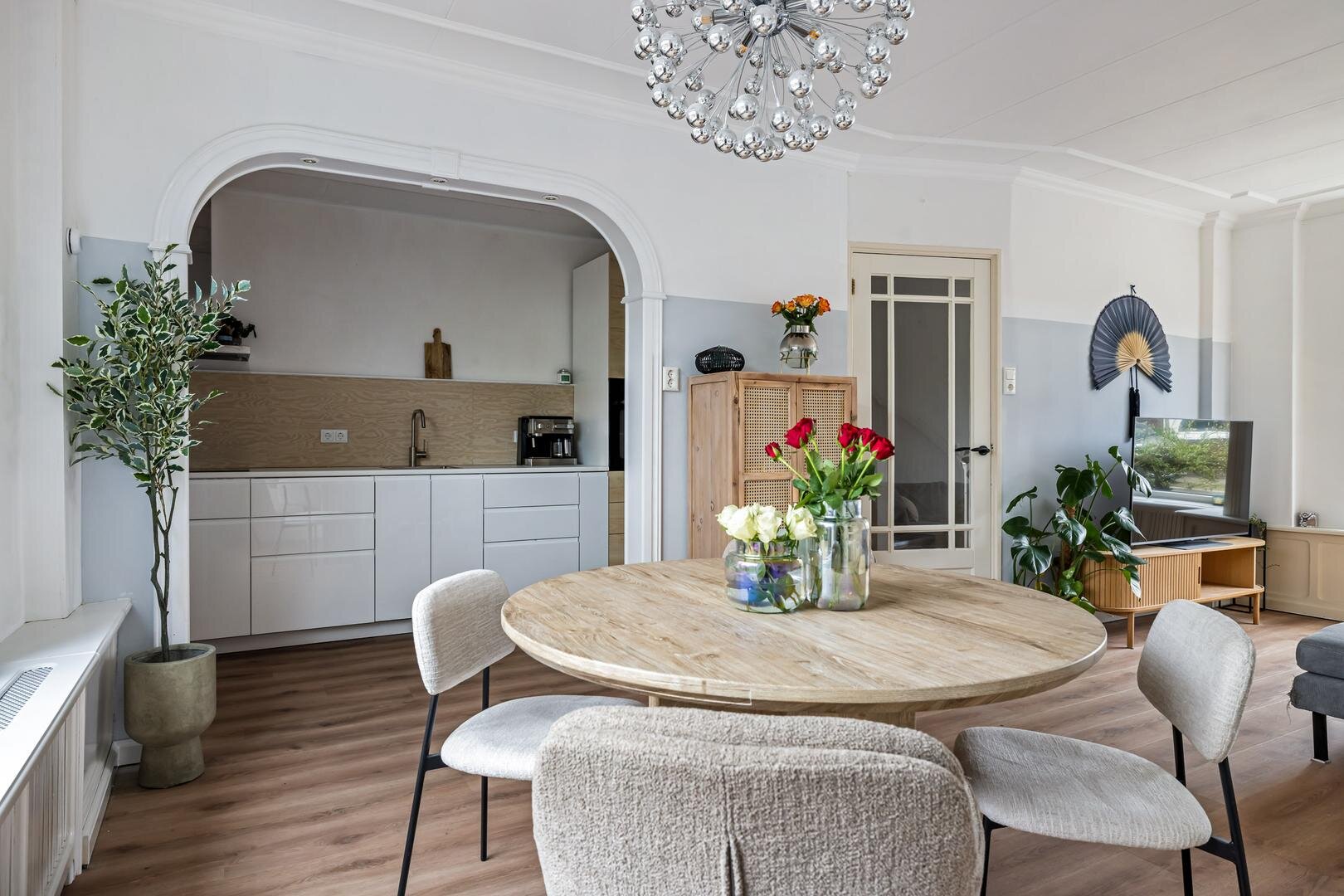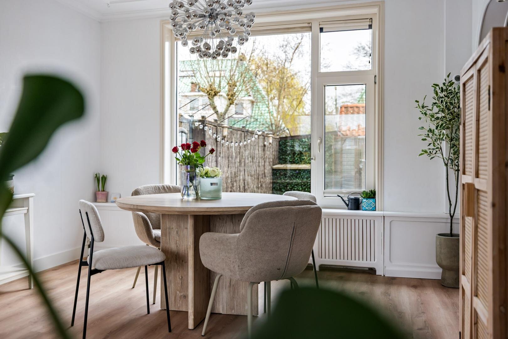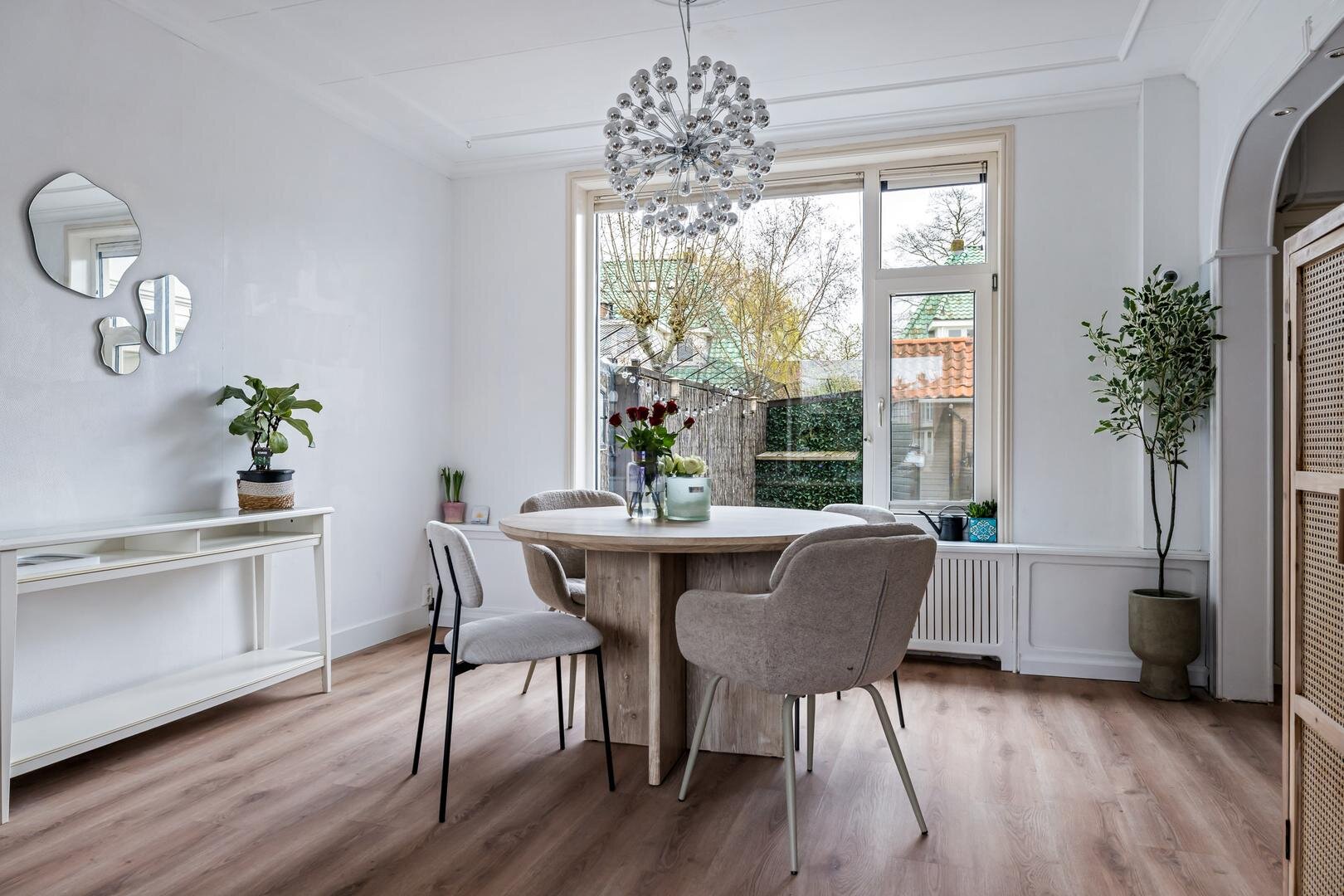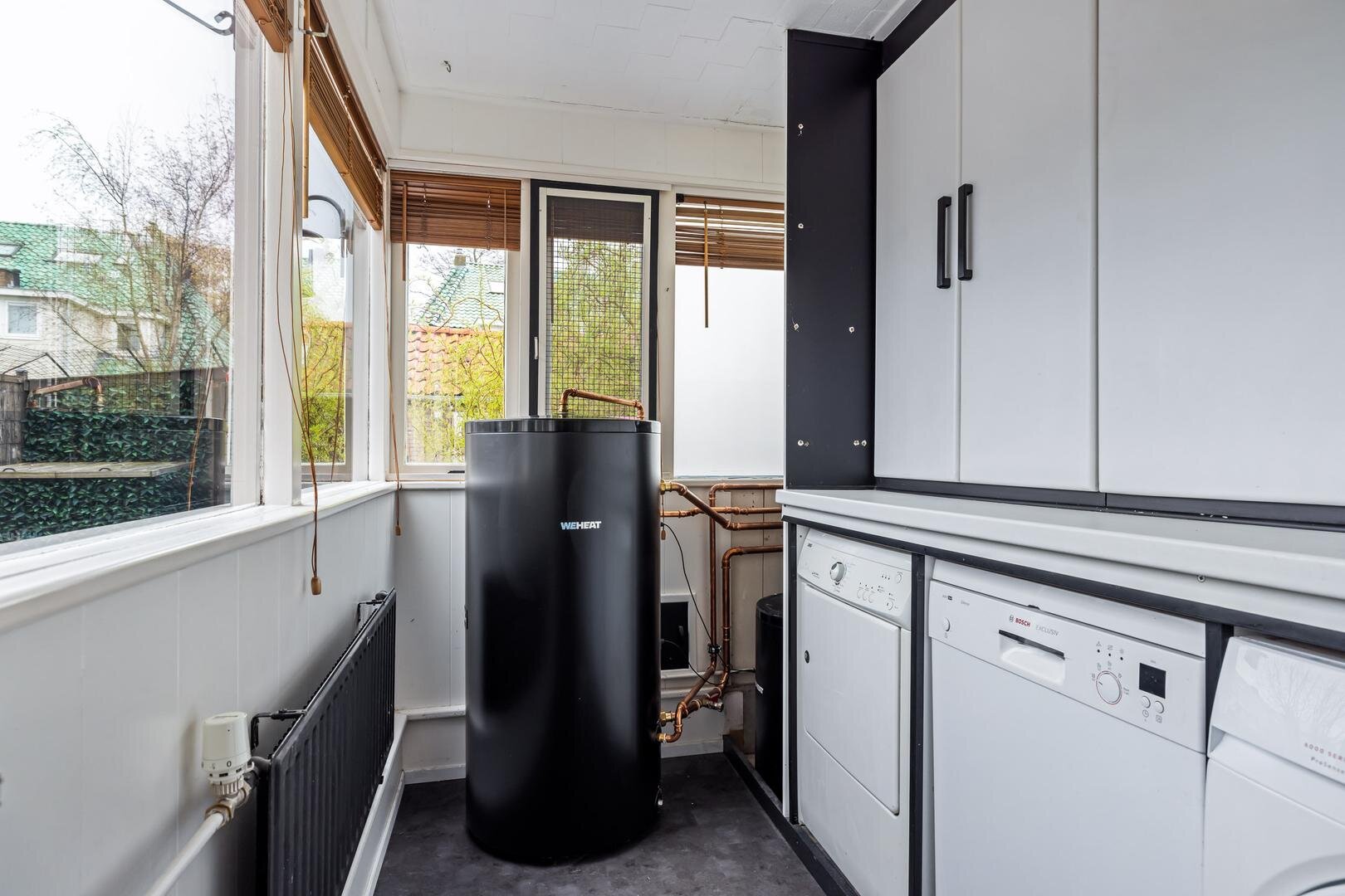 Aan de achterzijde bevindt zich de keuken, die praktisch is ingericht en in directe verbinding staat met de leefruimte. Aansluitend vind je de bijkeuken, een waardevolle extra ruimte die ideaal is voor extra opslag. Vanuit de bijkeuken heb je toegang tot de achtertuin.