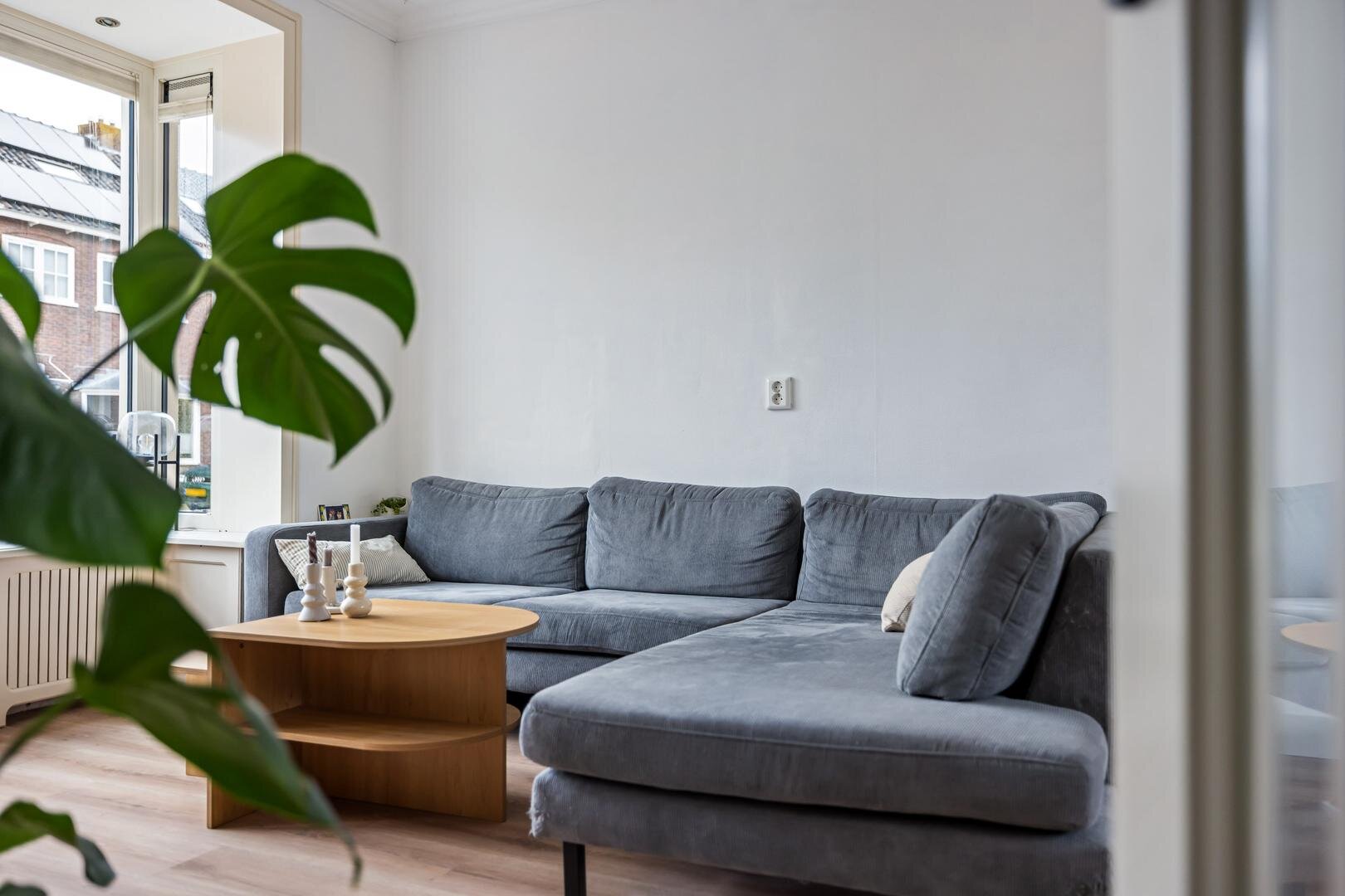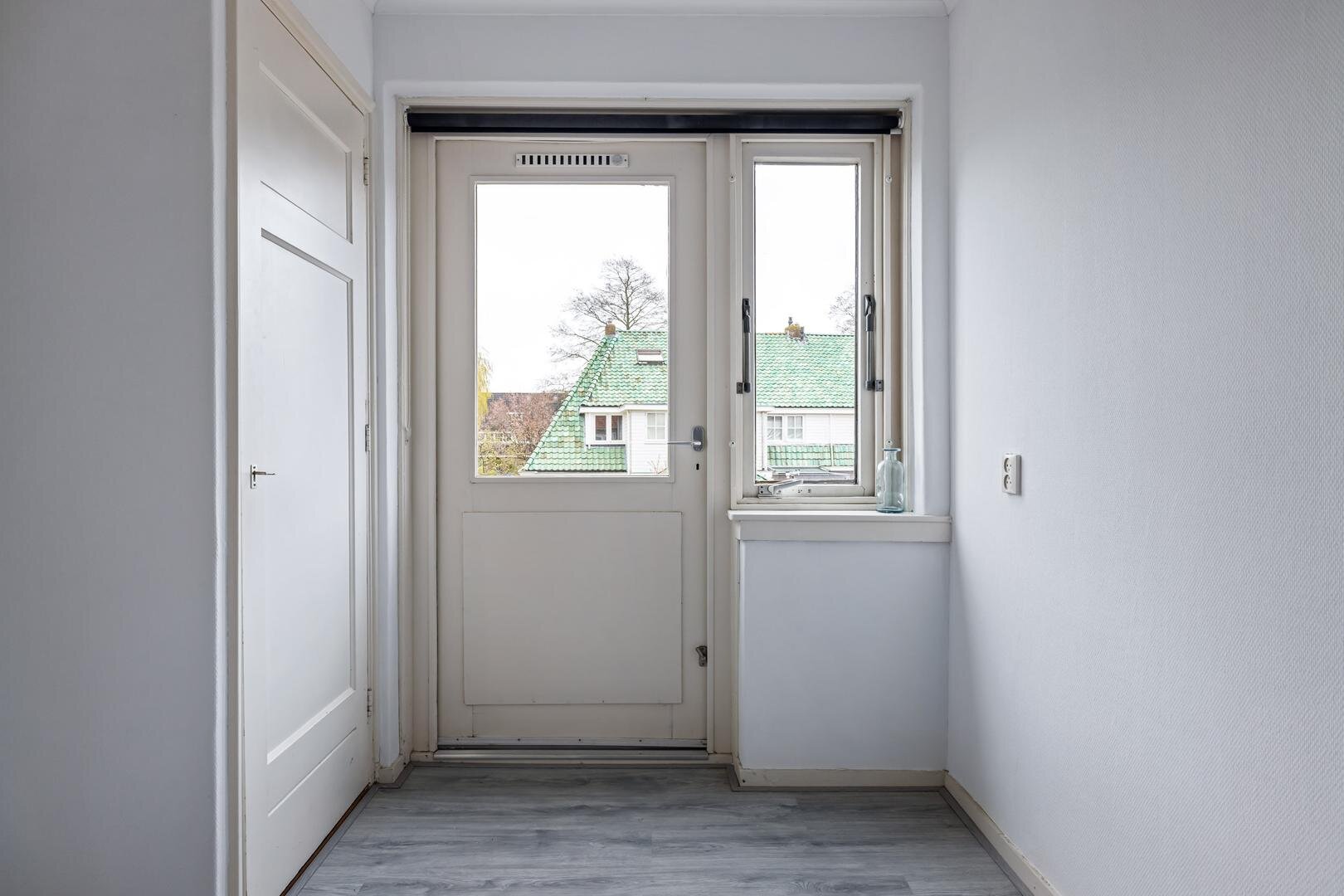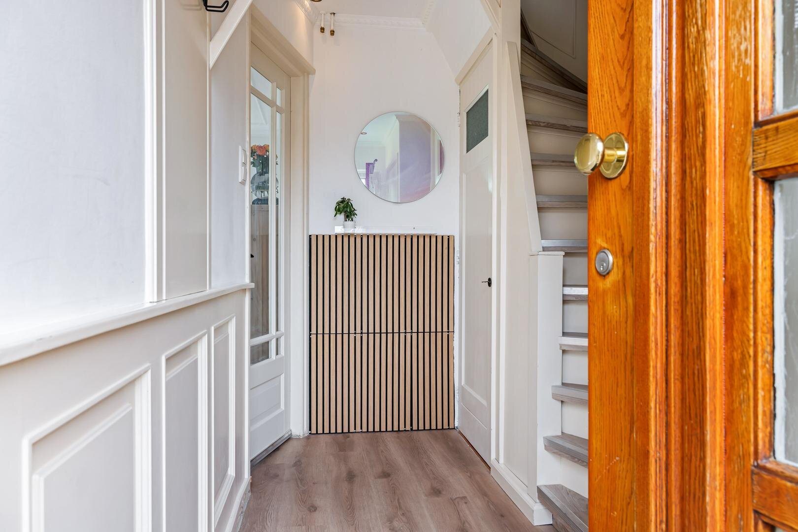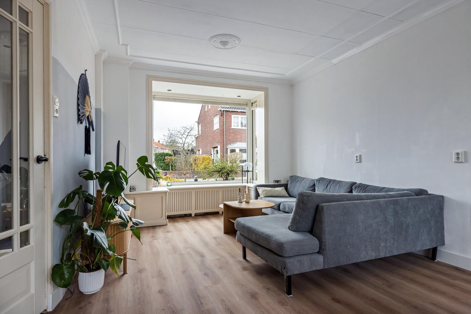 Via de entree kom je in de hal met meterkast, trapopgang en toegang tot het toilet. Vanuit hier betreed je de lichte woonkamer aan de voorzijde van de woning. Dankzij de hoekligging en de grote raampartijen geniet je hier van een prettige hoeveelheid daglicht en een open gevoel.