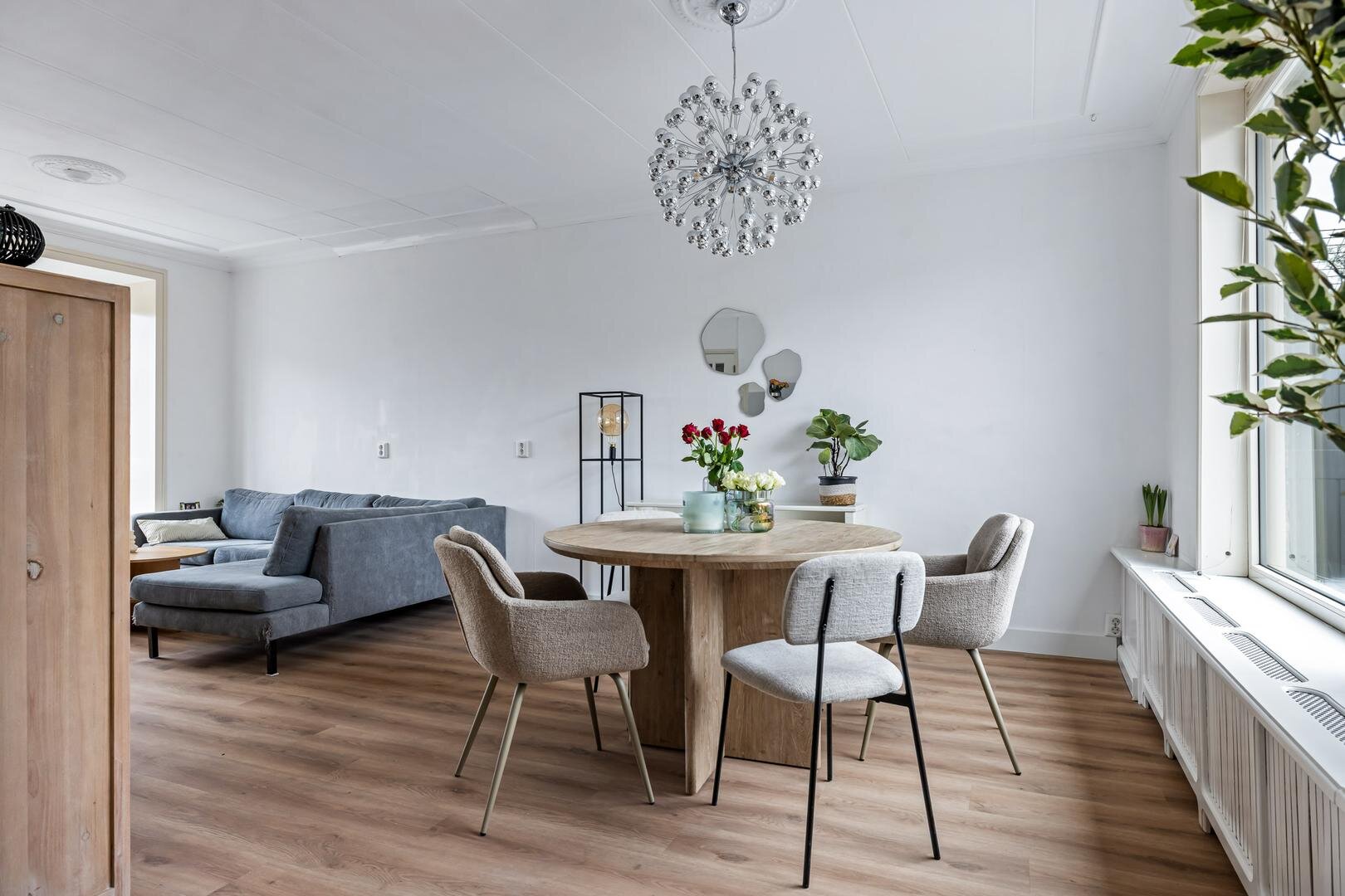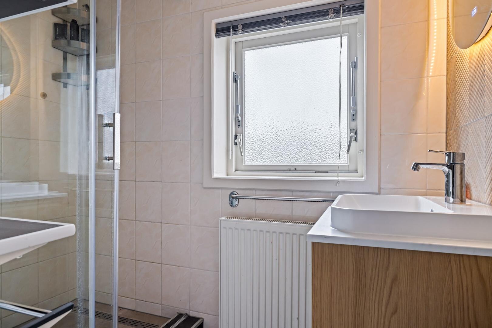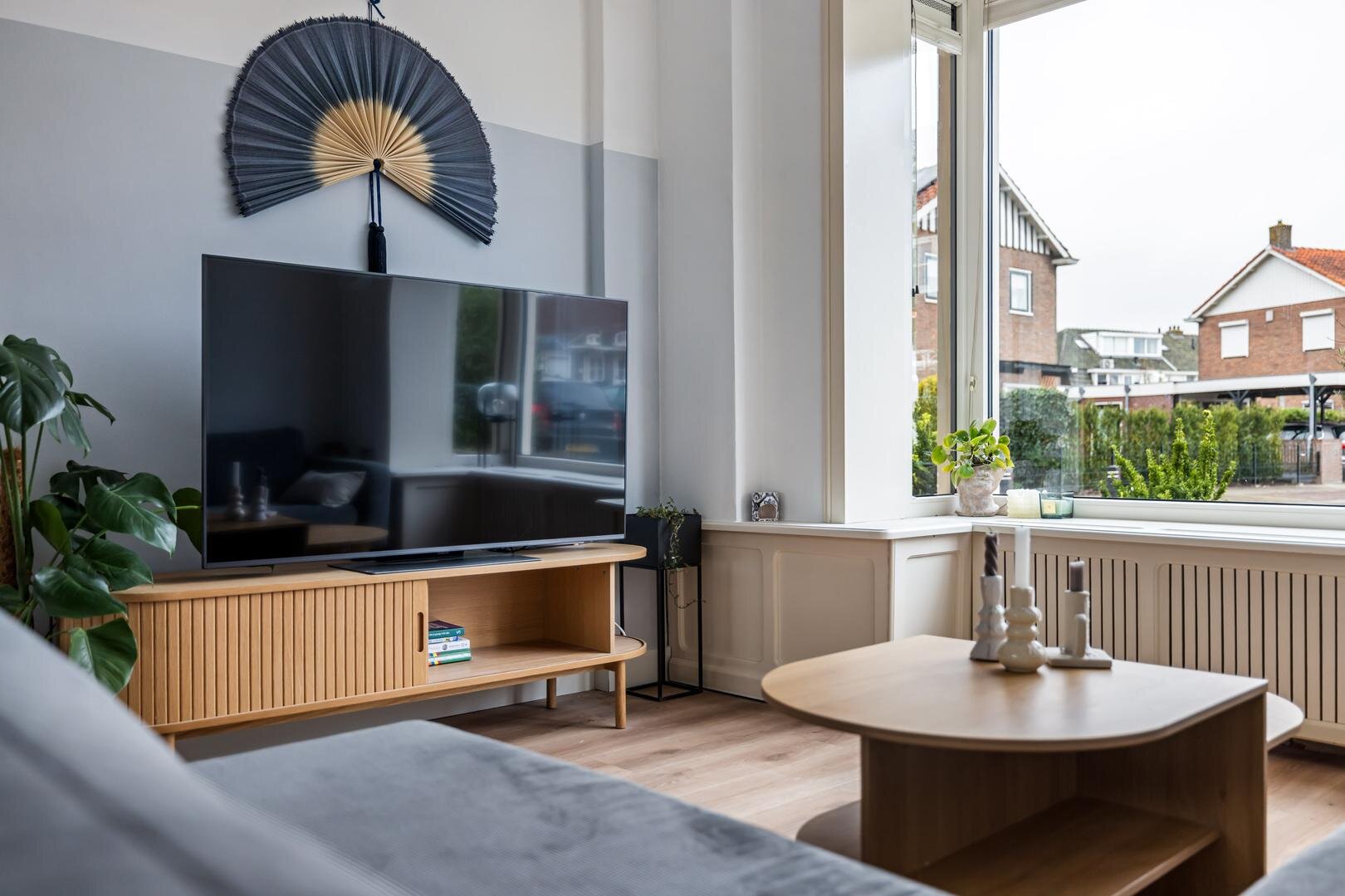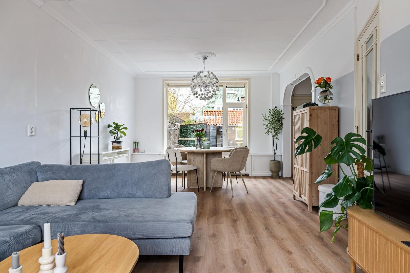 Via de entree kom je in de hal met meterkast, trapopgang en toegang tot het toilet. Vanuit hier betreed je de lichte woonkamer aan de voorzijde van de woning. Dankzij de hoekligging en de grote raampartijen geniet je hier van een prettige hoeveelheid daglicht en een open gevoel.