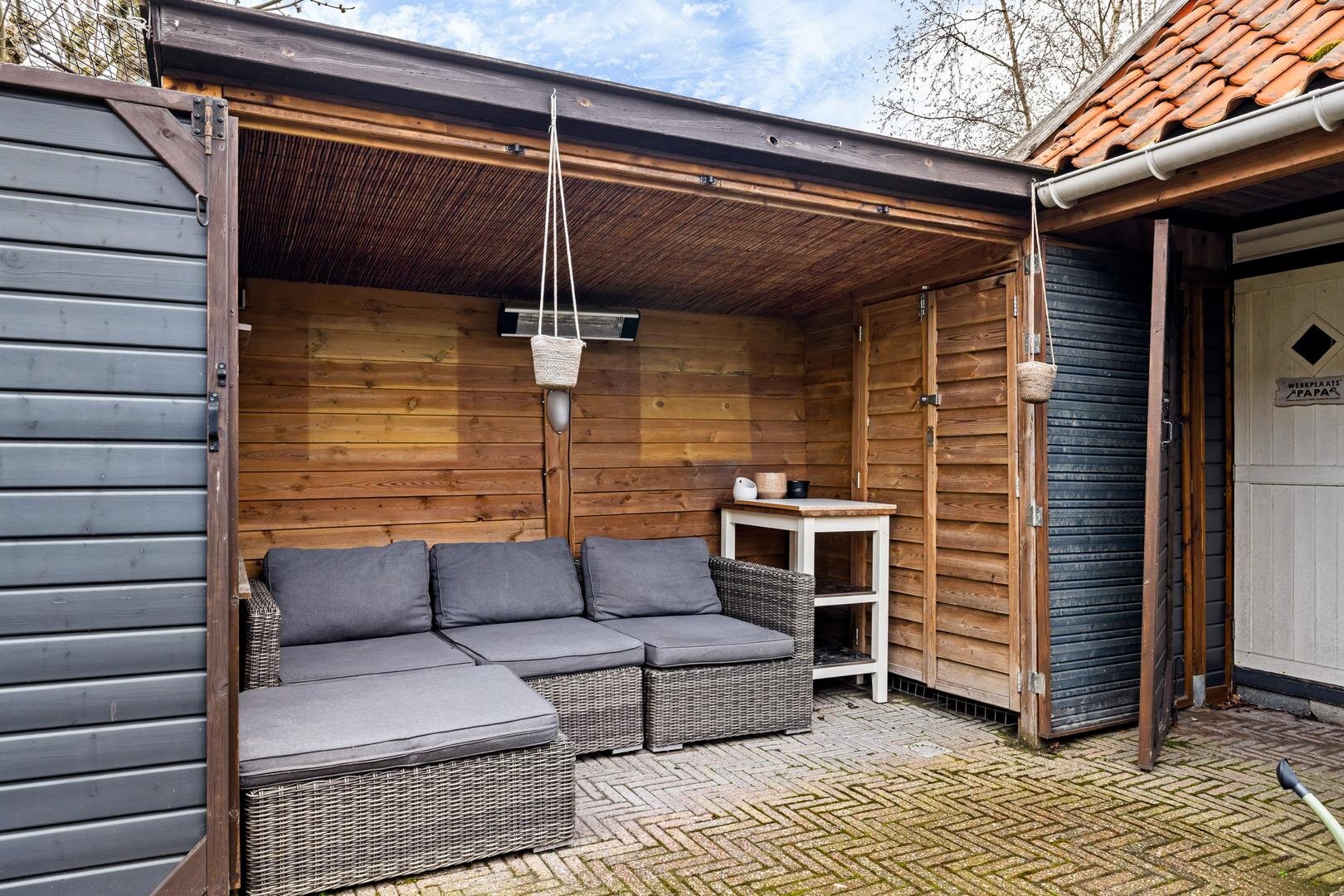 Achterin de tuin bevindt zich een vrijstaande houten berging met overkapping, voorzien van elektra. Ideaal voor opslag, klussen of een beschutte zit plek. Openbaar parkeren is beschikbaar in de directe omgeving.