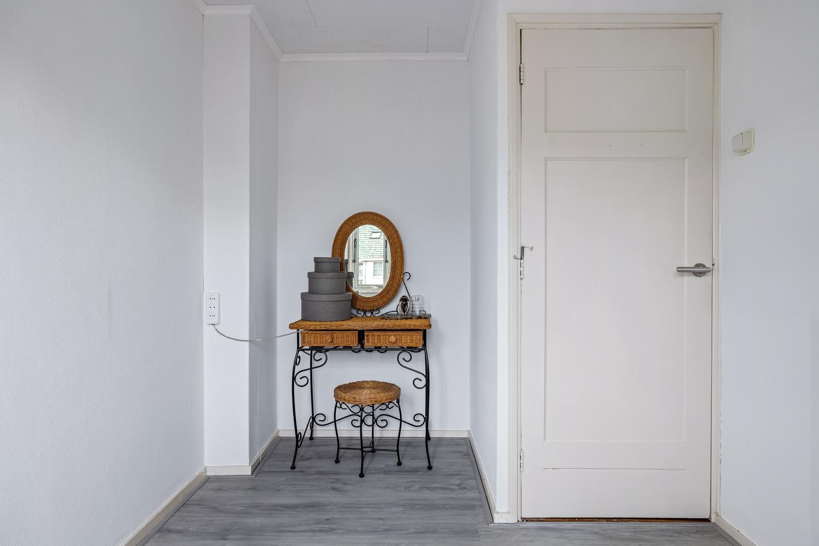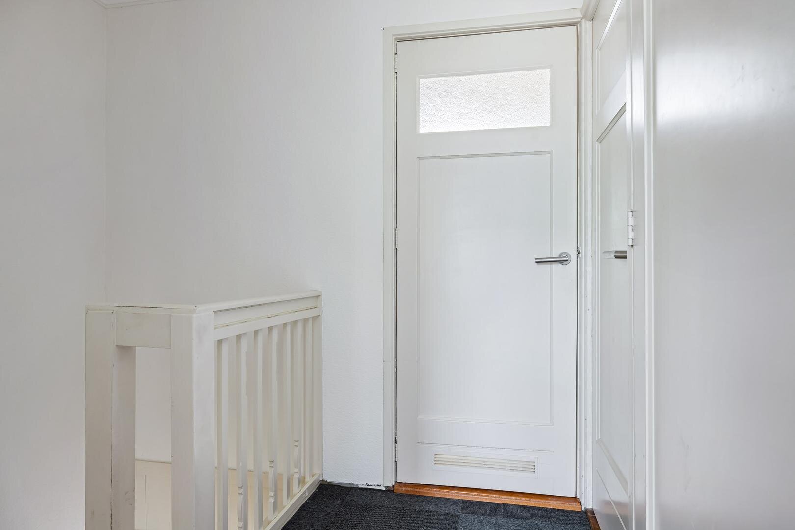 De overloop geeft toegang tot drie slaapkamers en de badkamer. De slaapkamers variëren in formaat en zijn geschikt voor diverse doeleinden, zoals slaap-, werk- of hobbyruimte. De badkamer is compact en functioneel ingericht.