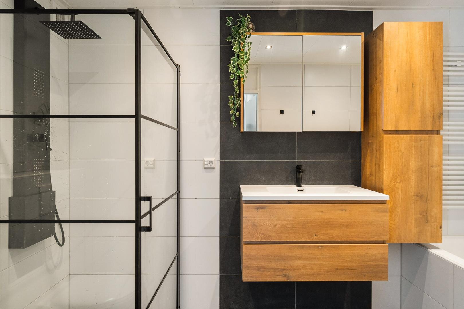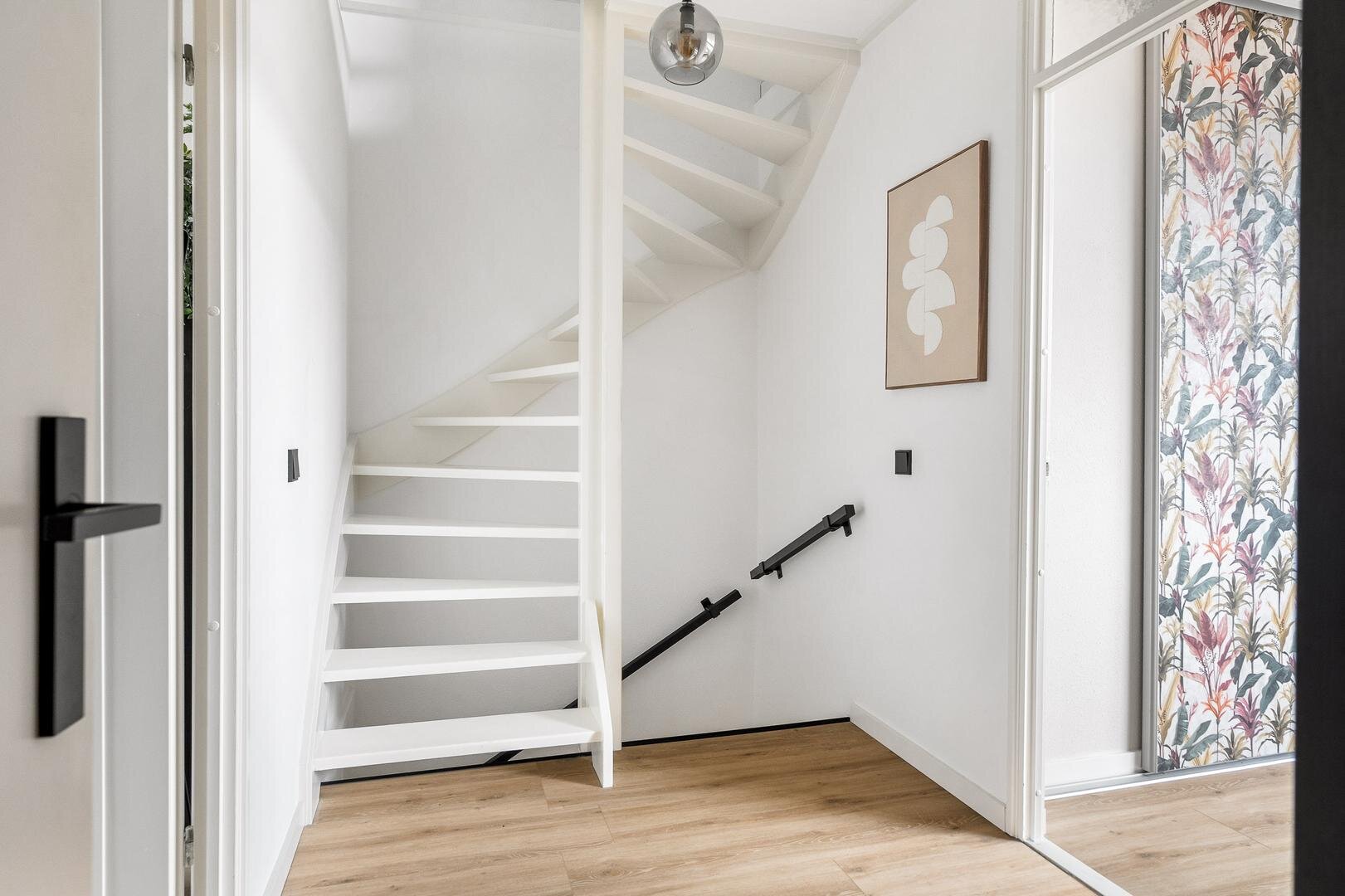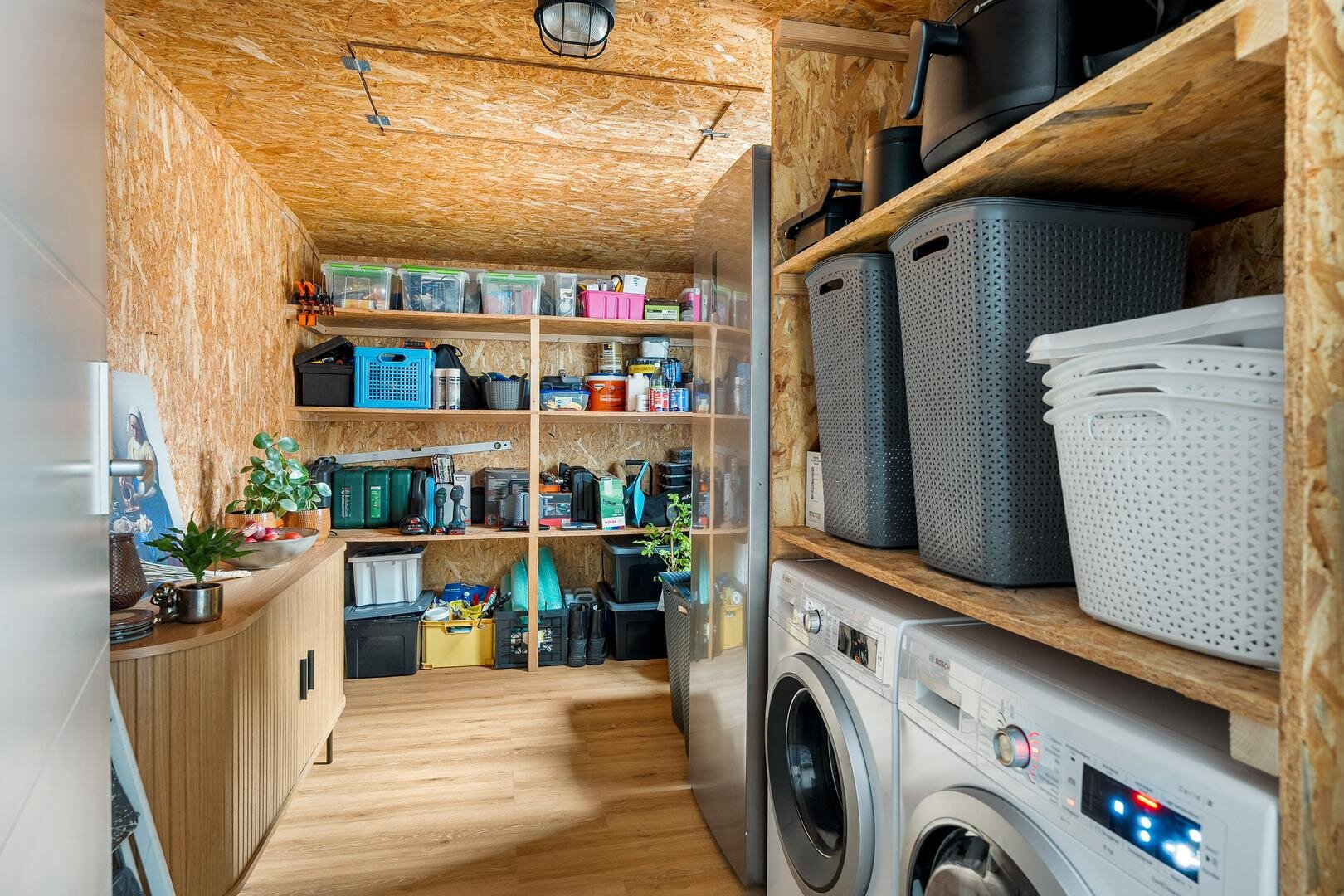 De keuken is vernieuwd in 2022 en straalt luxe uit. De opstelling is praktisch, met ruim opgezette inbouwapparatuur waaronder een 5-pits gaskookplaat, koelkast, vriezer, Bosch-vaatwasser en een hetelucht-combioven met magnetronfunctie. Onder de trap bevindt zich een handige provisiekast. Aansluitend vind je de geïsoleerde bijkeuken met ruimte voor de wasmachine en droger, plus een vliering voor extra bergruimte. Terug door de woning naar de hal, hier bevindt zich het moderne toilet en de trap naar boven, subtiel verlicht met ledverlichting onder de treden.
