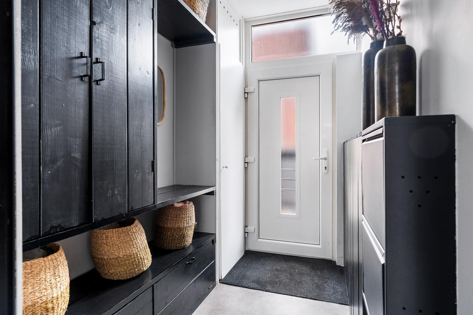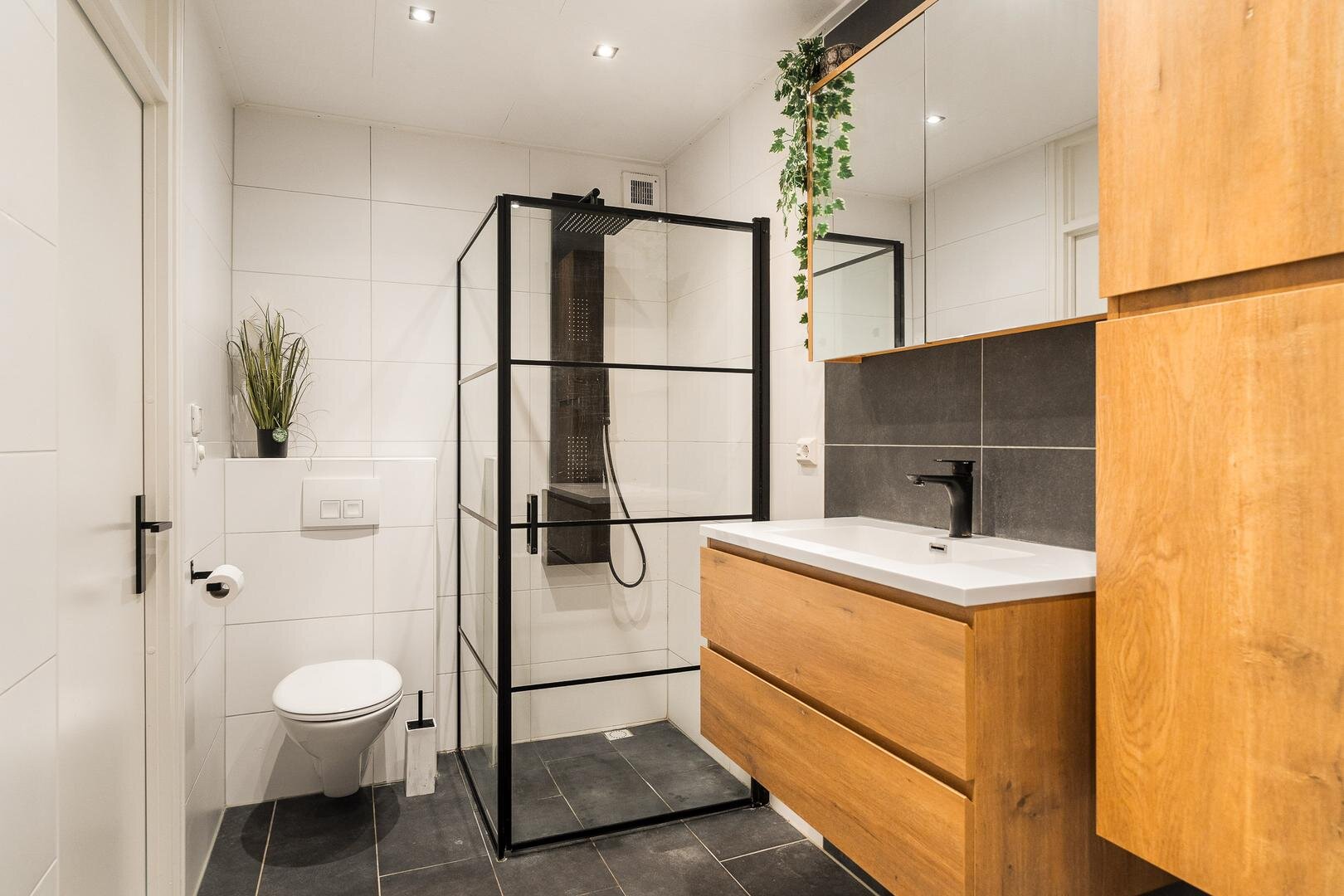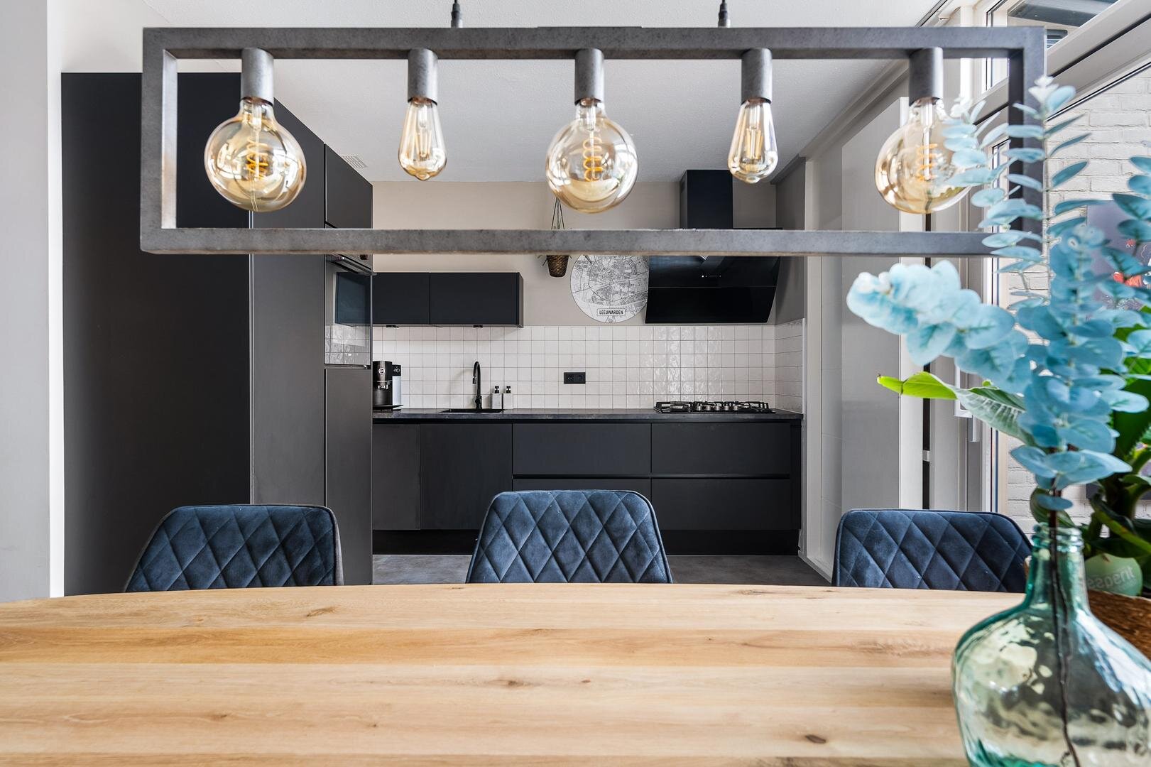 De keuken is vernieuwd in 2022 en straalt luxe uit. De opstelling is praktisch, met ruim opgezette inbouwapparatuur waaronder een 5-pits gaskookplaat, koelkast, vriezer, Bosch-vaatwasser en een hetelucht-combioven met magnetronfunctie. Onder de trap bevindt zich een handige provisiekast. Aansluitend vind je de geïsoleerde bijkeuken met ruimte voor de wasmachine en droger, plus een vliering voor extra bergruimte. Terug door de woning naar de hal, hier bevindt zich het moderne toilet en de trap naar boven, subtiel verlicht met ledverlichting onder de treden.