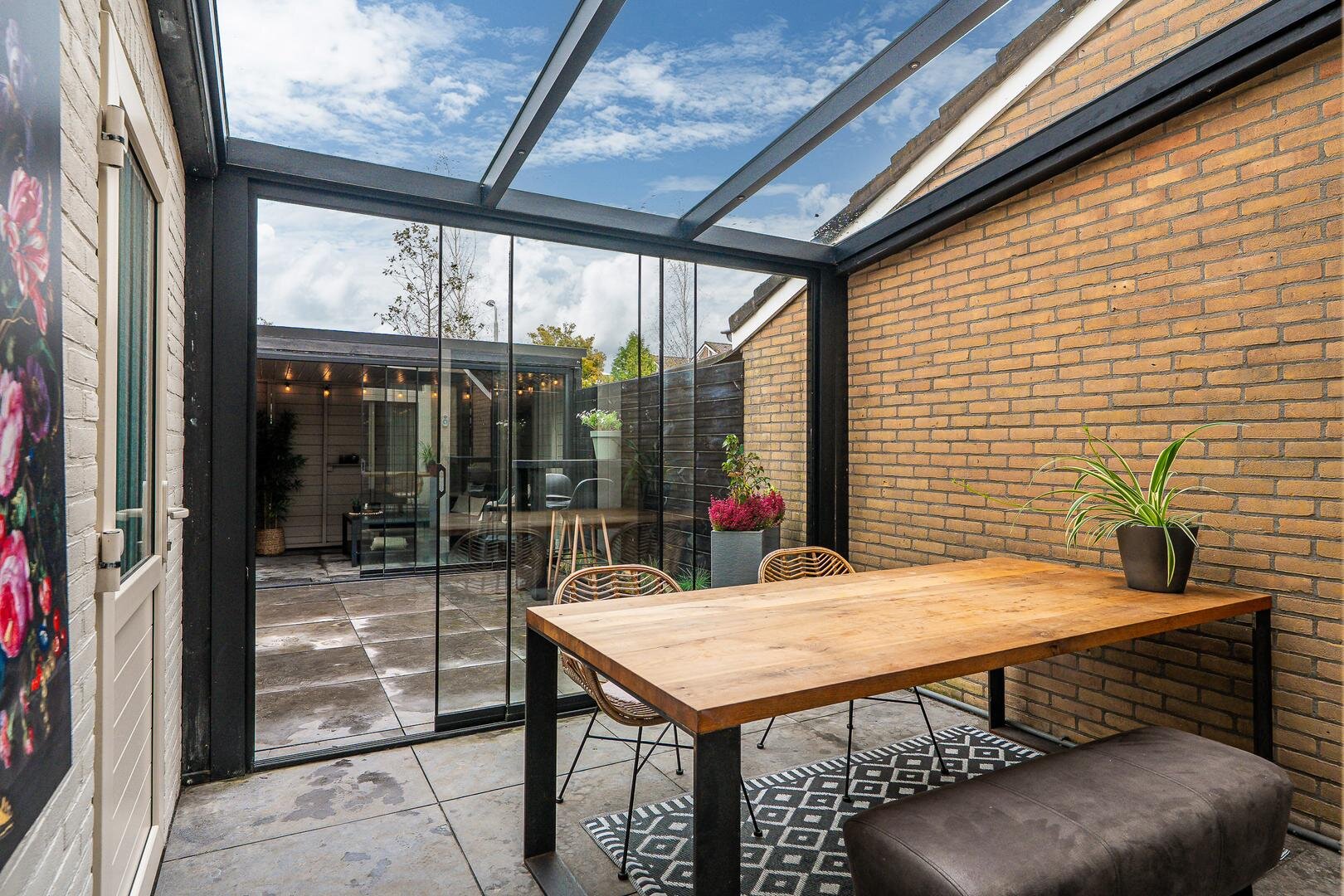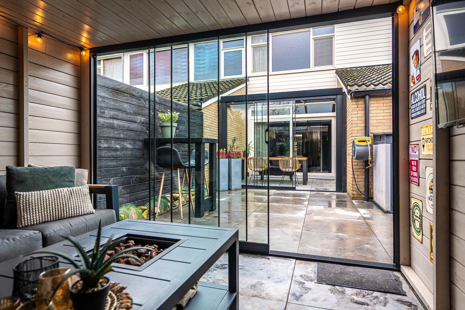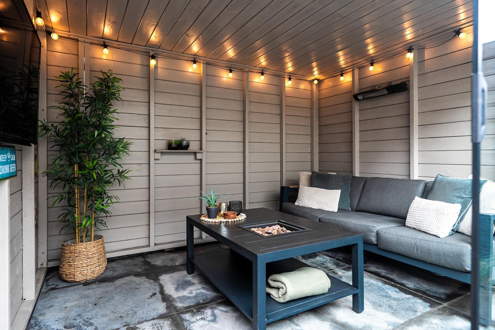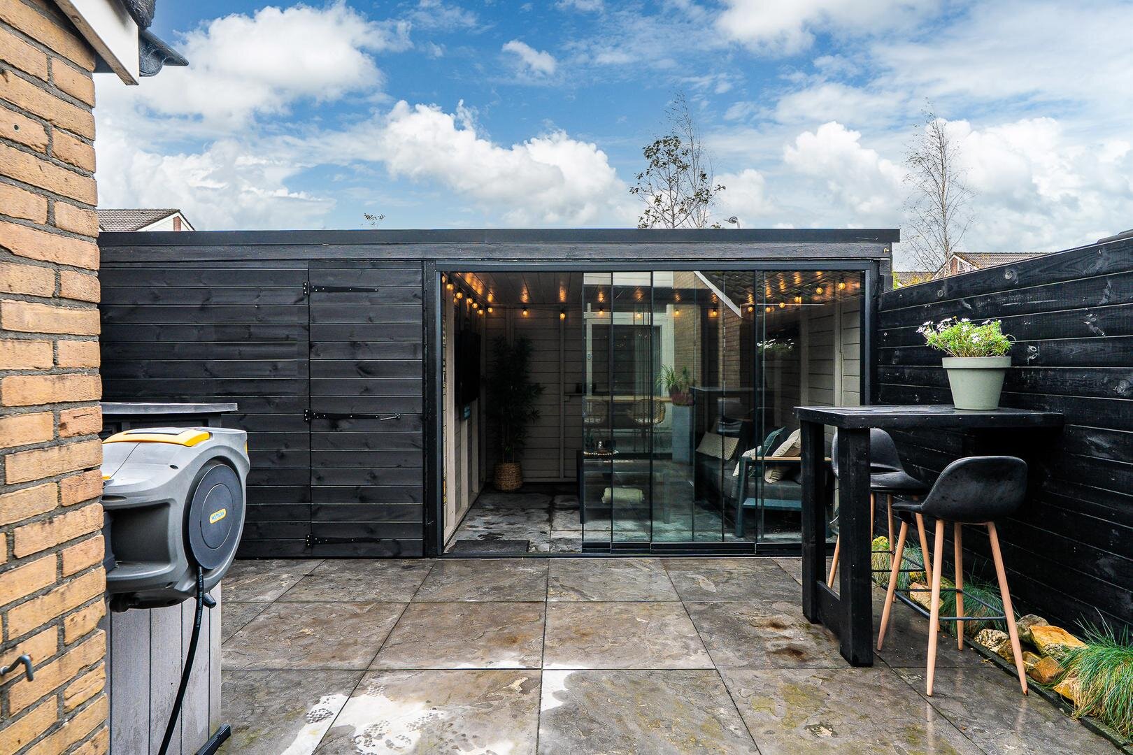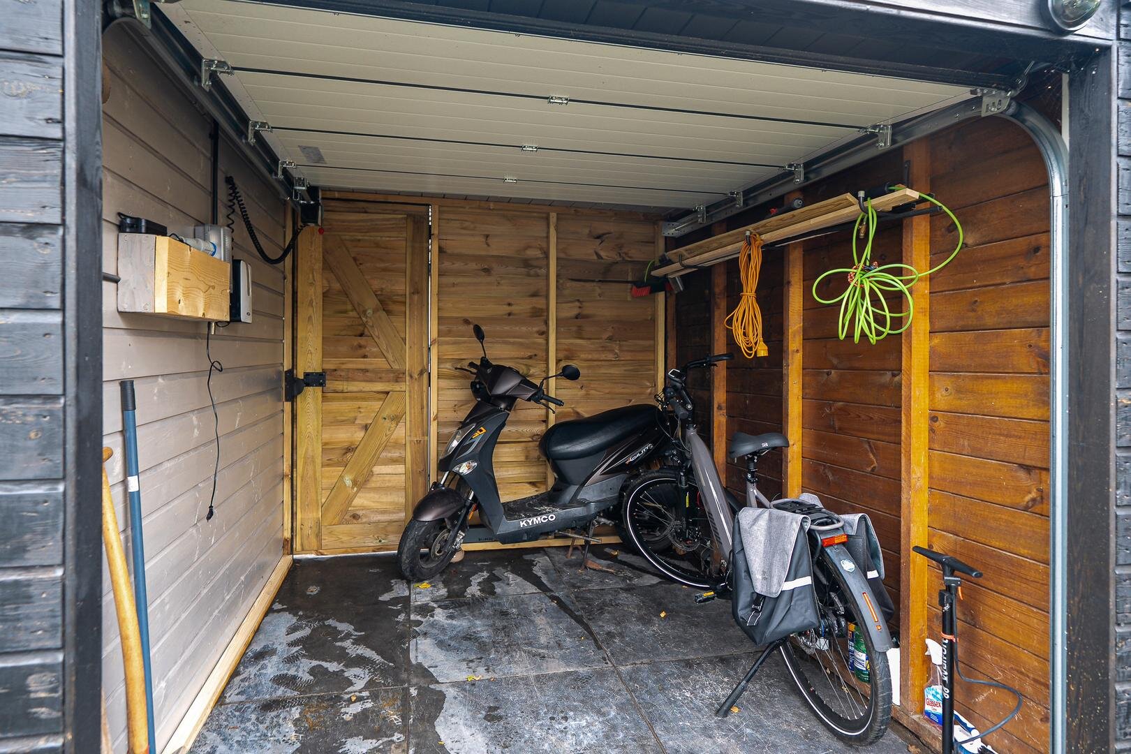 De zonnige achtertuin is eveneens onderhoudsvriendelijk en ingericht als een echte stadstuin: compact, verzorgd en voorzien van alles wat je nodig hebt om buiten te genieten. Vanuit de serre stap je zo de tuin in, waar zich nog een overkapping met zithoek en glazen schuifdeuren bevindt. De overkapping is afgewerkt met zwarte houten rabatdelen, wat zorgt voor een sfeervolle uitstraling. Dankzij de aanwezige infraroodverwarming is het hier bovendien het hele jaar door comfortabel vertoeven. Aan de linkerkant van de overkapping bevindt zich een handige schuur met voldoende ruimte voor de motor of fietsen. Via de elektrische sectionaaldeur aan de achterzijde bereik je eenvoudig de straat.