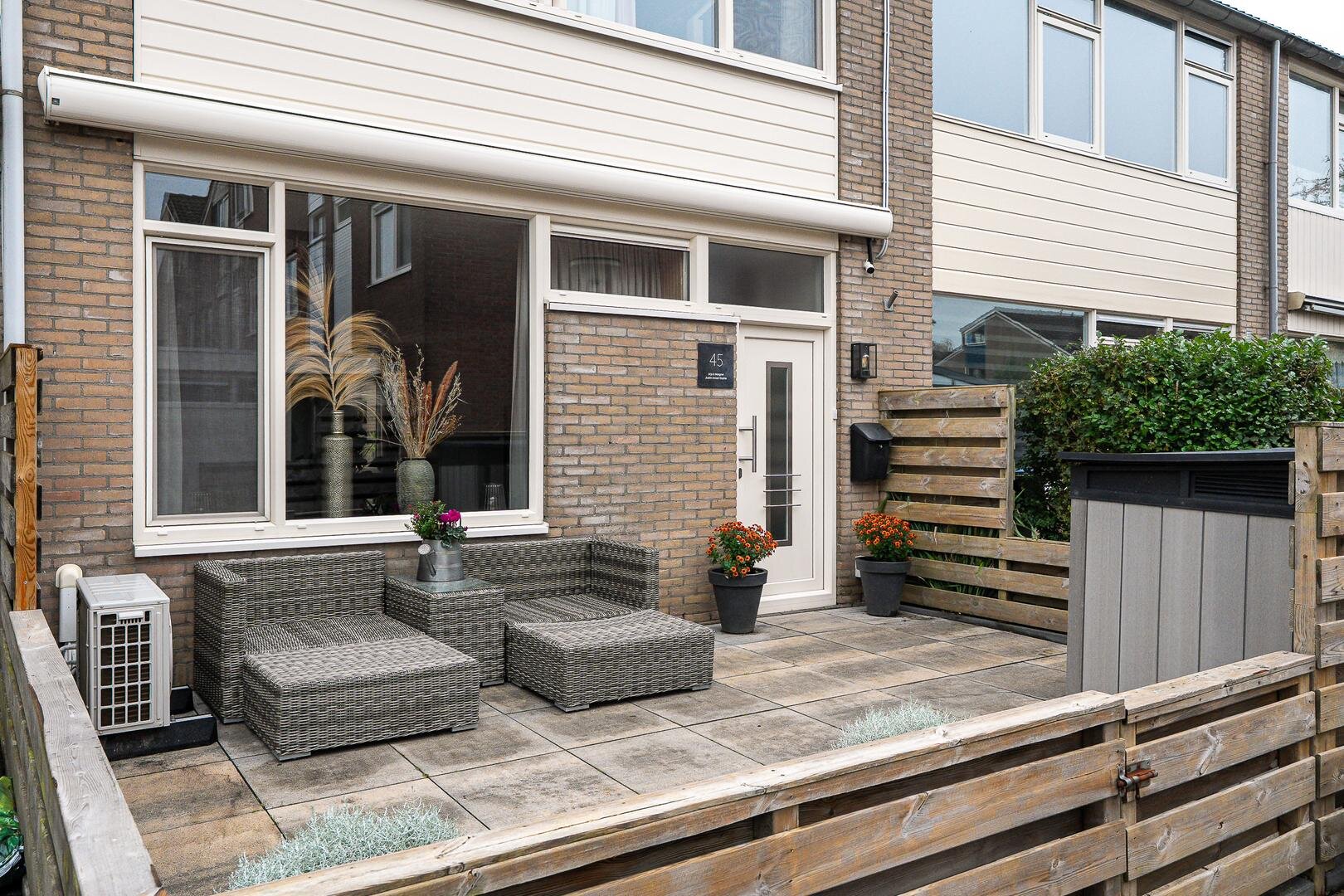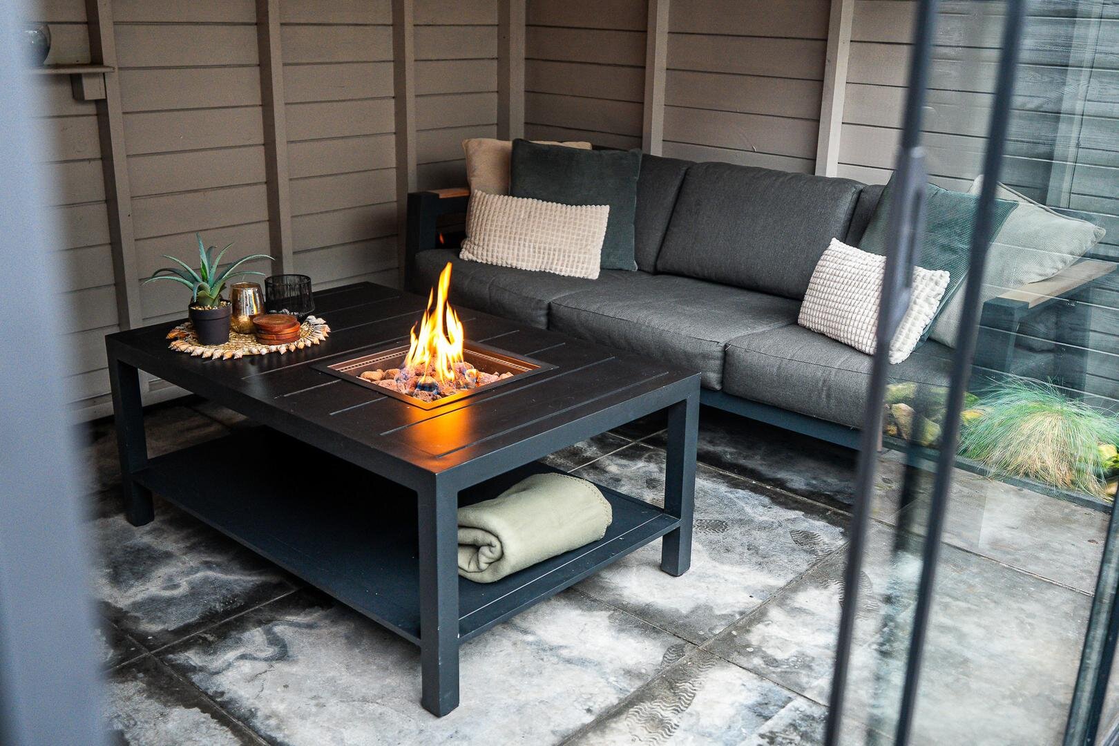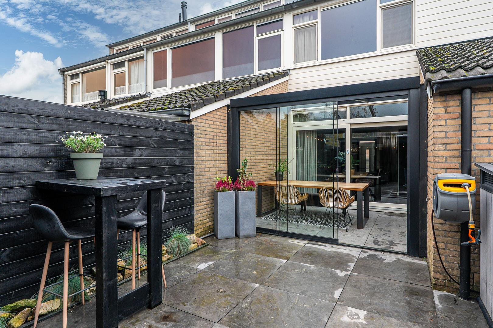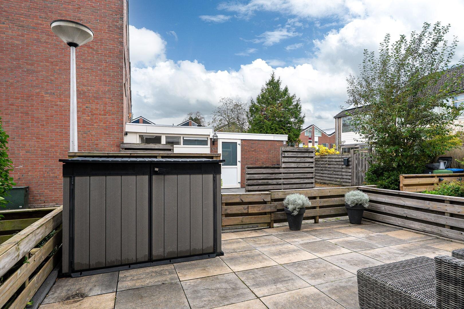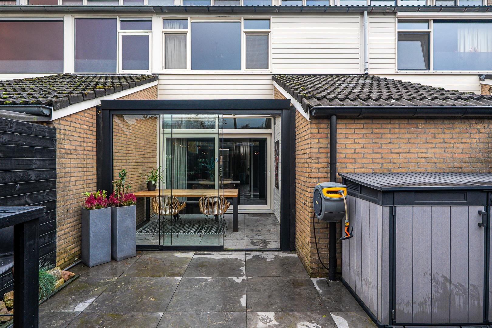 De zonnige achtertuin is eveneens onderhoudsvriendelijk en ingericht als een echte stadstuin: compact, verzorgd en voorzien van alles wat je nodig hebt om buiten te genieten. Vanuit de serre stap je zo de tuin in, waar zich nog een overkapping met zithoek en glazen schuifdeuren bevindt. De overkapping is afgewerkt met zwarte houten rabatdelen, wat zorgt voor een sfeervolle uitstraling. Dankzij de aanwezige infraroodverwarming is het hier bovendien het hele jaar door comfortabel vertoeven. Aan de linkerkant van de overkapping bevindt zich een handige schuur met voldoende ruimte voor de motor of fietsen. Via de elektrische sectionaaldeur aan de achterzijde bereik je eenvoudig de straat.