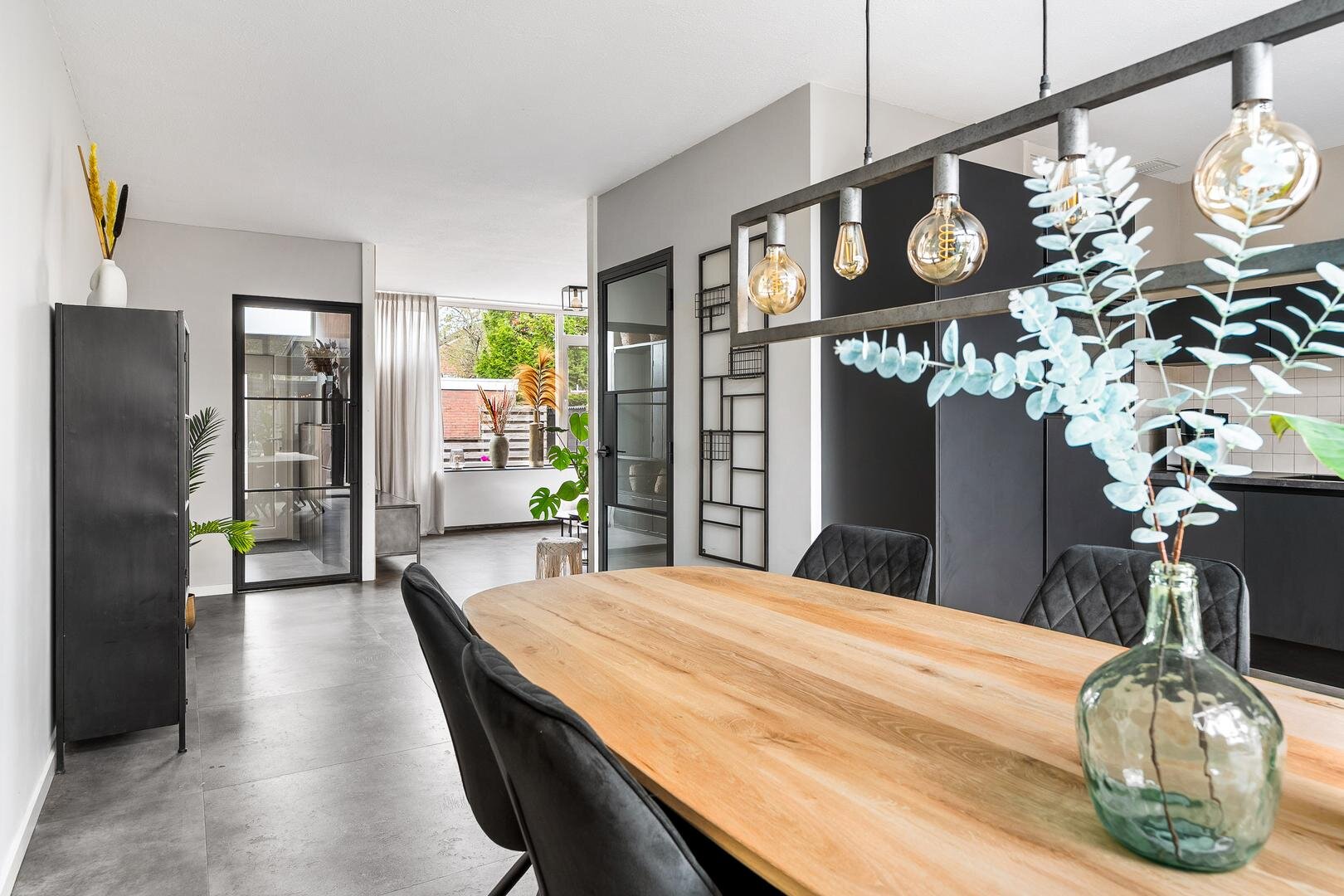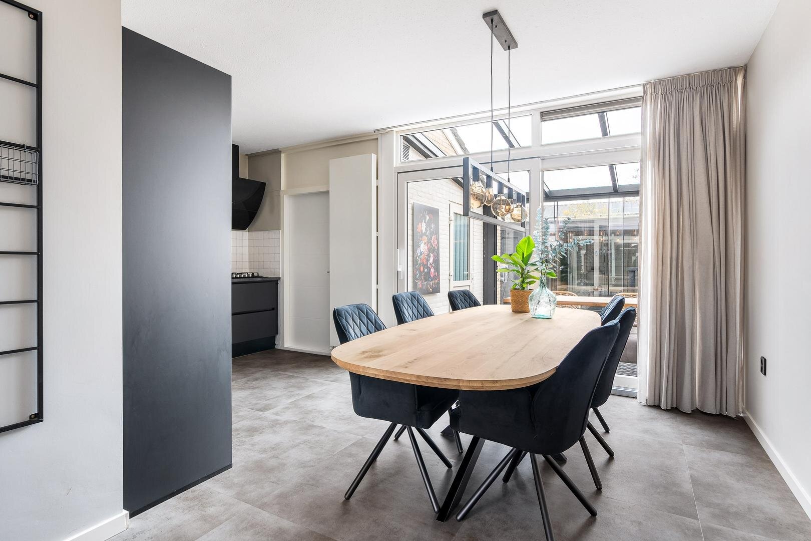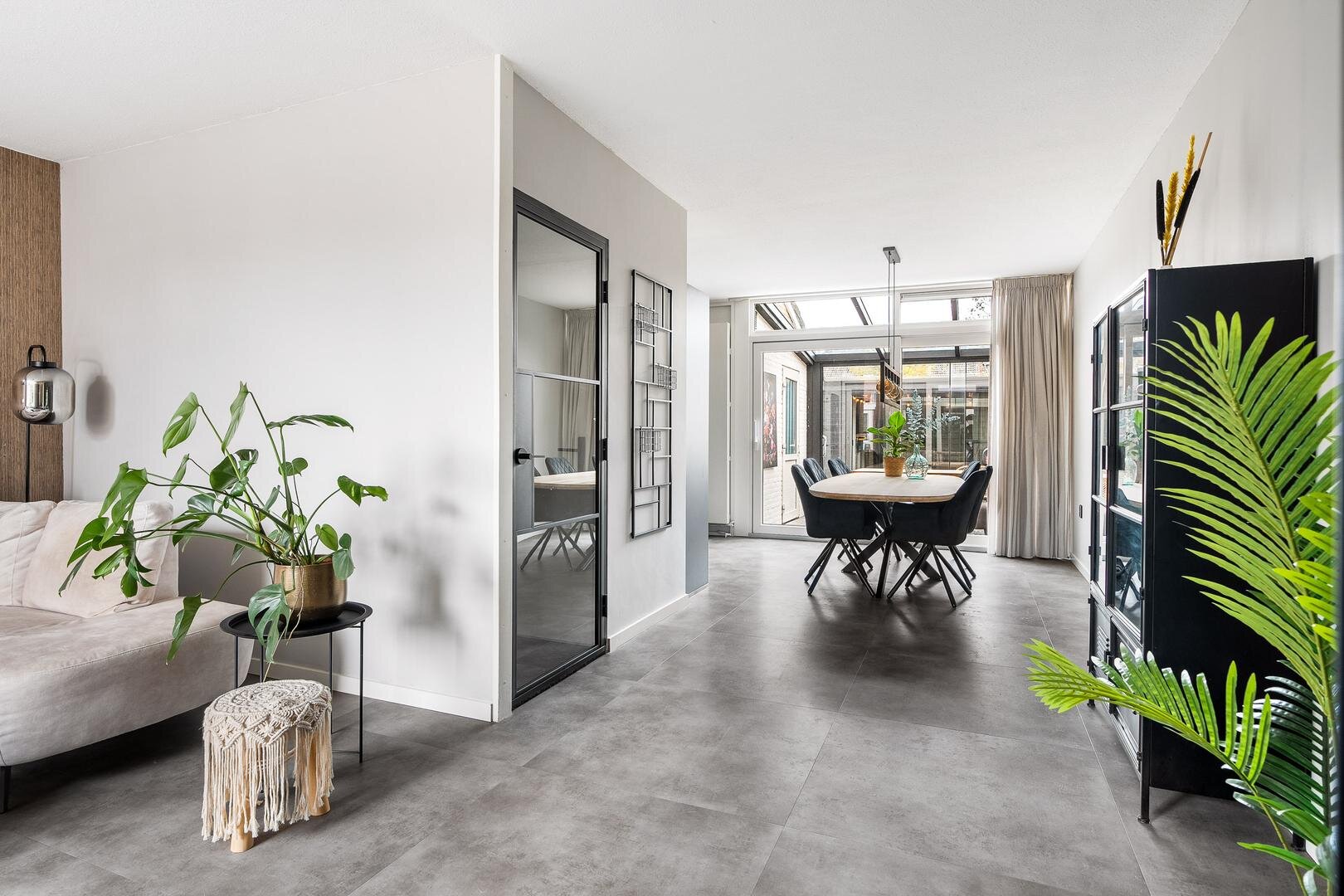 Via de hal met meterkast stap je binnen in een heerlijk lichte leefruimte, gescheiden van de entree door een stijlvolle stalen deur met glas. Een tweede stalen deur bevindt zich bij de trap, wat de ruimte een open en prettige indeling geeft. De royale woonkamer biedt volop plek voor een ruime zithoek waar je samen met het gezin kunt ontspannen of een filmavond houdt. De doorlopende pvc vloer met grote tegels van circa 1x1 meter zorgt voor een strak en ruimtelijk geheel en loopt helemaal door tot in de keuken. Achterin is ruimte voor een grote eettafel met zicht op de tuin. Via de brede schuifpui stap je zo de serre in, een heerlijke lichte ruimte voorzien van sfeerverlichting, glazen dak en schuifdeuren. De ideale plek om tot laat op de avond te zitten, ook als het buiten afkoelt.