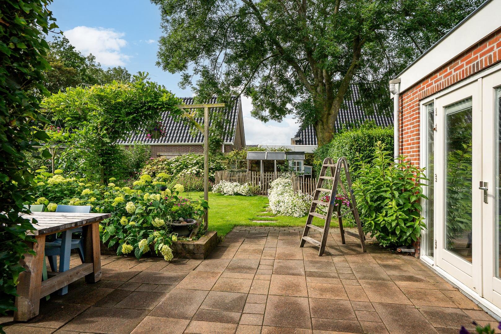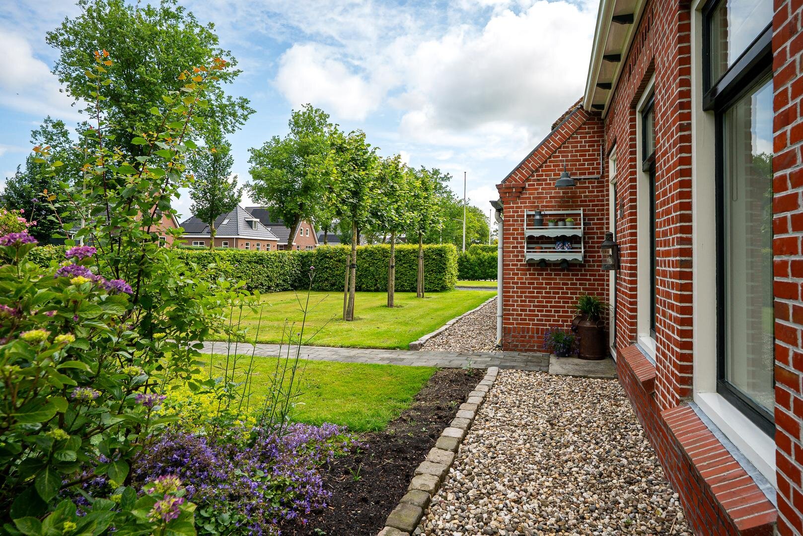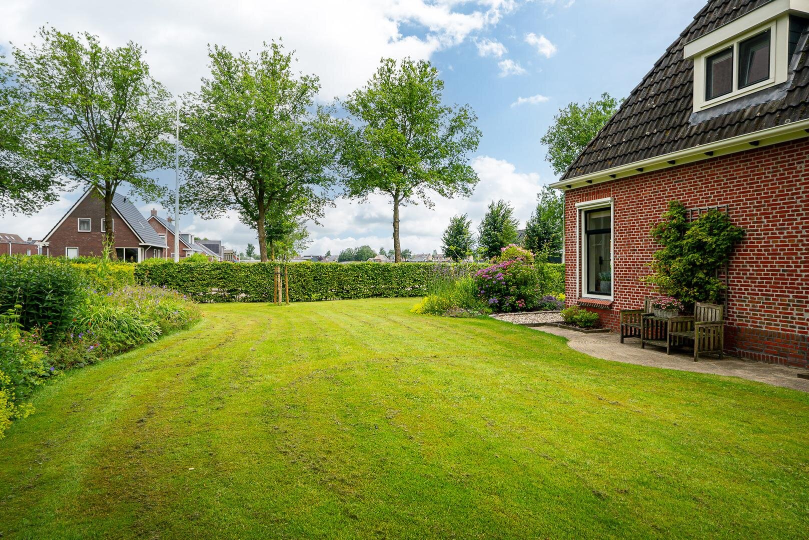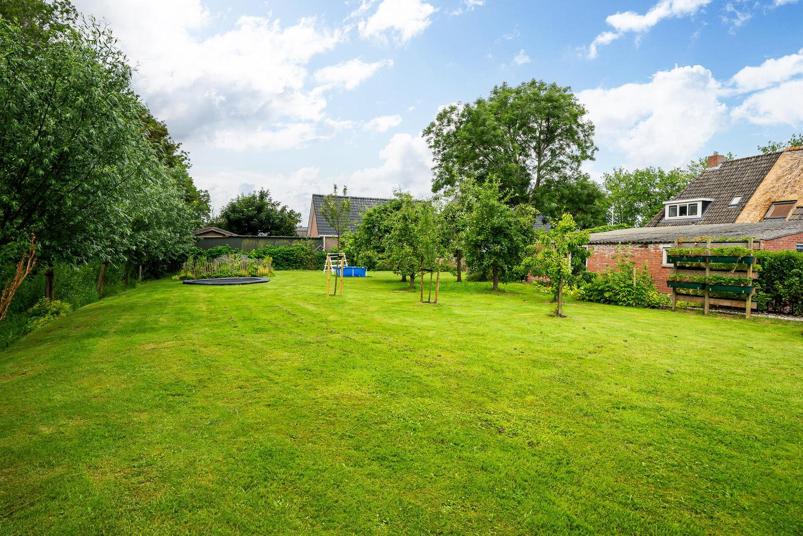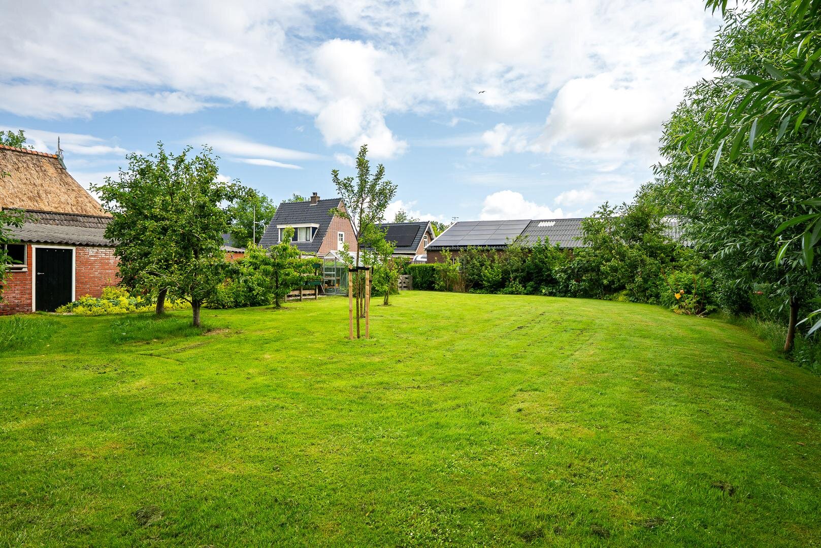 Het erf rondom de woning biedt volop ruimte om van het buitenleven te genieten. De tuin bestaat uit een ruim gazon met een kas, een moestuin en diverse fruitbomen. Ideaal voor wie graag verse producten uit eigen tuin oogst!