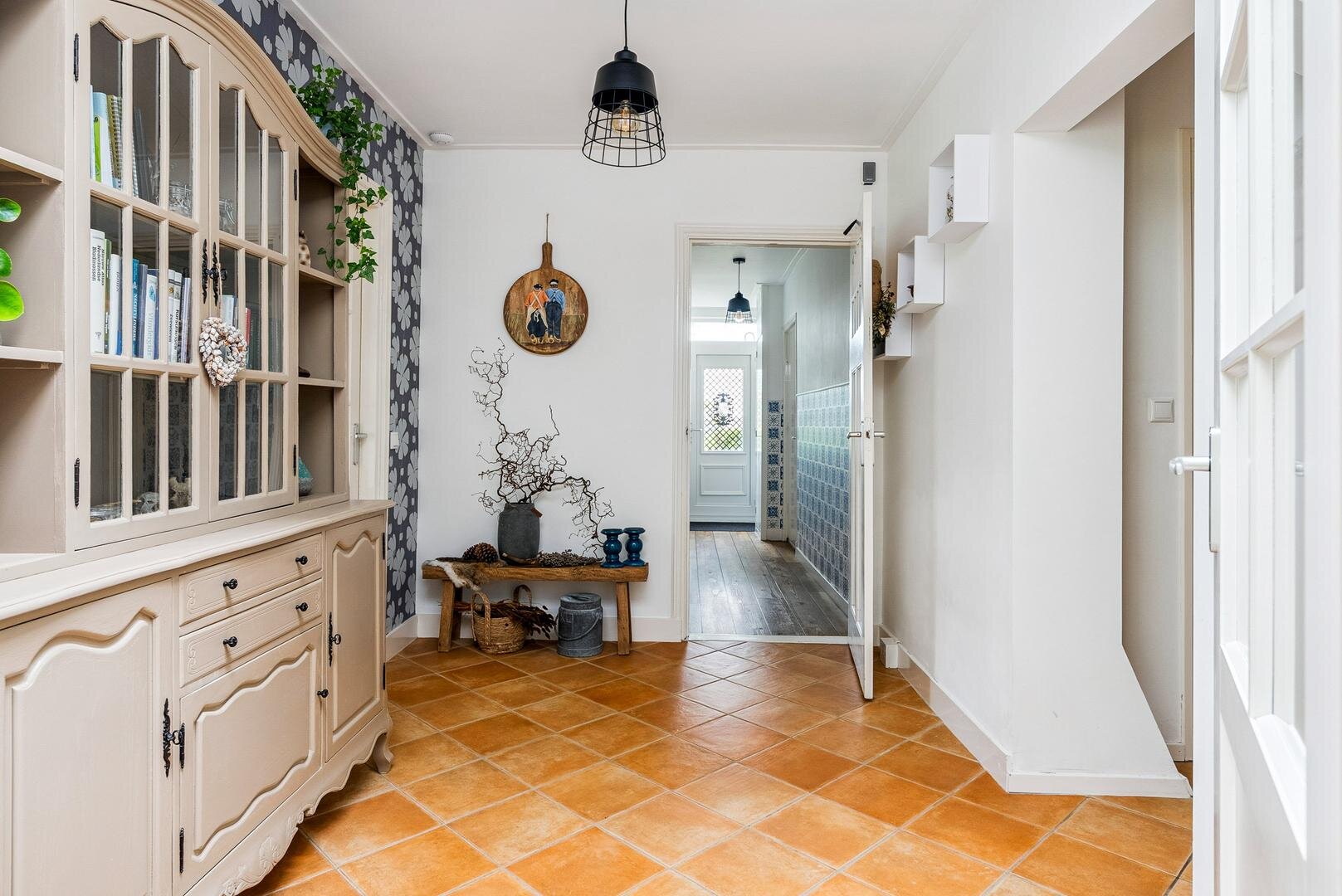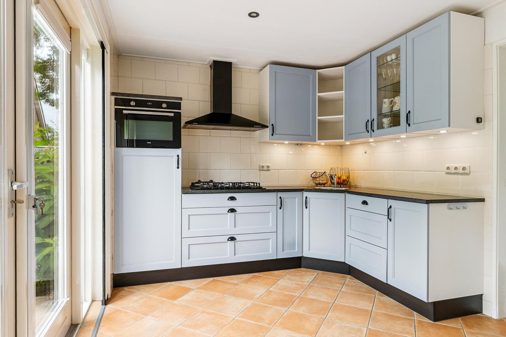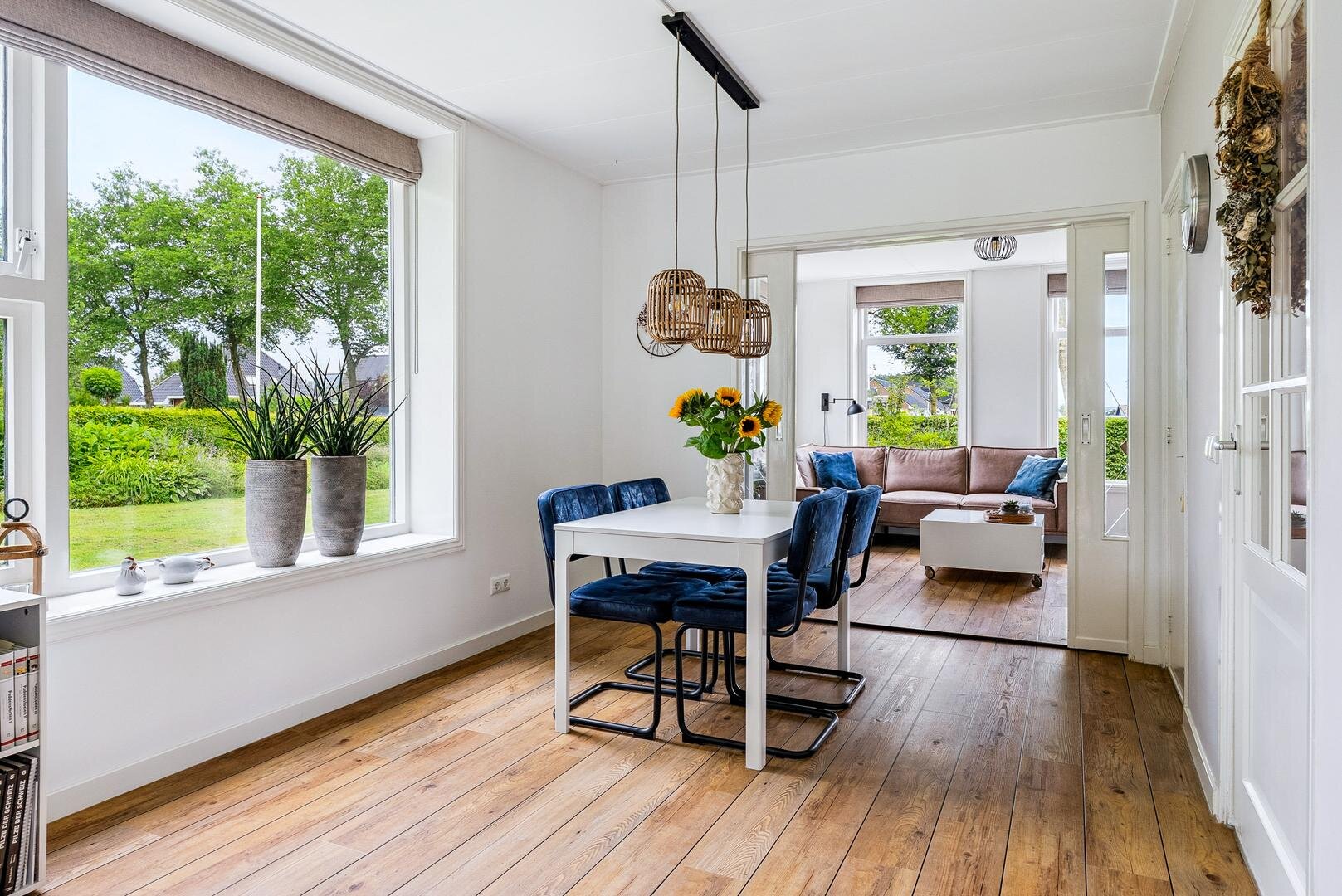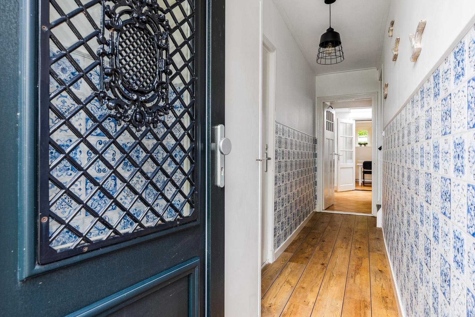 De lichte woon- en eetkamer vormen samen een sfeervol geheel en staan met elkaar in verbinding via karakteristieke schuifdeuren. Aansluitend bevindt zich de ruime woonkeuken met openslaande terrasdeuren en vernieuwde inbouwapparatuur, een heerlijke plek om uitgebreid te koken en samen te genieten. Daarnaast vind je een ruime badkamer met ligbad, douche en wastafel, separaat toilet en een praktische bijkeuken met plaats voor het witgoed. Aan de voorzijde van de woning ligt de royale masterbedroom, voorzien van een laminaatvloer, vaste kasten en een fijne plek voor een (thuis)werkplek. Als extra beschikt de woning bovendien over een handig keldertje voor provisie of opslag.