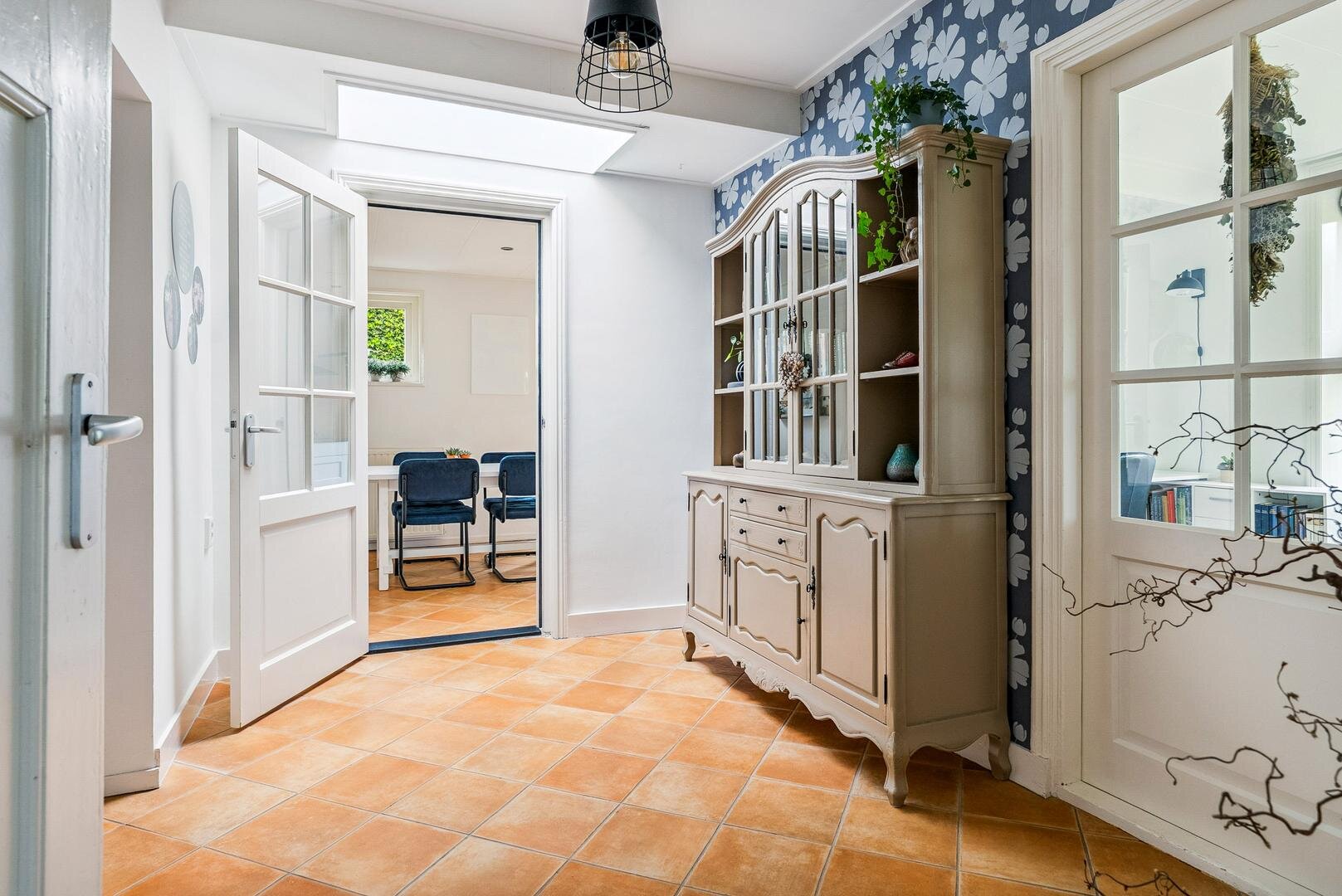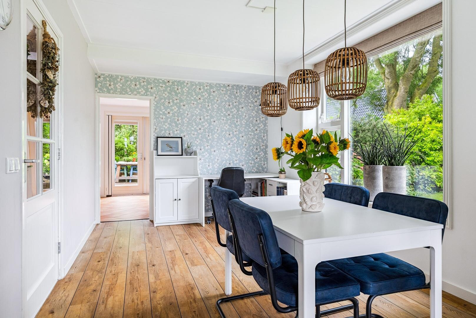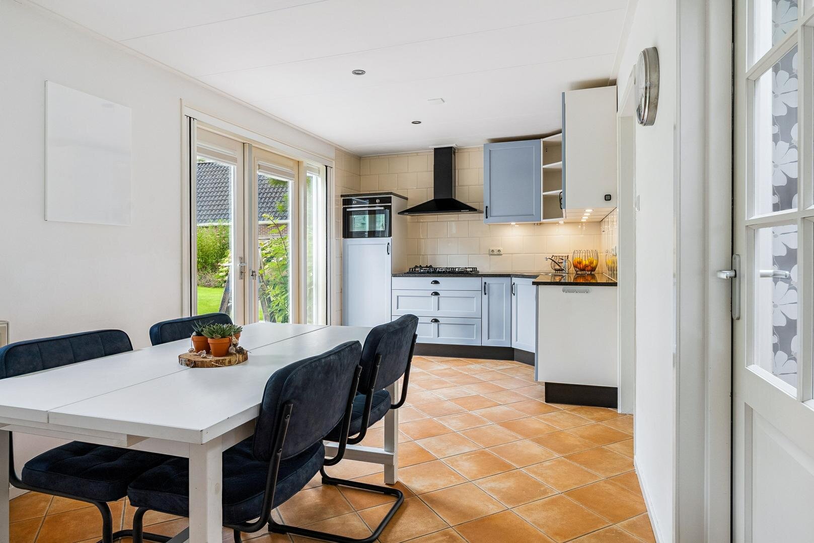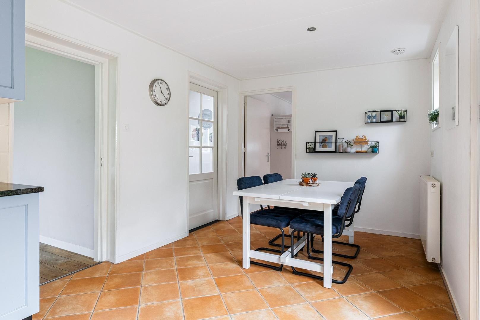 De lichte woon- en eetkamer vormen samen een sfeervol geheel en staan met elkaar in verbinding via karakteristieke schuifdeuren. Aansluitend bevindt zich de ruime woonkeuken met openslaande terrasdeuren en vernieuwde inbouwapparatuur, een heerlijke plek om uitgebreid te koken en samen te genieten. Daarnaast vind je een ruime badkamer met ligbad, douche en wastafel, separaat toilet en een praktische bijkeuken met plaats voor het witgoed. Aan de voorzijde van de woning ligt de royale masterbedroom, voorzien van een laminaatvloer, vaste kasten en een fijne plek voor een (thuis)werkplek. Als extra beschikt de woning bovendien over een handig keldertje voor provisie of opslag.
