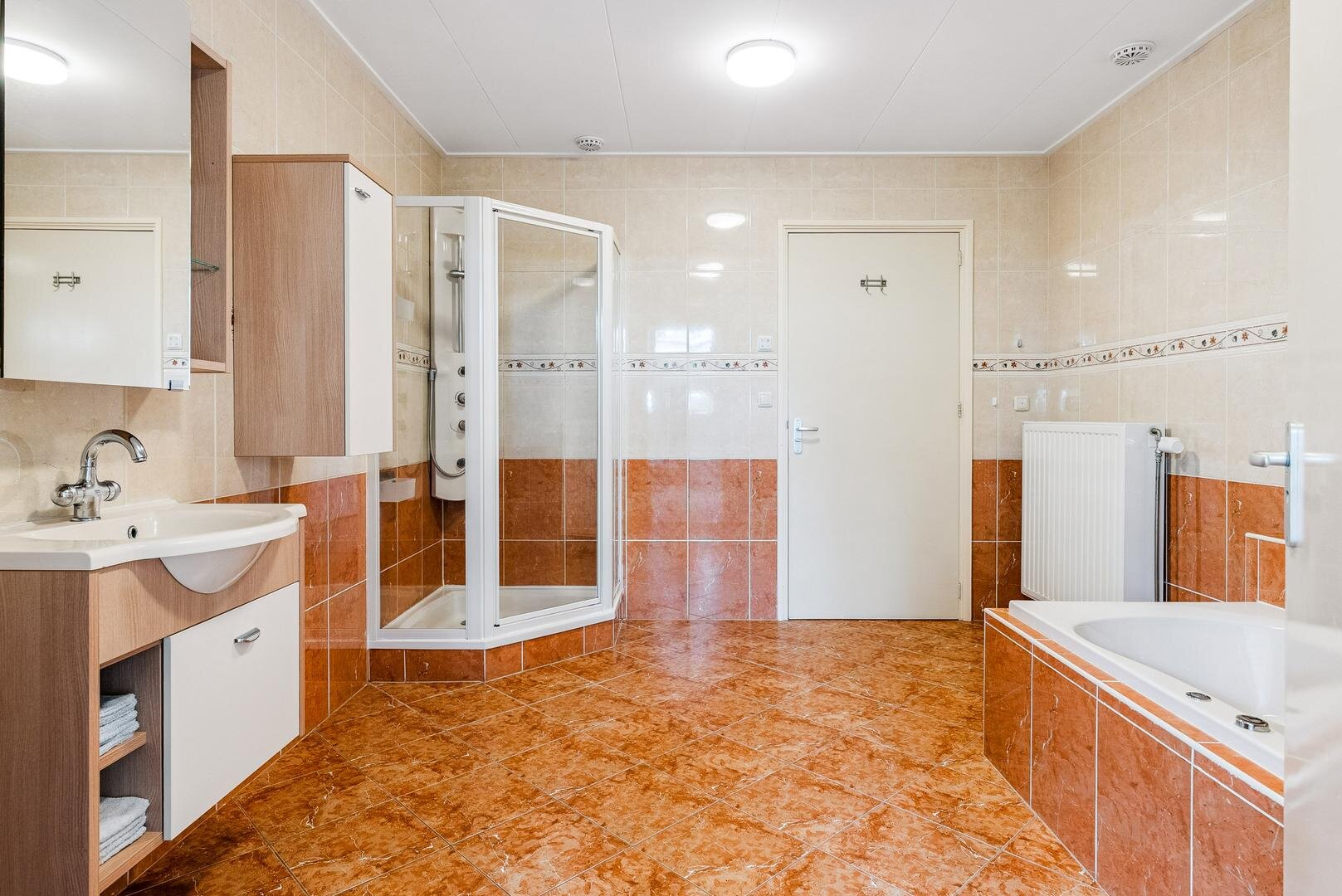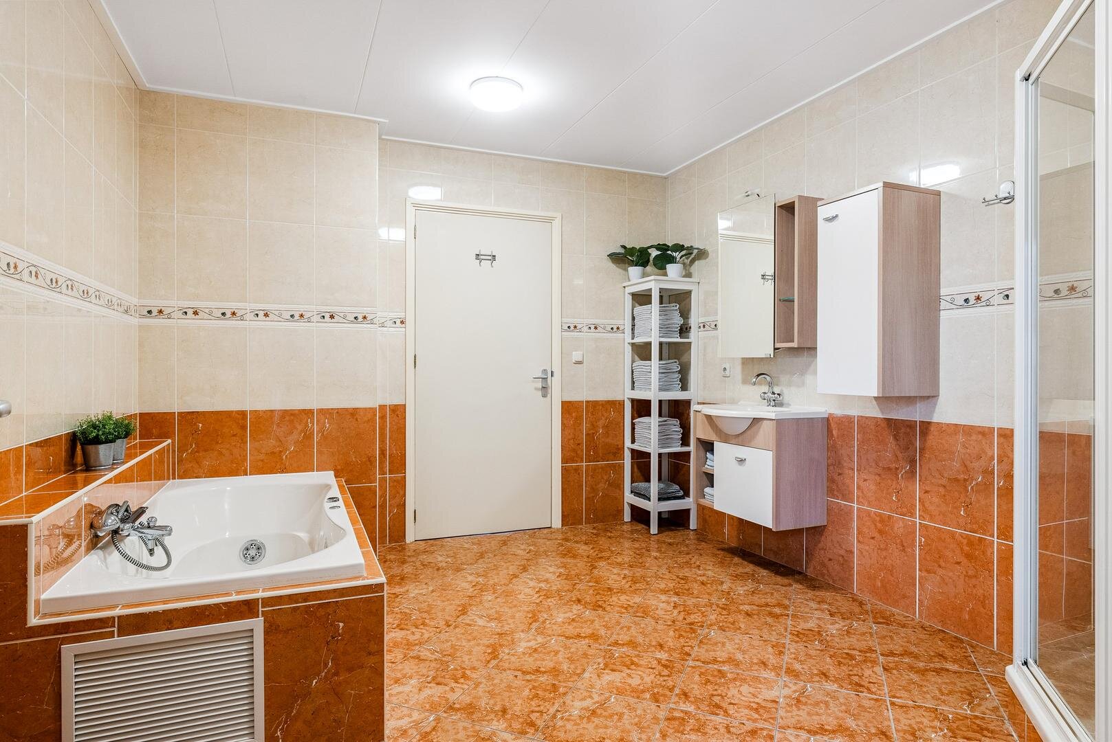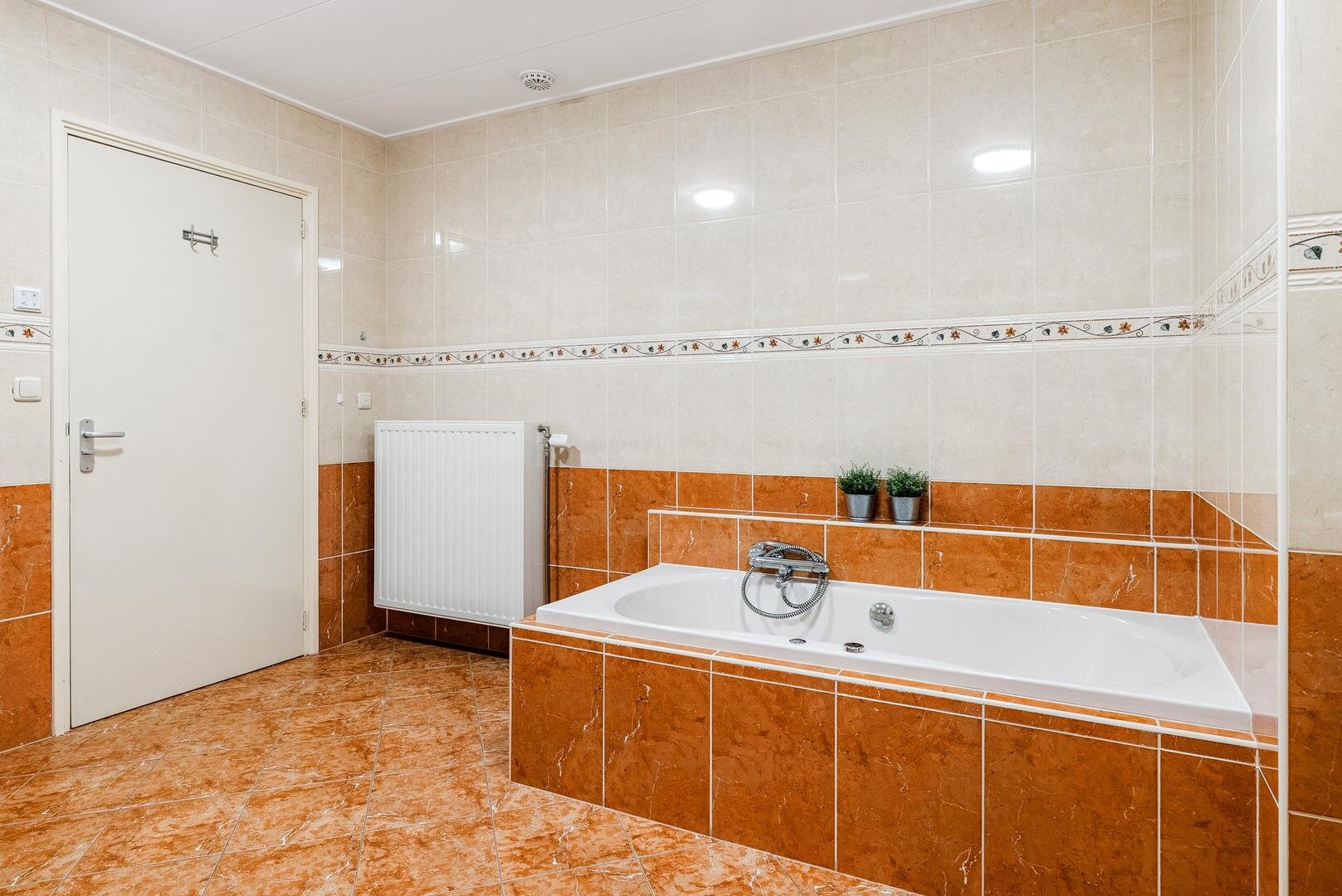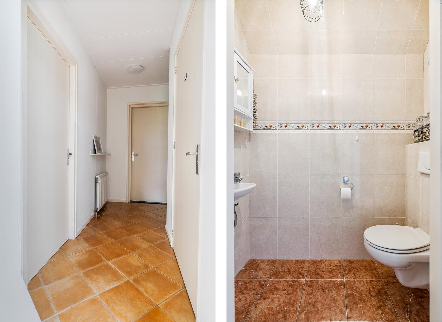 De lichte woon- en eetkamer vormen samen een sfeervol geheel en staan met elkaar in verbinding via karakteristieke schuifdeuren. Aansluitend bevindt zich de ruime woonkeuken met openslaande terrasdeuren en vernieuwde inbouwapparatuur, een heerlijke plek om uitgebreid te koken en samen te genieten. Daarnaast vind je een ruime badkamer met ligbad, douche en wastafel, separaat toilet en een praktische bijkeuken met plaats voor het witgoed. Aan de voorzijde van de woning ligt de royale masterbedroom, voorzien van een laminaatvloer, vaste kasten en een fijne plek voor een (thuis)werkplek. Als extra beschikt de woning bovendien over een handig keldertje voor provisie of opslag.