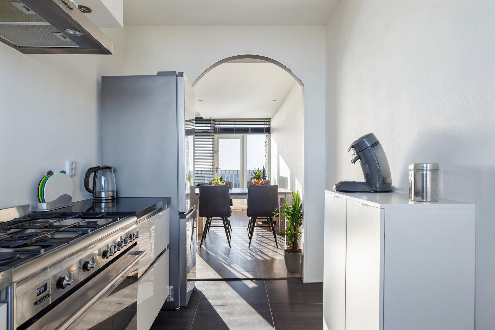 De moderne open keuken is uitgerust met diverse inbouwapparatuur zoals vaatwasser, koken op gas en grote oven.