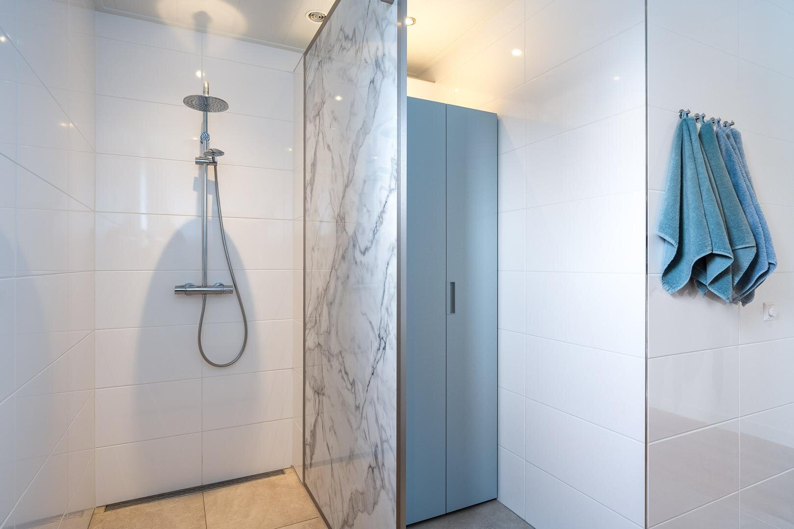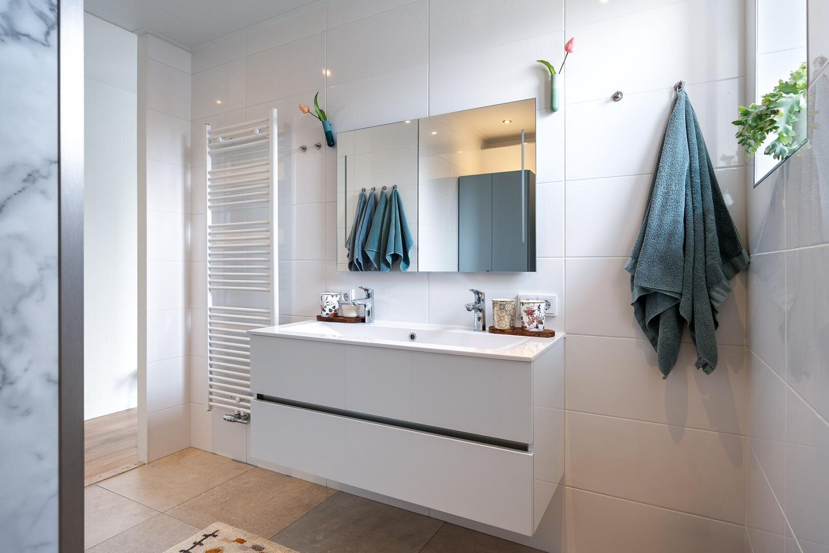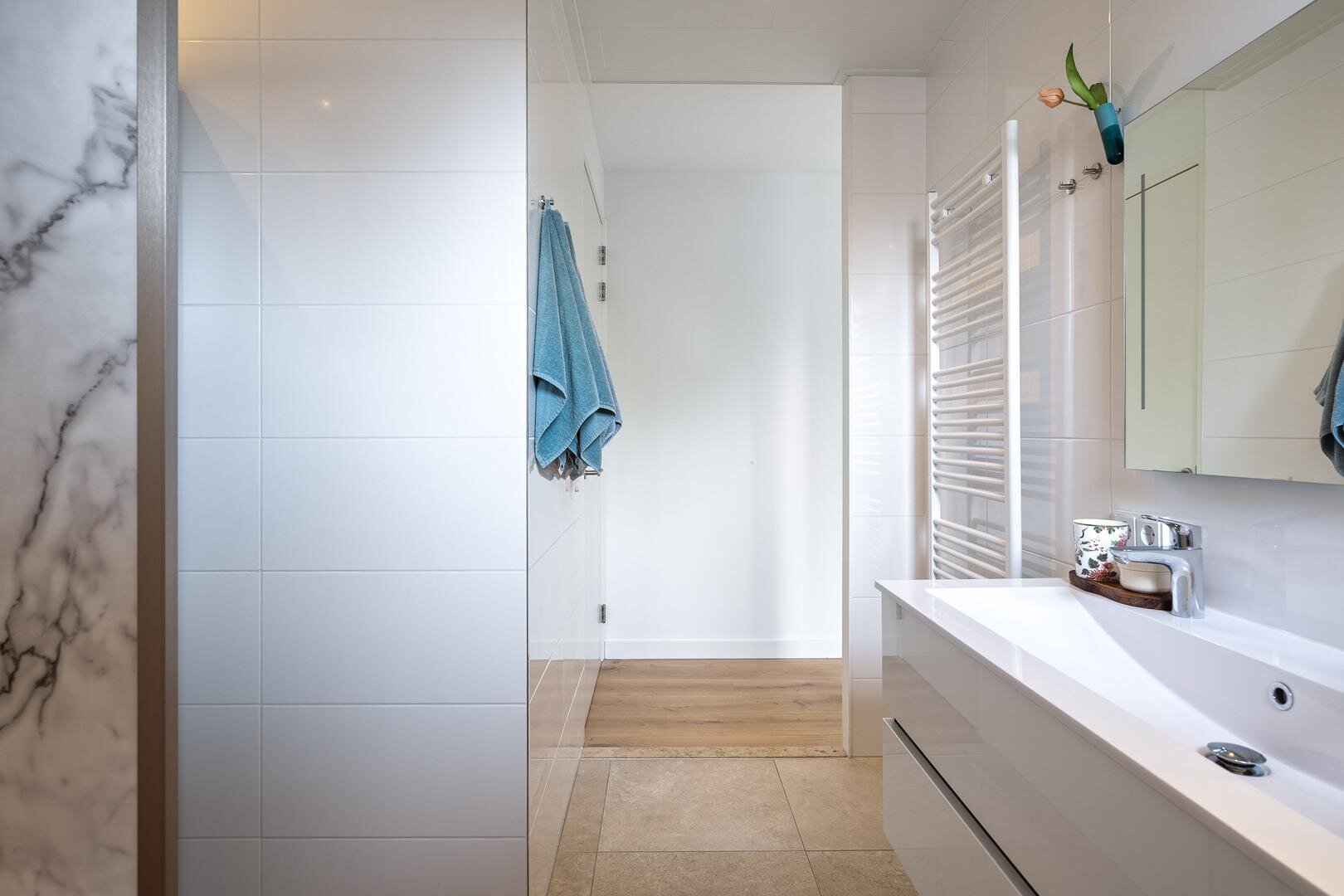 - De badkamer is modern uitgevoerd en beschikt over een inloopdouche en dubbele wastafel.