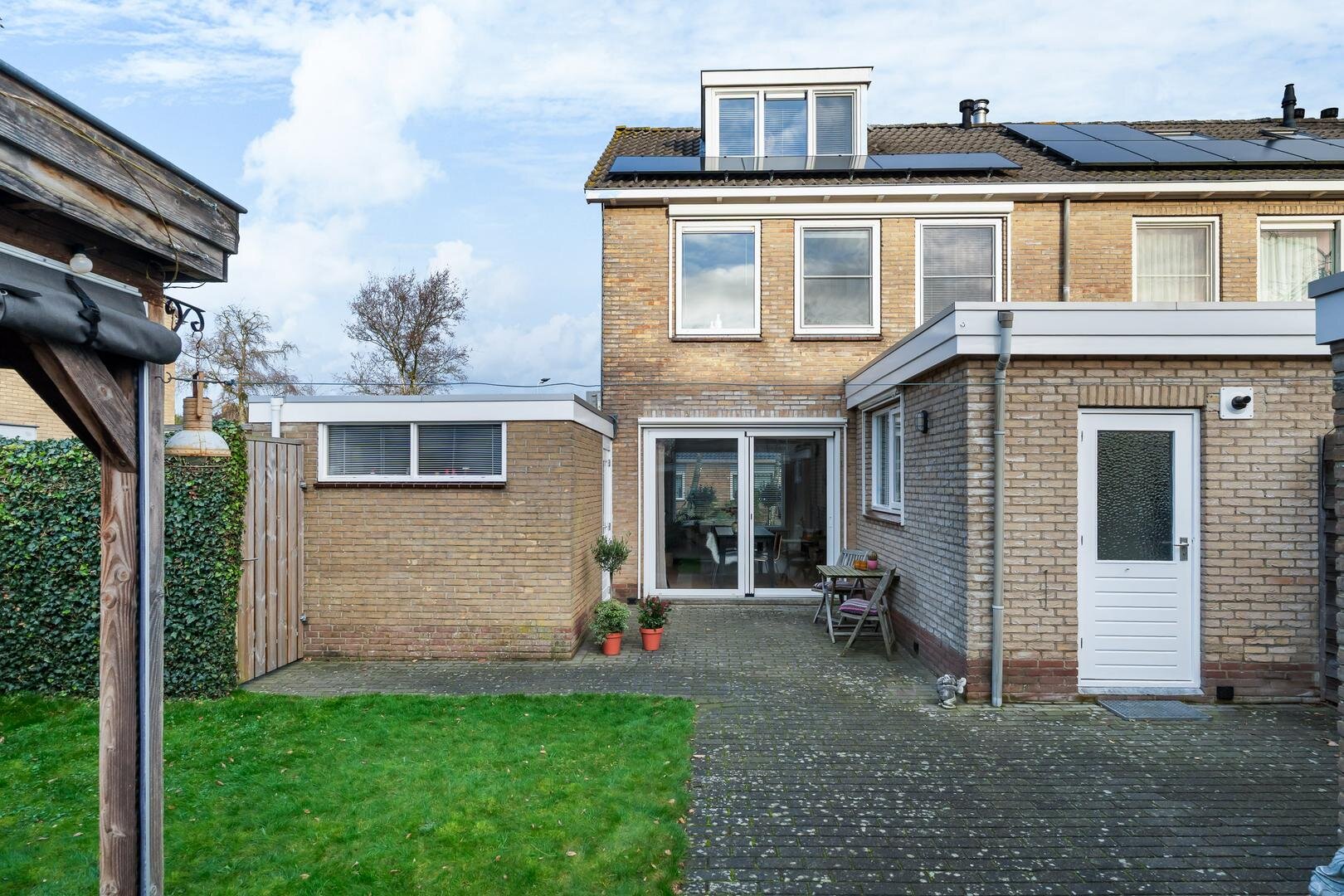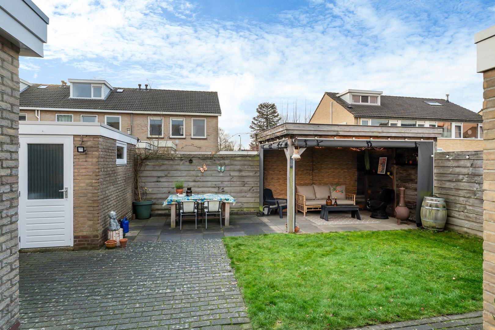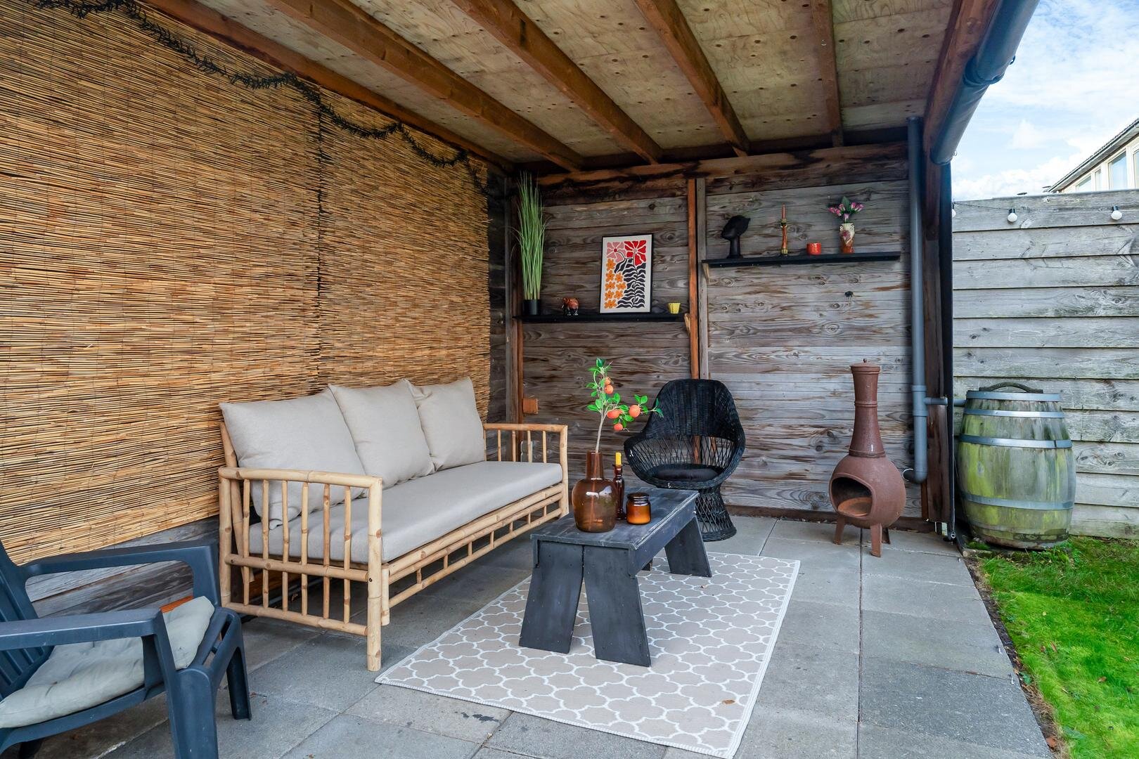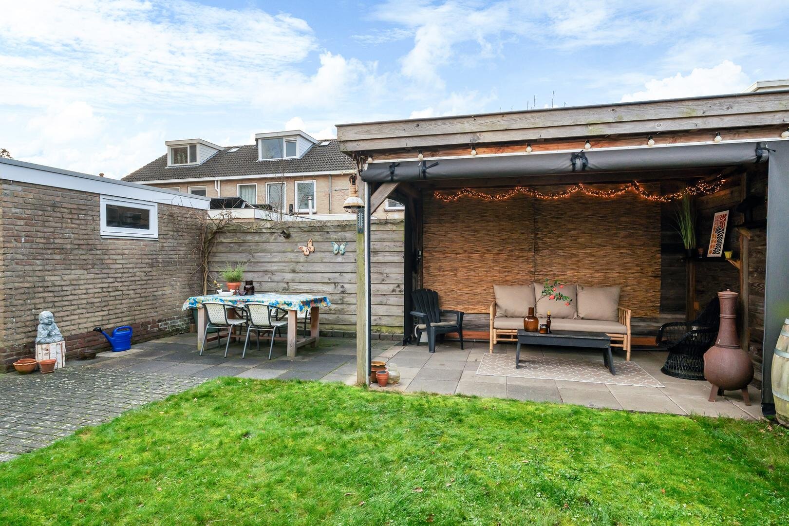 De achtertuin ligt pal op het zuiden en is een heerlijke plek om van de zon te genieten. De fraaie lariks houten overkapping maakt het mogelijk om tot in de late uurtjes buiten te zitten, perfect voor een goed glas wijn of een gezellig samenzijn. Verder is er een fietsenberging en veel privacy.