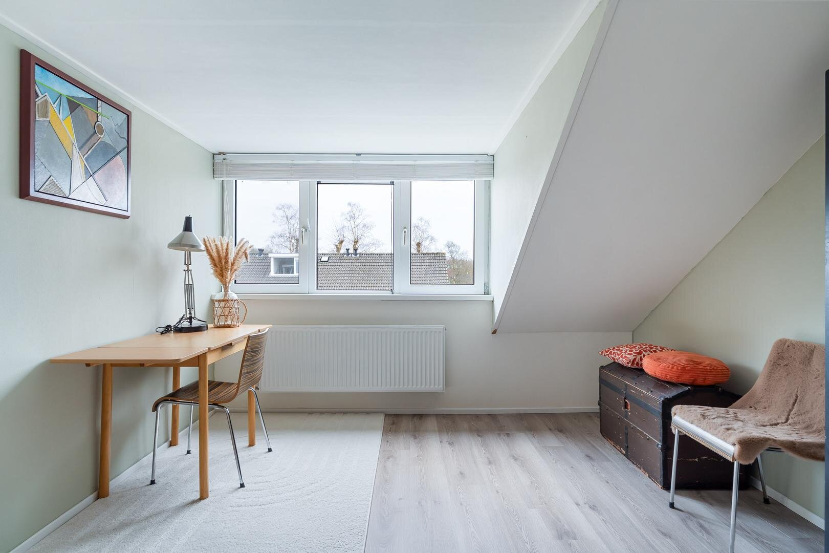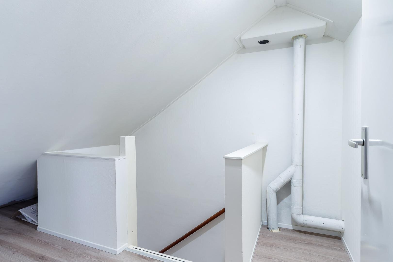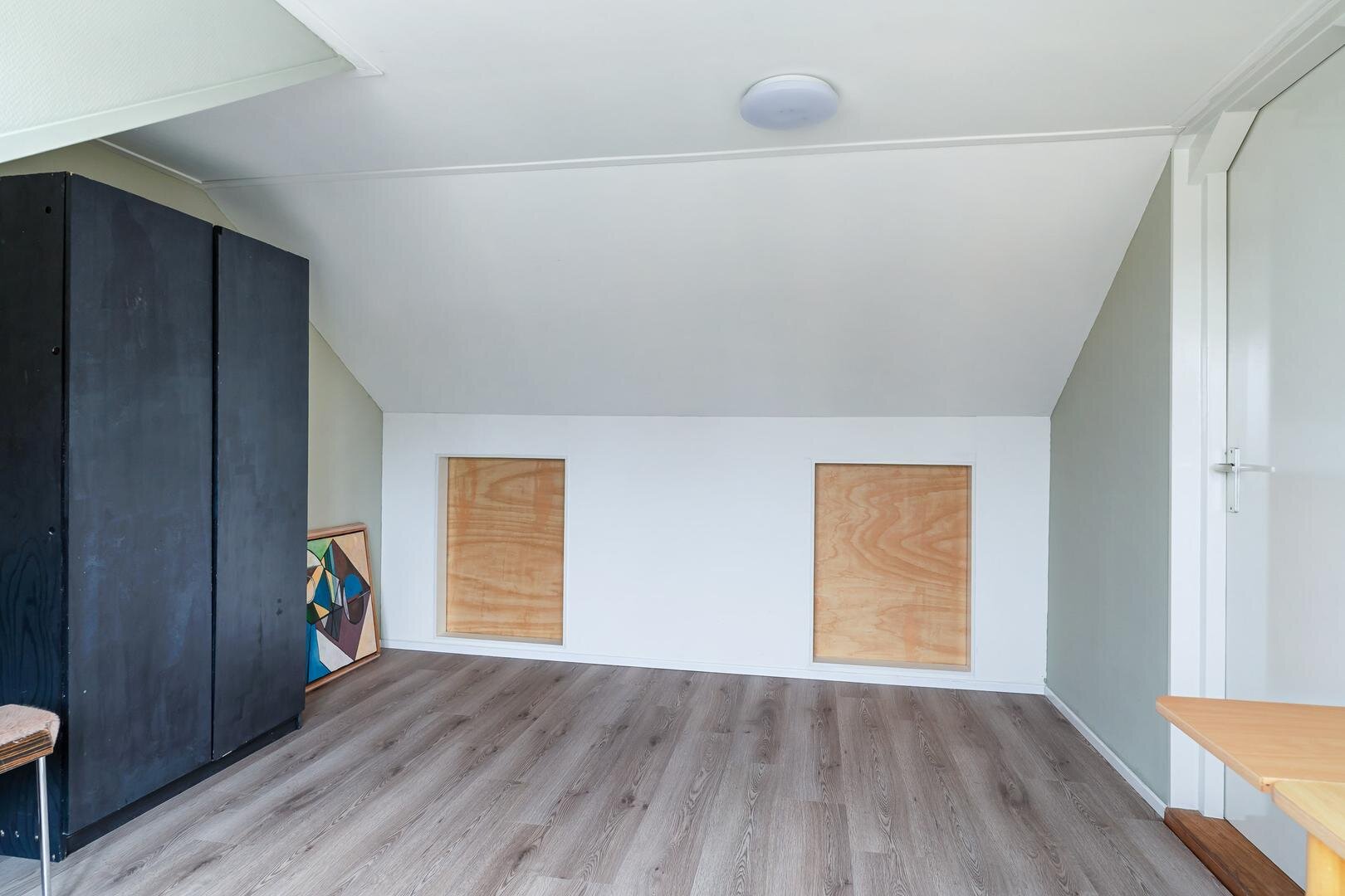 Via een vaste trap bereik je de tweede verdieping met de vierde slaapkamer, momenteel ingericht als thuiswerkplek. Dankzij de dakkapel is dit een volwaardige en lichte ruimte. Daarnaast is er volop bergruimte op de overloop en achter de knieschotten.