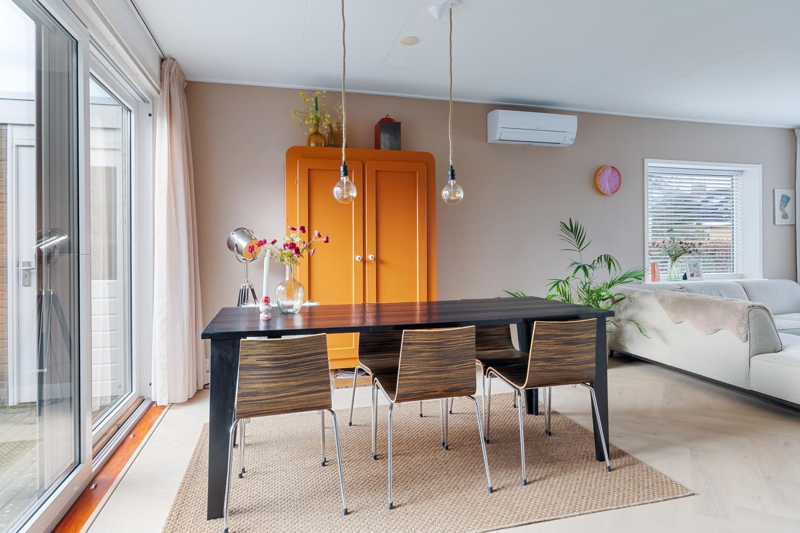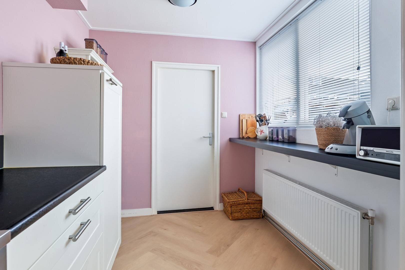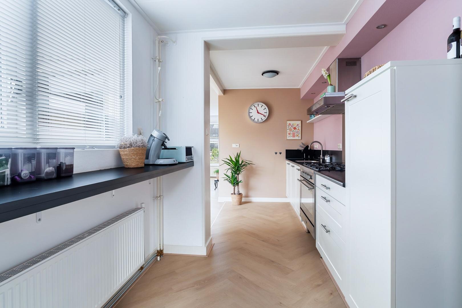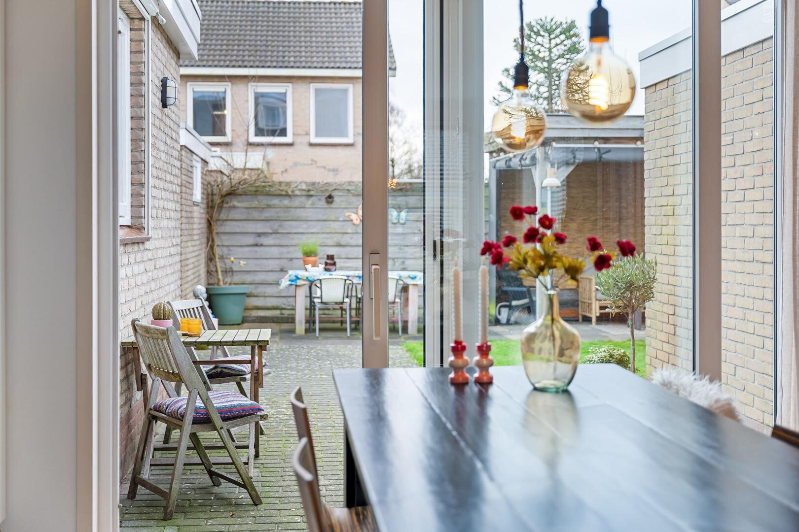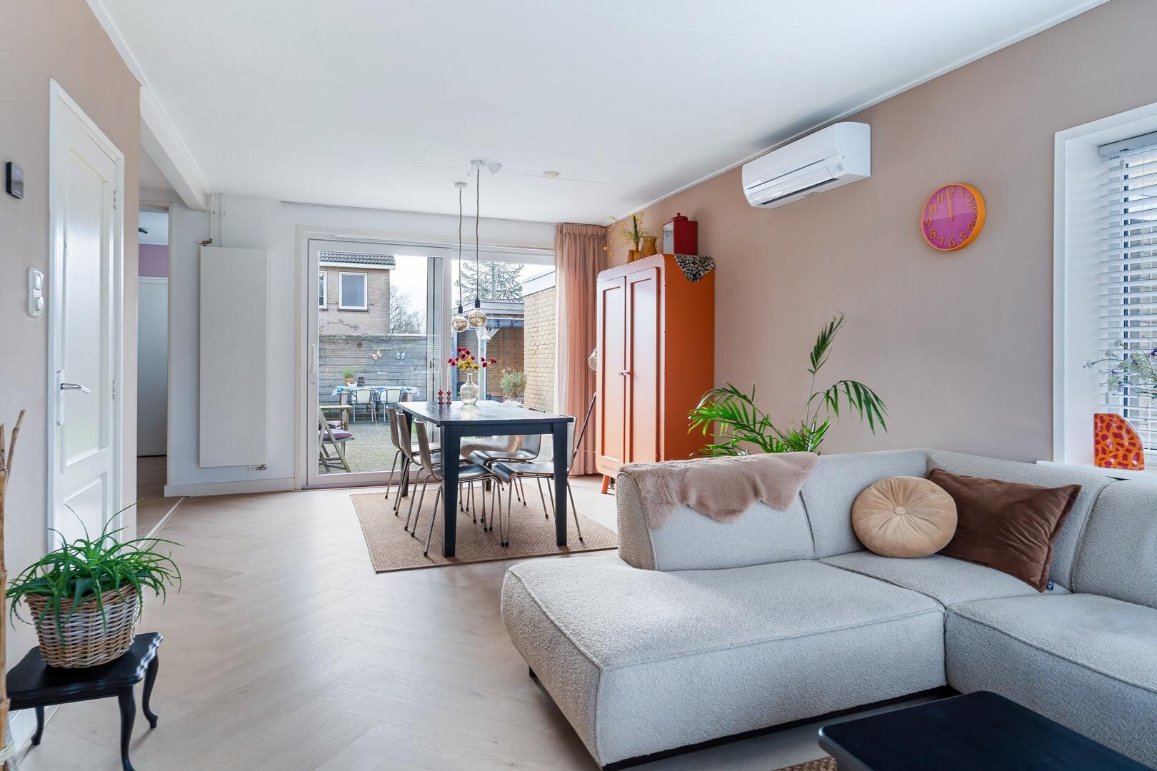 De grote kunststof schuifpui zorgt voor een fijn binnen-buiten gevoel en brengt je direct naar de zonnige achtertuin. Aansluitend bevindt zich de praktische bijkeuken met witgoedaansluitingen, cv-installatie (2025) en een loopdeur naar de tuin.