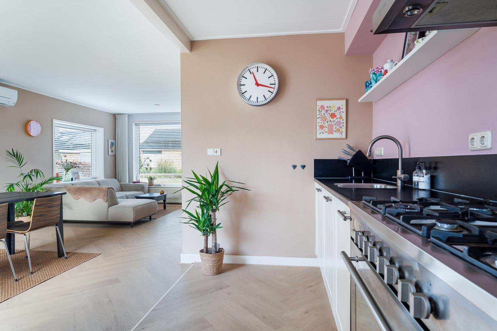 De woonkamer is een echte blikvanger: heerlijk licht dankzij de vele raampartijen en afgewerkt met een prachtige visgraat pvc-vloer. De strakke wanden en plafonds geven het geheel een moderne uitstraling. De open keuken staat in verbinding met het eetgedeelte en is uitgerust met diverse inbouwapparatuur, waaronder een 6-pits gasfornuis, oven en koelkast.