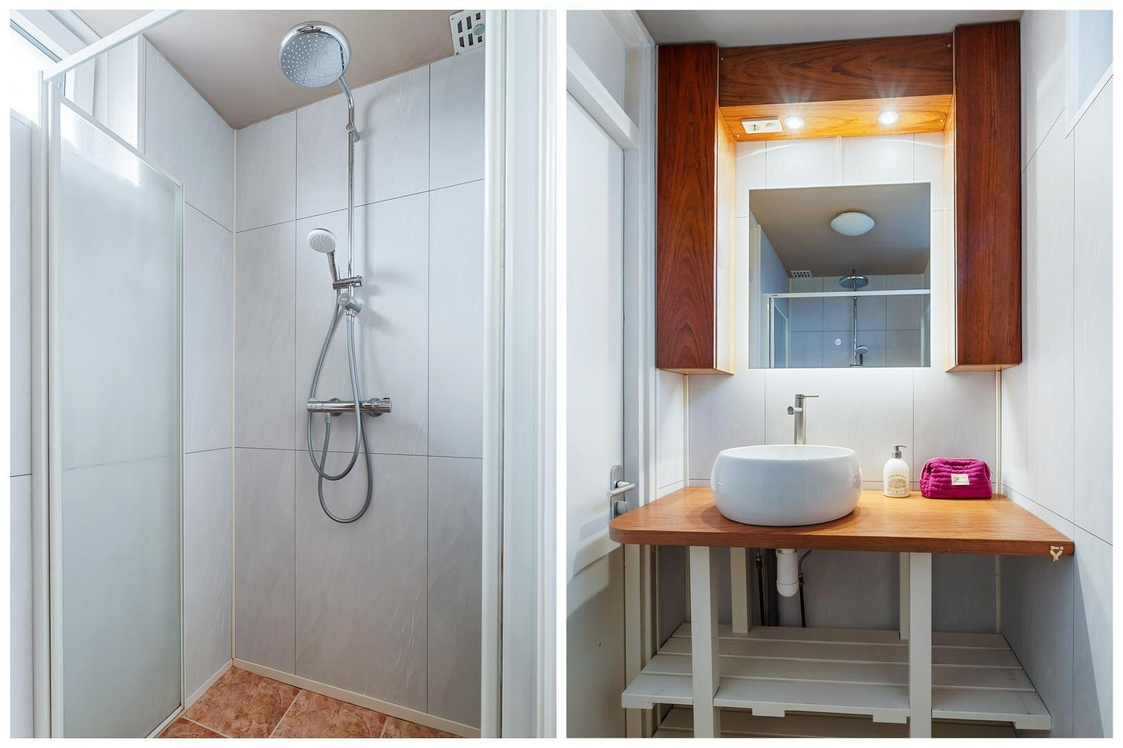 De badkamer is modern en compleet, met een inloopdouche, wastafelmeubel en vloerverwarming, een fijne luxe!