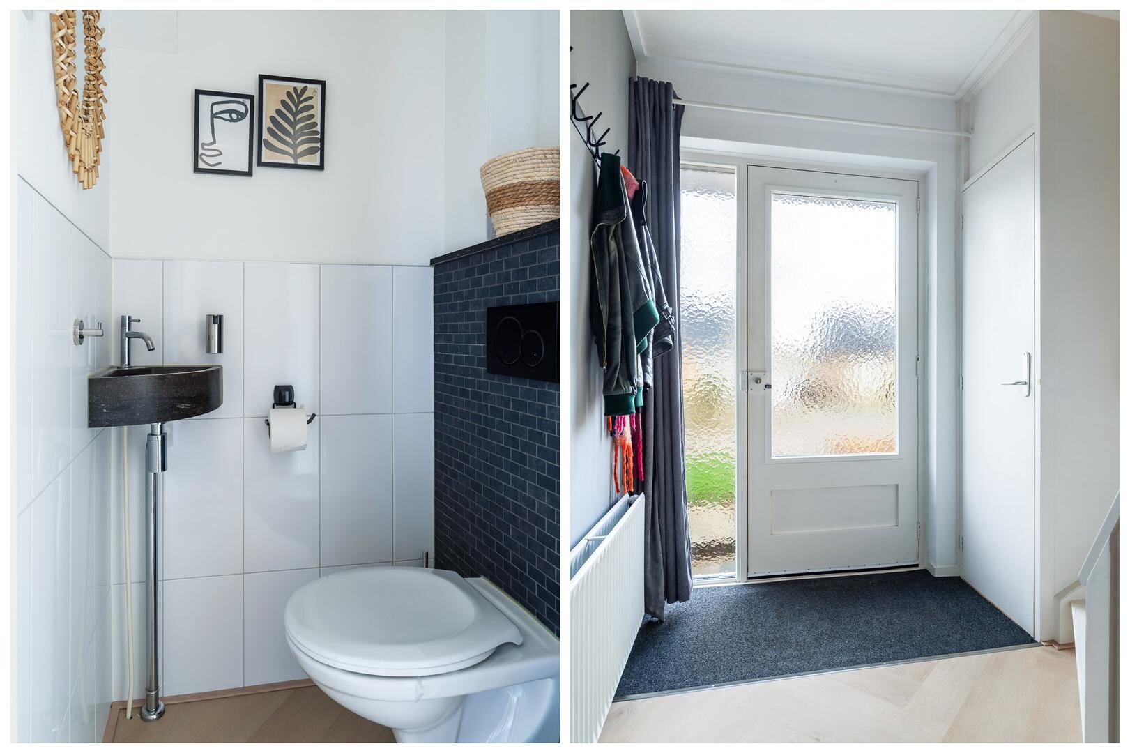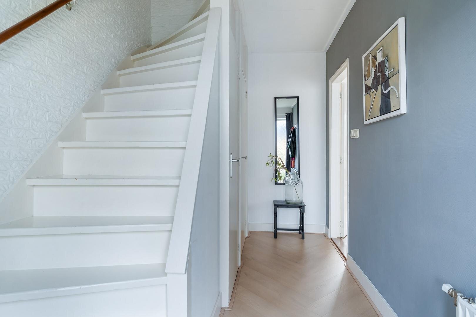 Via de ruime oprit met plek voor meerdere auto’s bereik je de garage met elektrisch bedienbare deur. De entree voelt direct prettig en verzorgd aan en biedt toegang tot het toilet, de meterkast, trapkast en de trap naar boven.