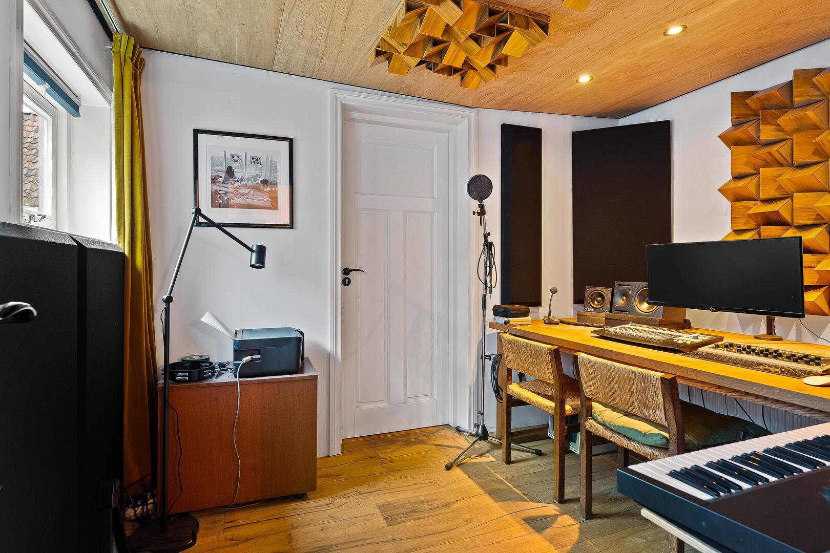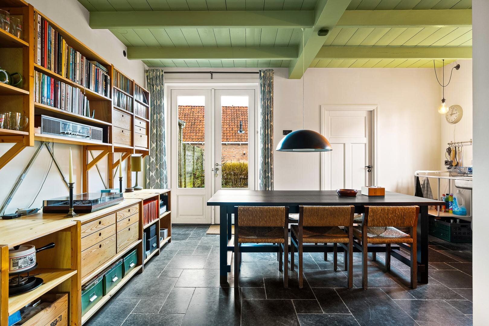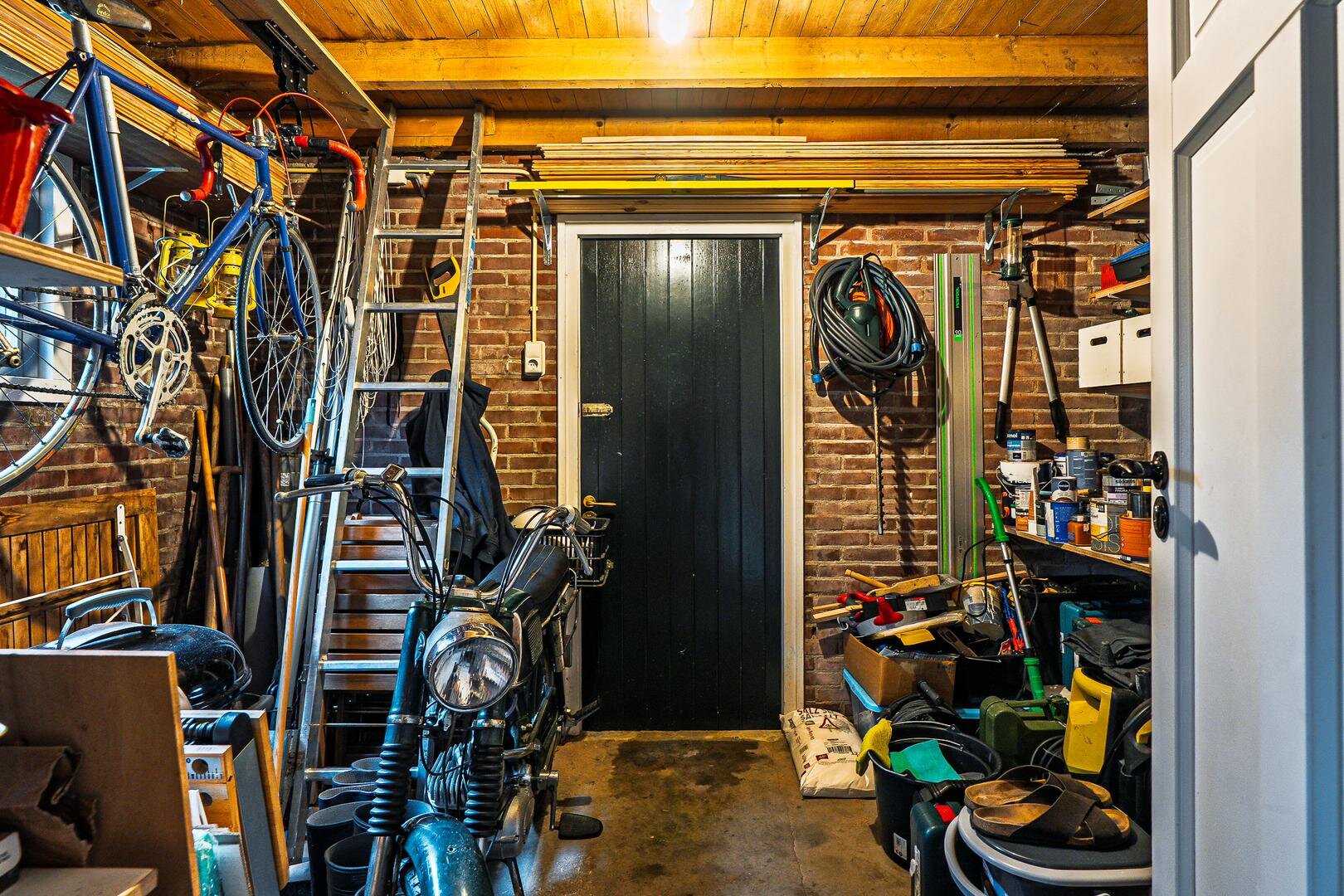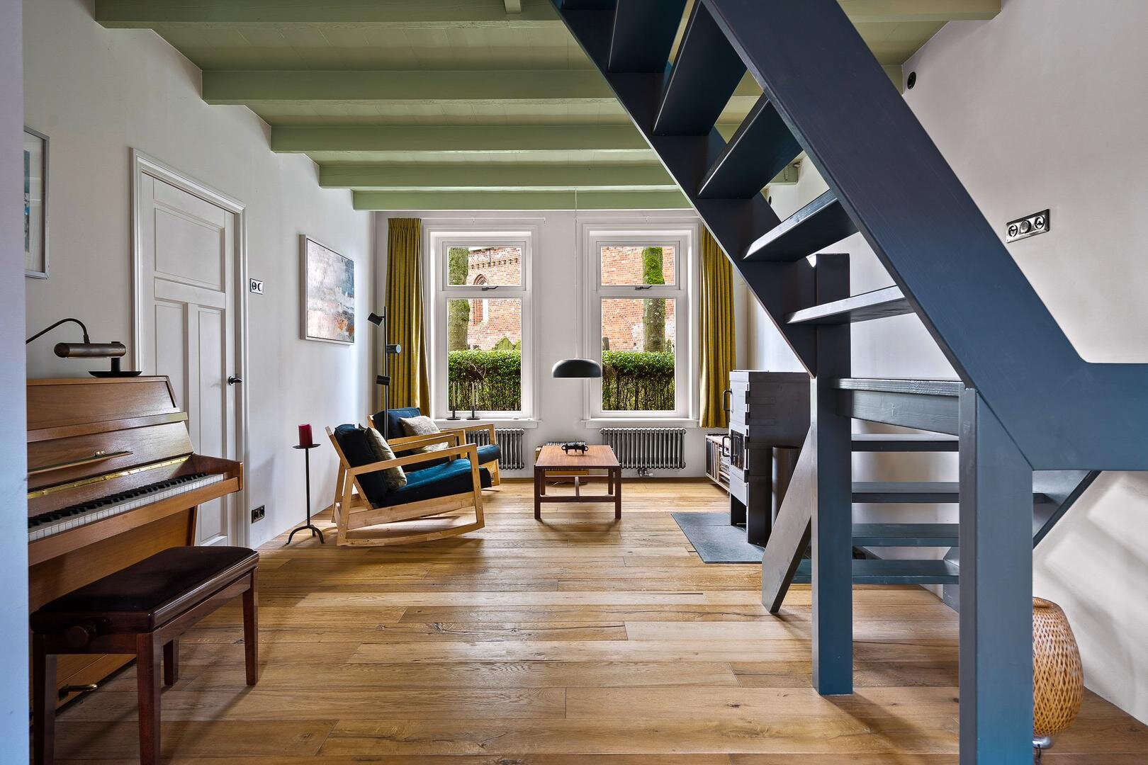 Je komt binnen in de hal met modern toilet en fonteintje, uitgevoerd in donkere tinten. Links stap je de woonkamer binnen, een fijne plek om de avond door te brengen, met zicht op de kerk aan de voorzijde. De trapopgang bevindt zich centraal in de ruimte. Aan de achterzijde vind je de woonkeuken met eettafel en keuken met inbouwapparatuur. Aansluitend is er een multifunctionele ruimte, momenteel in gebruik als muziekstudio, maar ook zeer geschikt als thuiswerkplek of hobbyruimte. Helemaal achterin bevindt zich de praktische berging, ideaal voor fietsen en extra opslag.