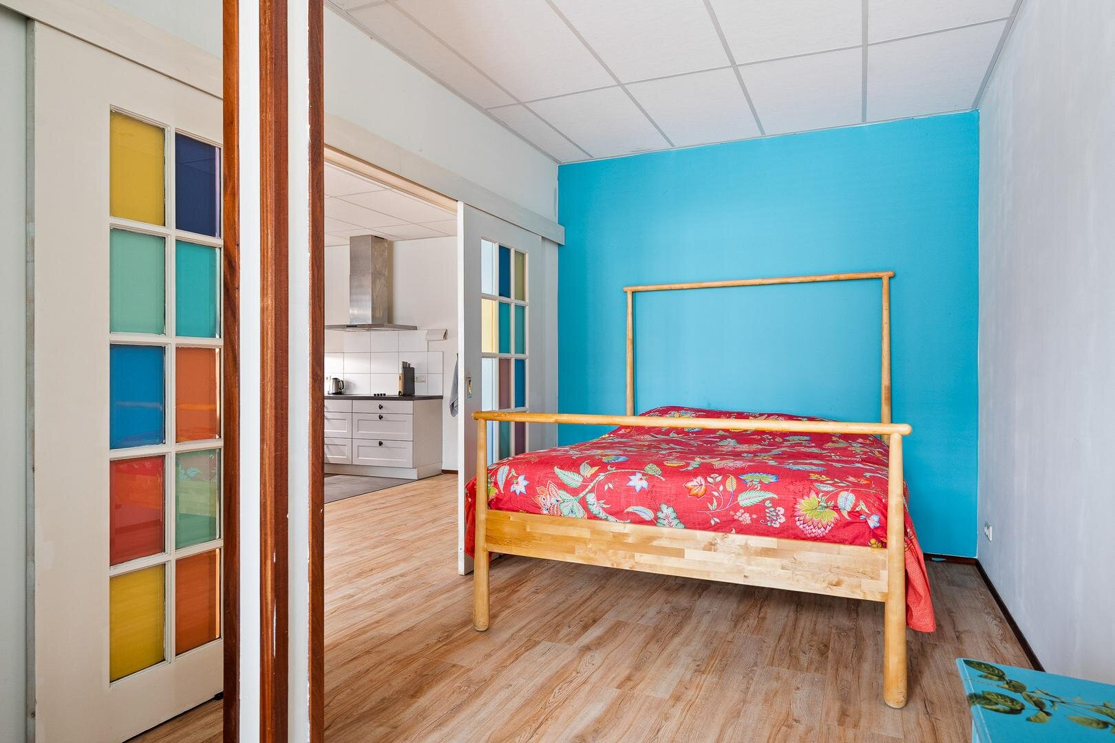 Grenzend aan de woonkamer ligt de eerste slaapkamer, bereikbaar via elegante schuifdeuren met glas, voorzien van gekleurde folie. Hier is royaal plaats voor een tweepersoonsbed en voldoende opbergruimte of kastenwand voor kleding.