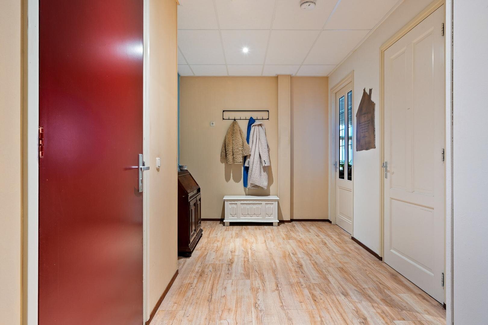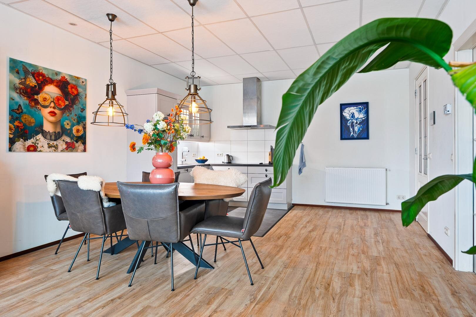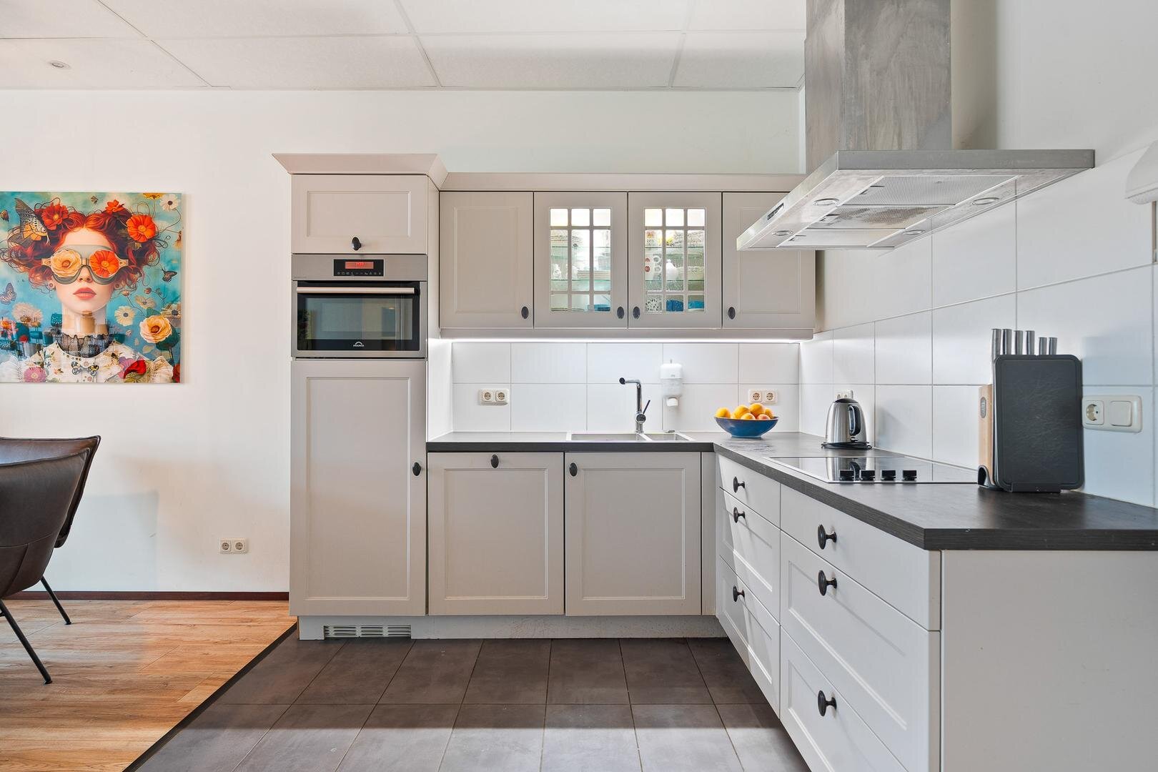 Binnenkomst in een ruime hal met volop plaats voor jassen en schoenen, met de meterkast aan de rechterzijde. Vanuit hier stap je de open leefruimte binnen: een lichte woonkamer met keuken van circa 41 m². De L-vormige keuken is uitgerust met een koelkast, vaatwasser, combi-oven en inductiekookplaat en vormt een mooi geheel met de woonkamer. De laminaatvloer in de living en de tegelvloer in de keuken zorgen voor een praktische en verzorgde uitstraling.