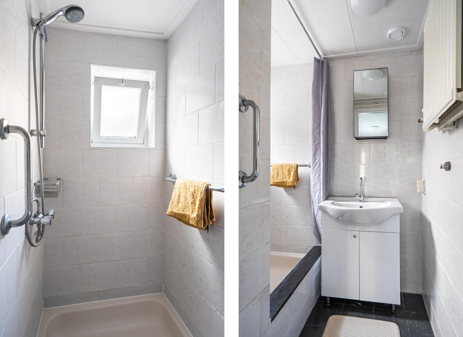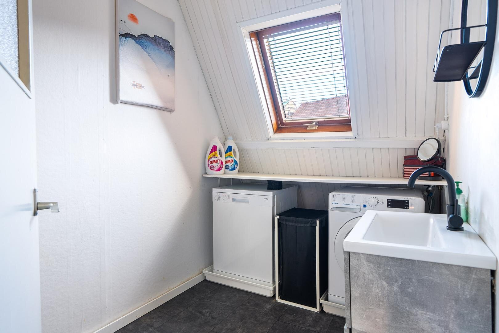 Een aparte witgoedruimte met vaste wastafel (koud water) en onderhoudsvriendelijke plavuizenlaminaat vloer. Deze ruimte biedt ook de mogelijkheid als extra slaapkamer.