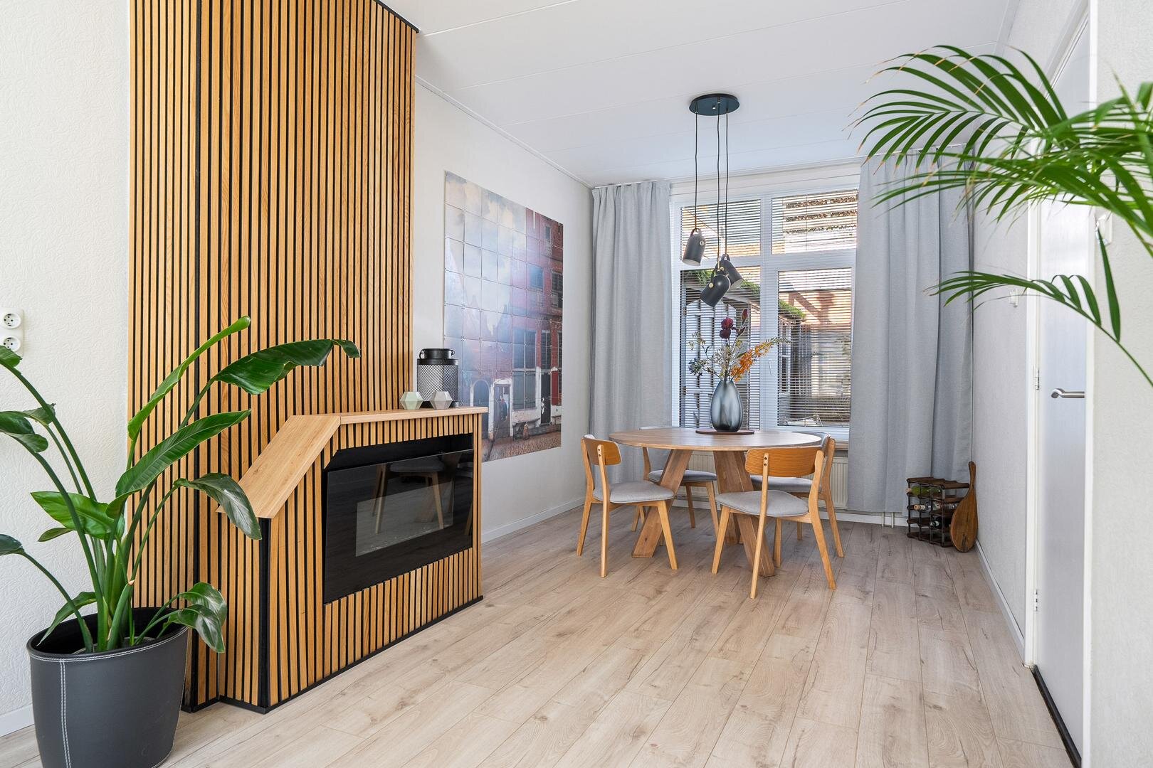 De woonkamer is een echte eyecatcher dankzij de karakteristieke erker en de elektrische designhaard die direct warmte en sfeer brengt. De moderne laminaatvloer loopt strak door en de vloer is extra geïsoleerd met schelpen.