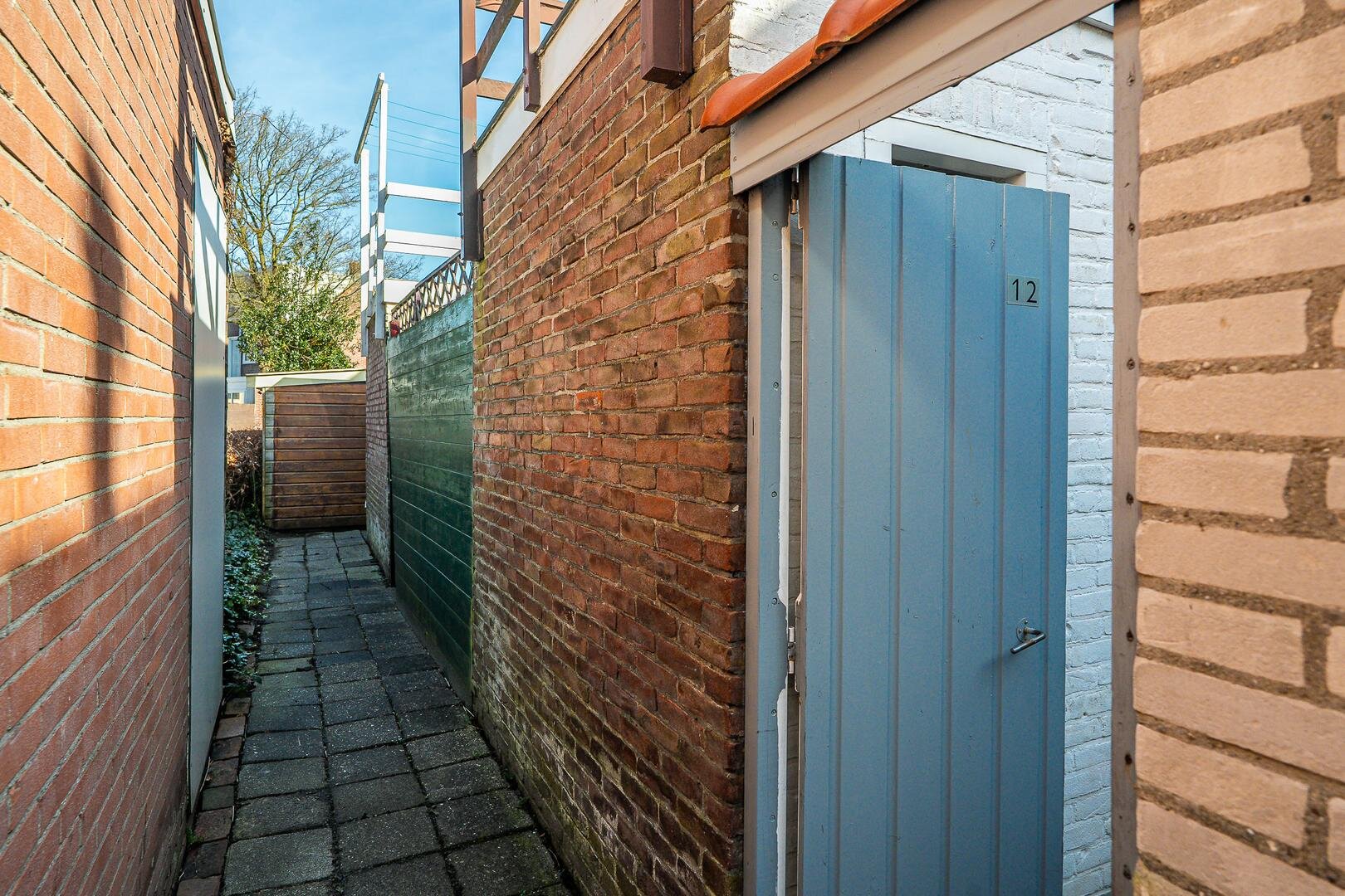 Een onderhoudsvrije achtertuin met achterom en een buitenkraan. Ook is er een praktische berging voor het stallen van fietsen en een handige kast voor al je gereedschap.