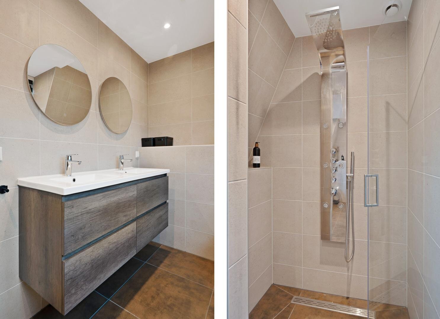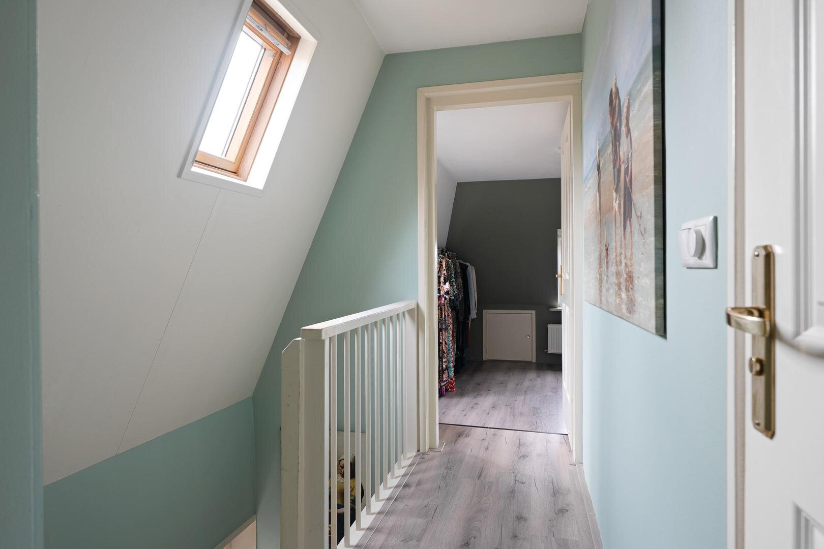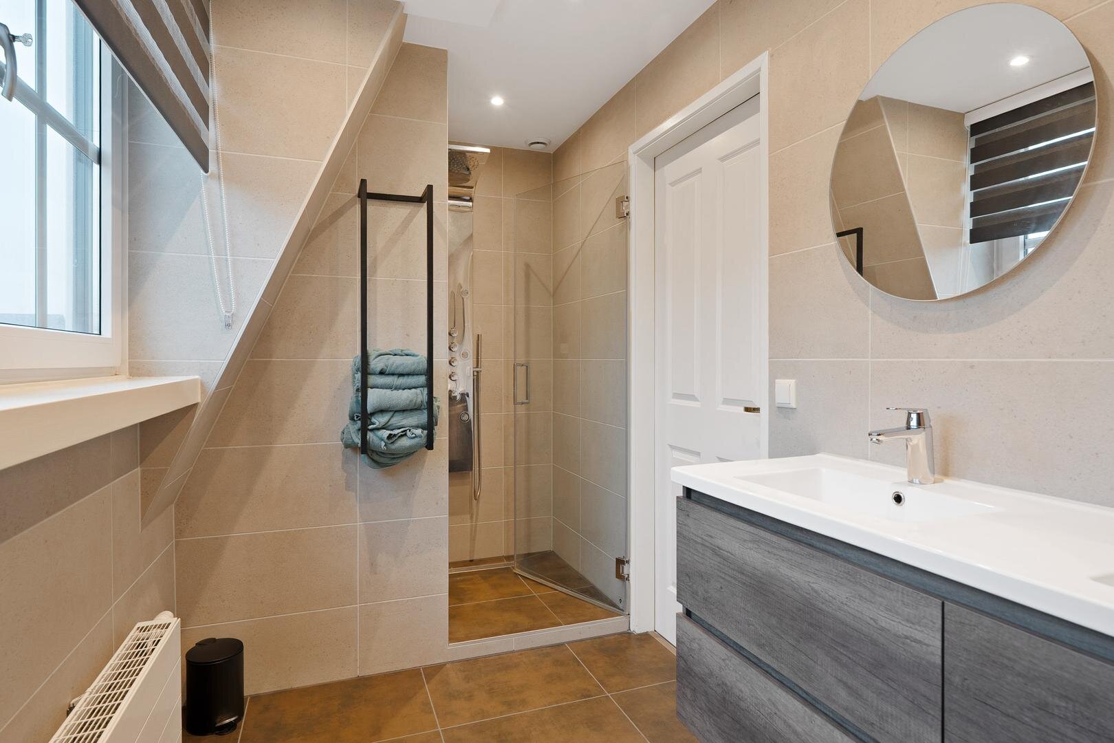 Op de verdieping vind je drie slaapkamers van mooi formaat en een moderne badkamer met toilet, dubbele wastafel en inloopdouche. Hierdoor is deze verdieping prettig in balans.