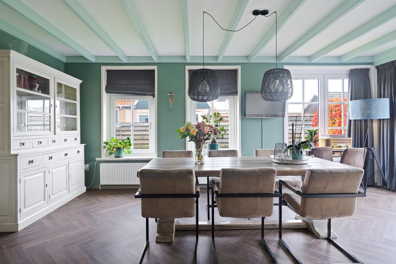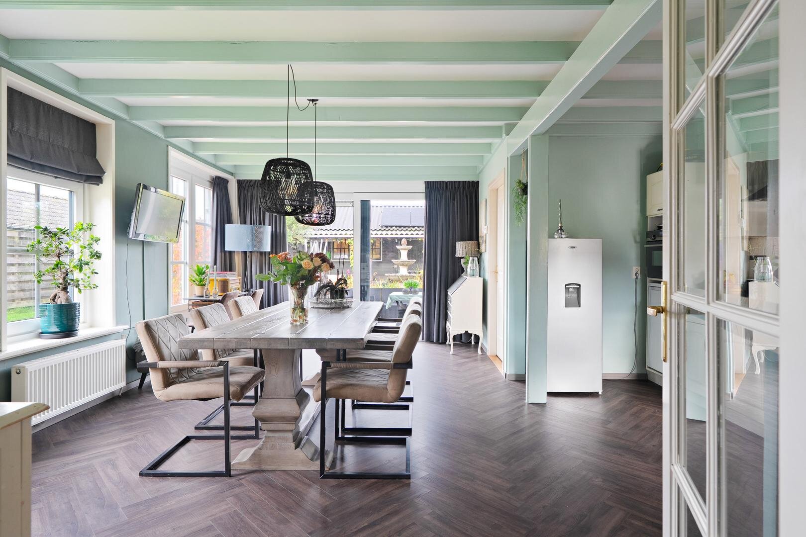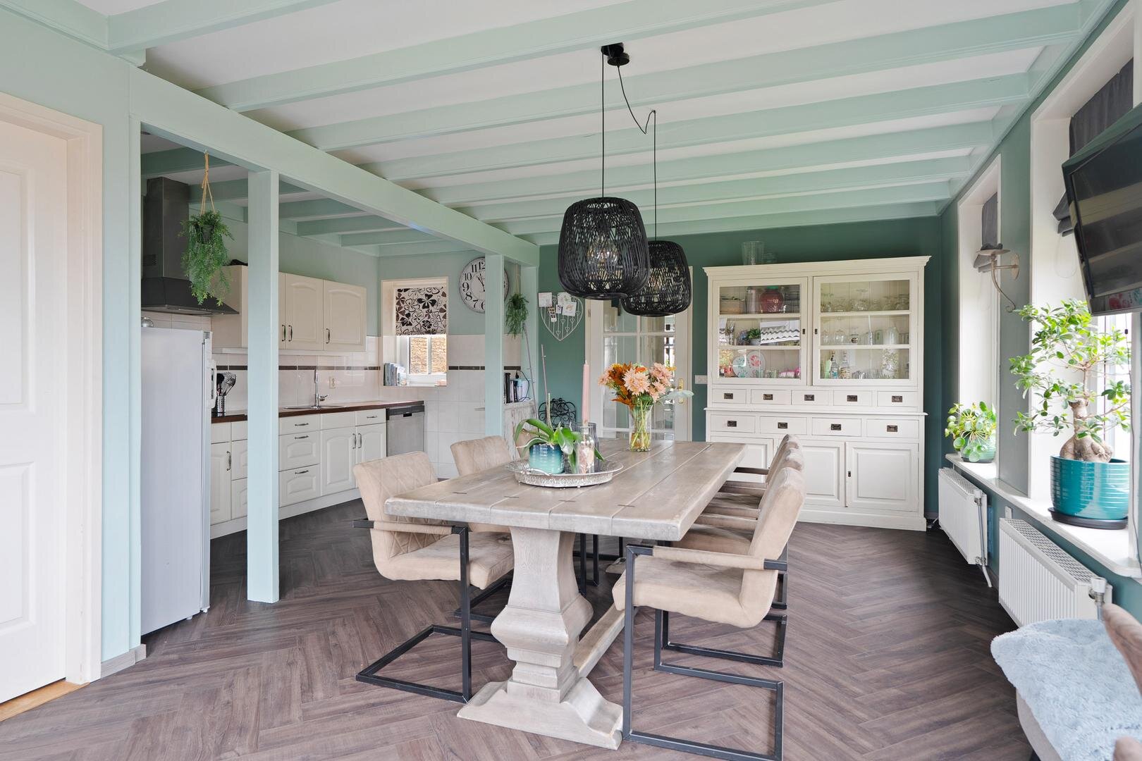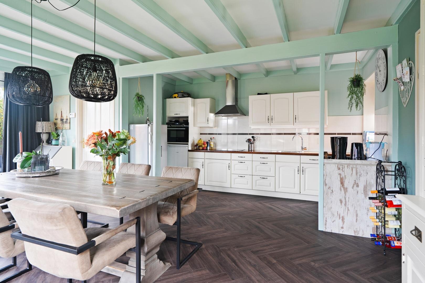 Met een woonoppervlakte van 118 m² op een perceel van 236 m² is dit een woning die direct goed voelt. De indeling is prettig: het woongedeelte en de keuken zijn van elkaar gescheiden, waardoor beide ruimtes hun eigen sfeer behouden. De keuken is het hart van het huis voorzien van een prachtige visgraatvloer, hoge plafonds met zichtbare oude balken, en genoeg plek om samen te koken en te genieten.