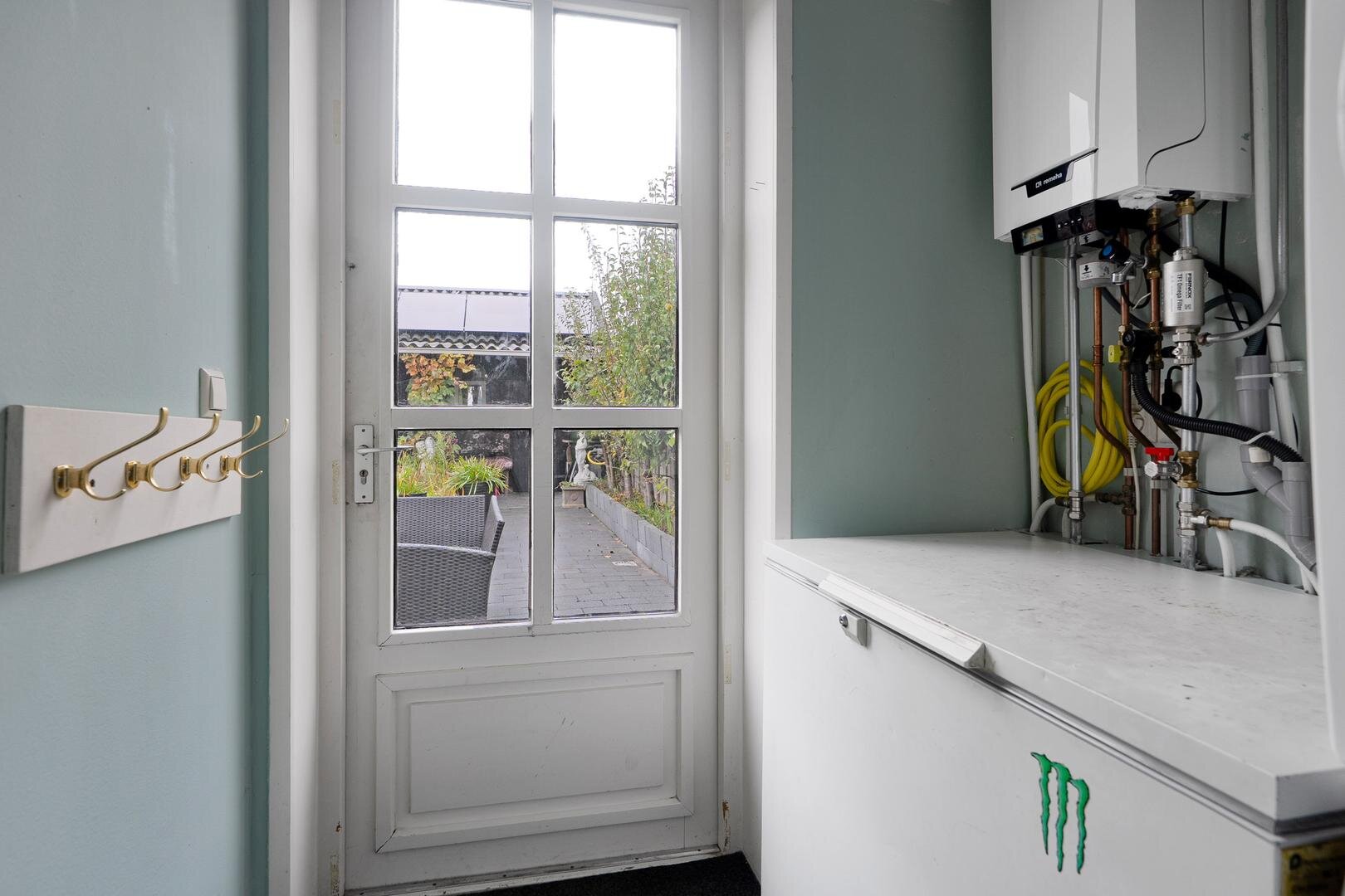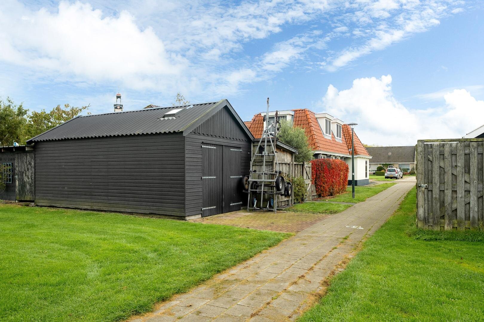 De tuin ligt op het noordwesten: heerlijk om op zomeravonden te genieten van de zon. Achter op het perceel staat een ruime, geïsoleerde schuur met water, stroom, verwarming en een vliering. Perfect als hobbyruimte of als extra opslag.
