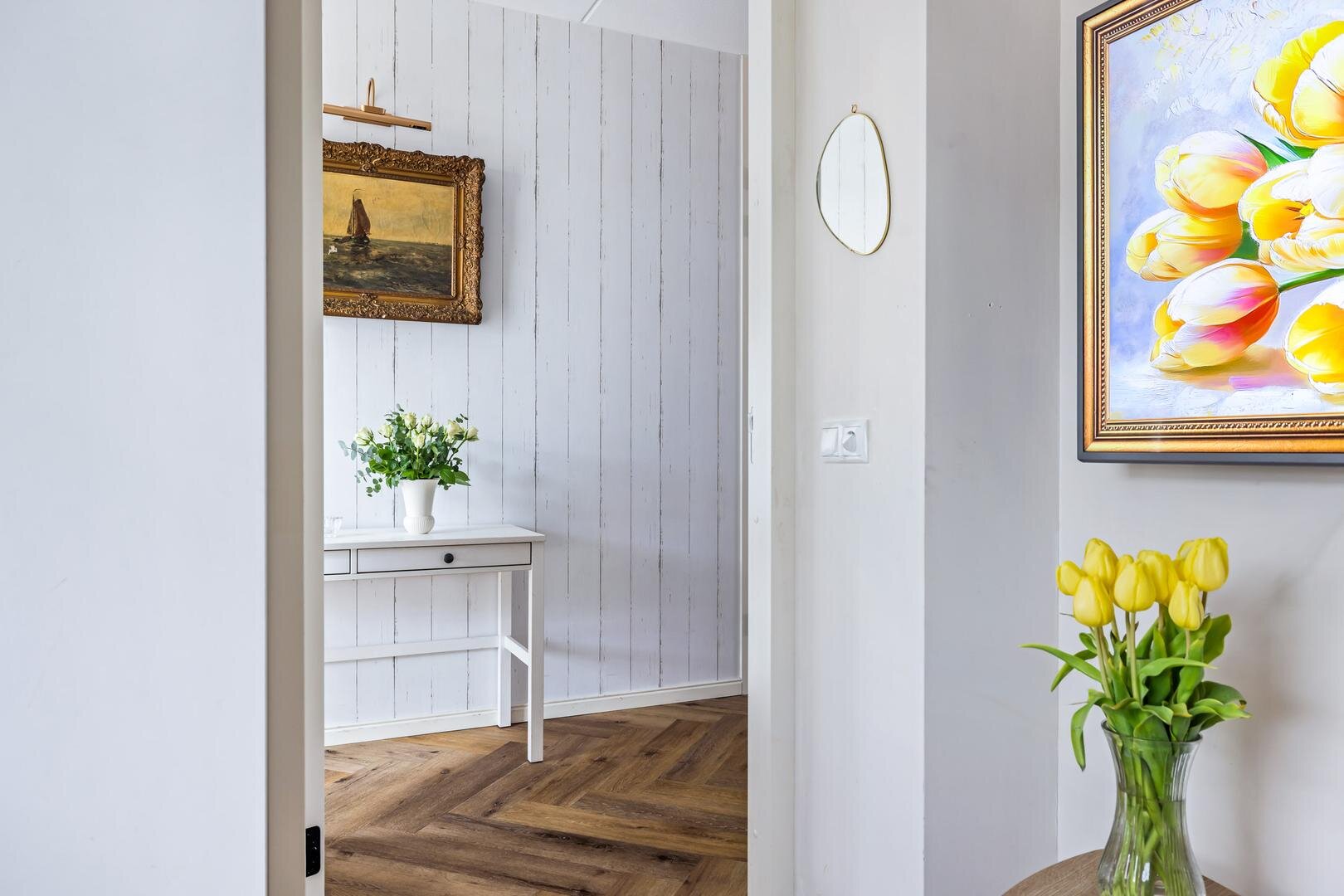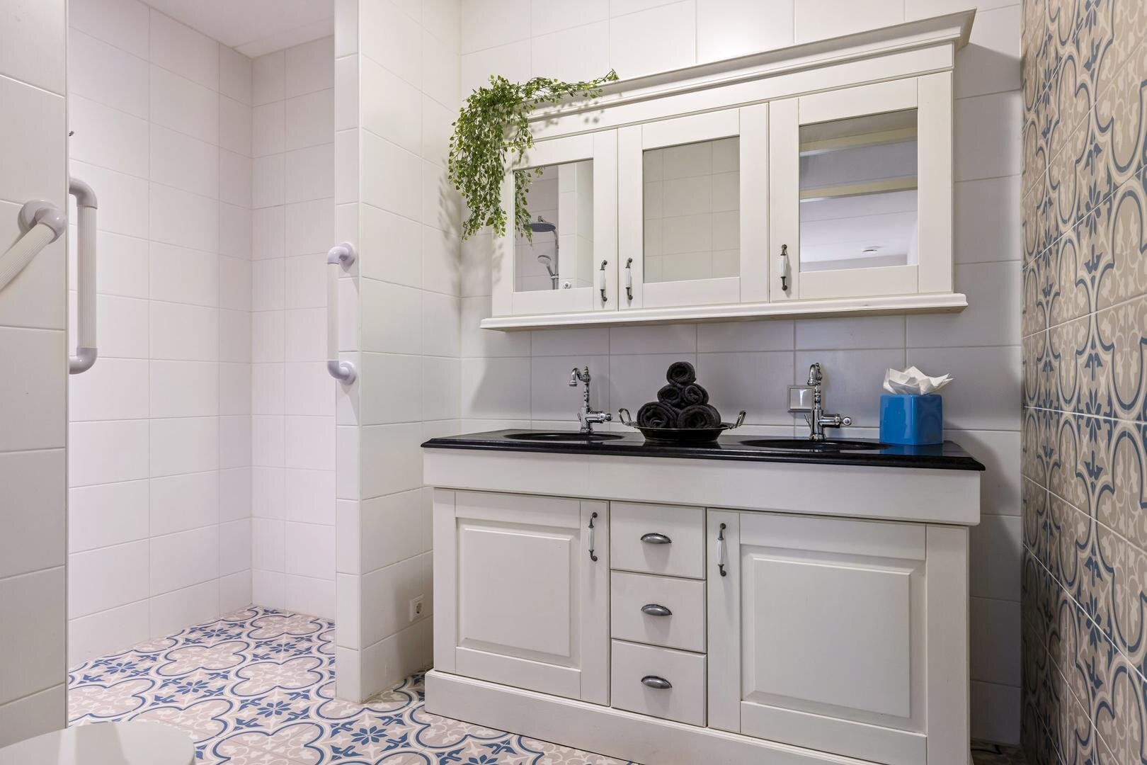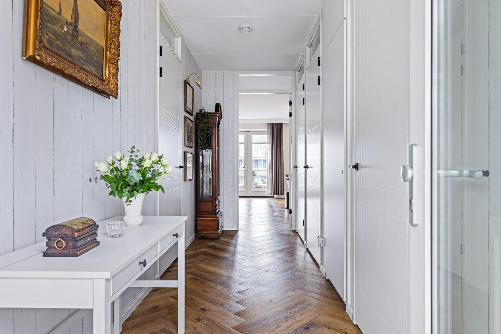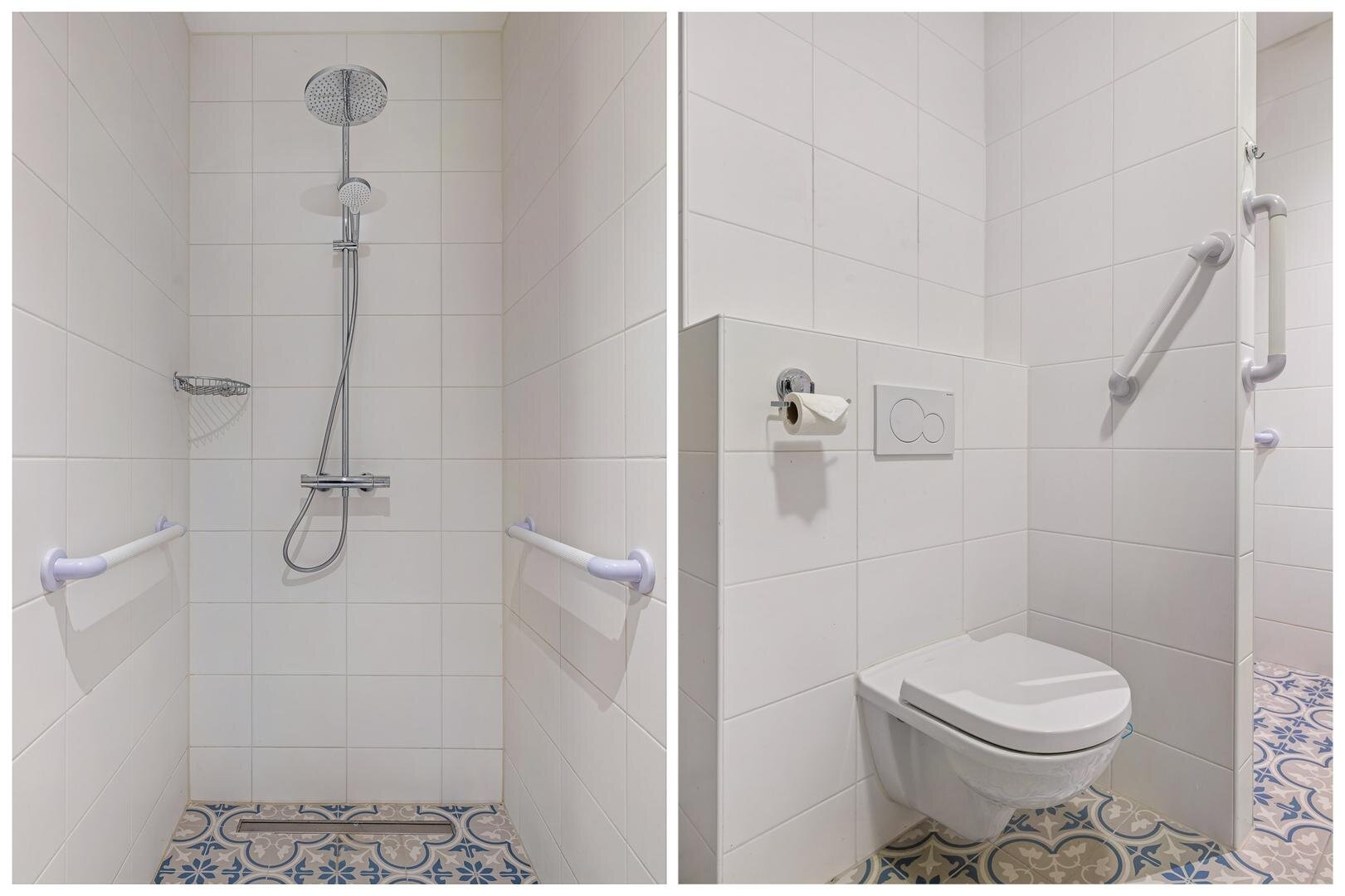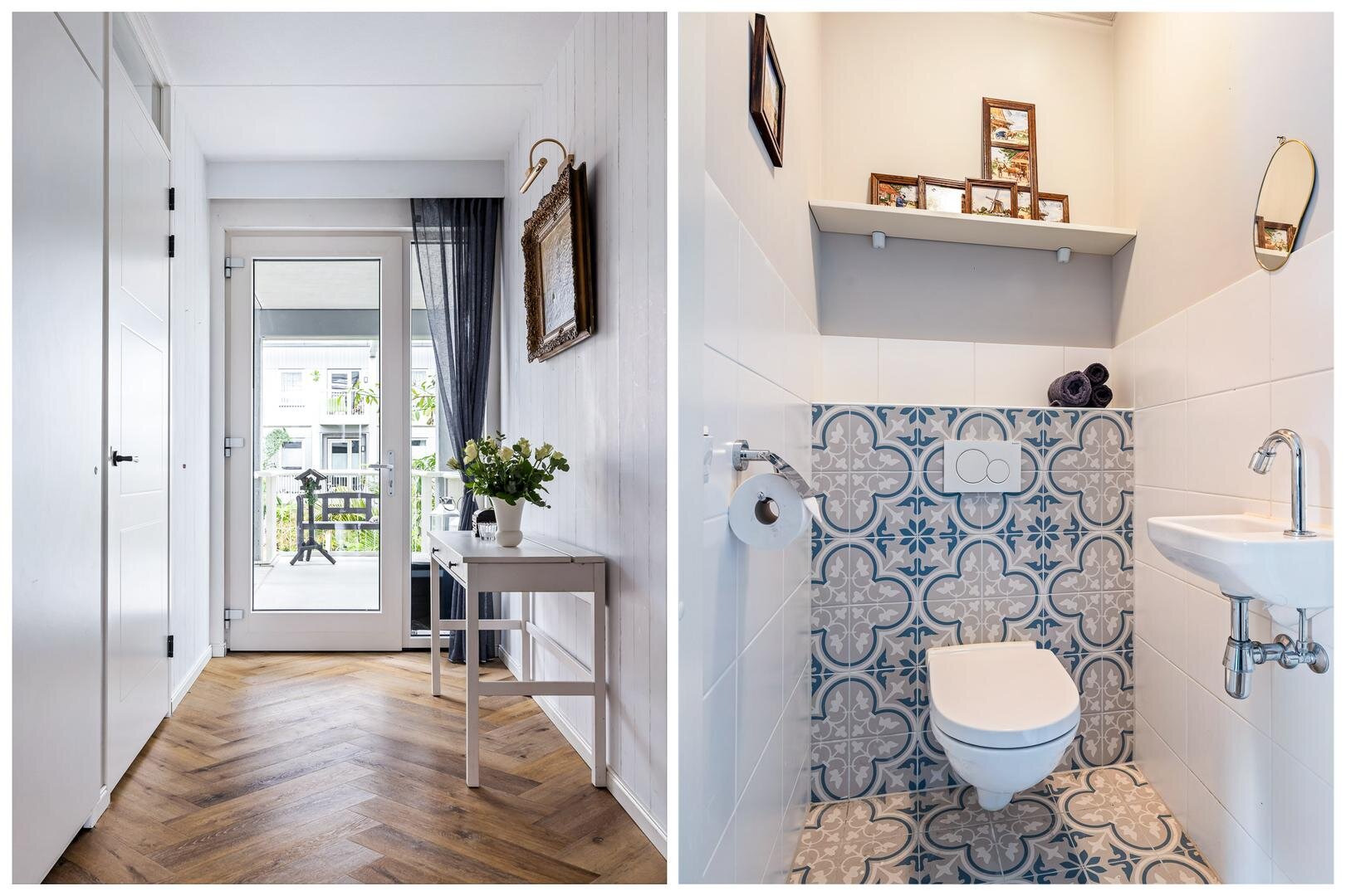 Via de entree kom je in de lichte hal, die toegang biedt tot alle vertrekken. Aan zowel de linker- als rechterzijde bevinden zich twee comfortabele slaapkamers, waarvan één is voorzien van een praktische inbouwkast. Vanuit de slaapkamer aan de linkerzijde bereik je de moderne badkamer, compleet met een extra toilet, dubbele wastafel met meubel en een heerlijke regendouche.