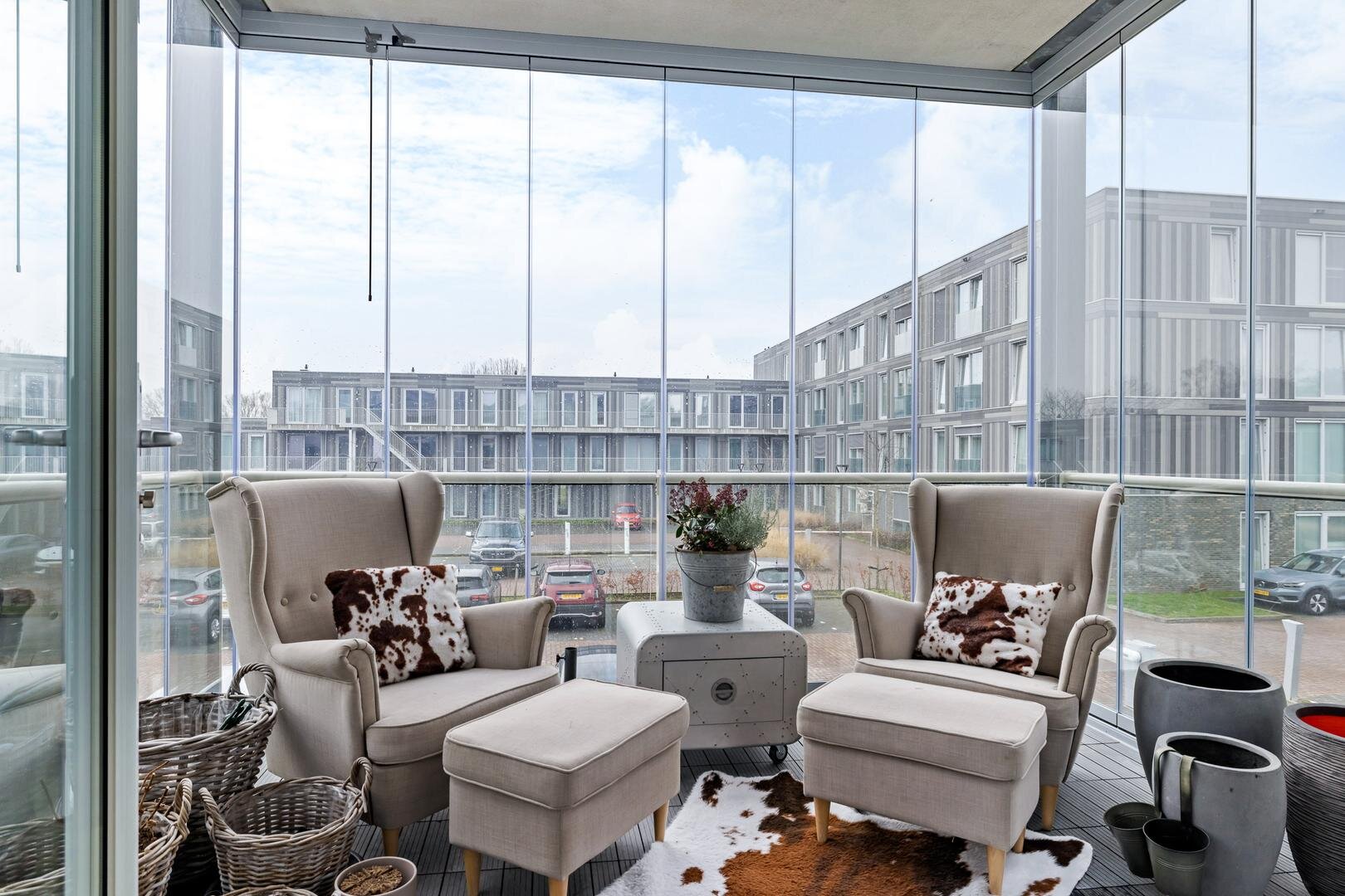 Balkon voorzien van glazen wand en daardoor ook te gebruiken als tuinkamer