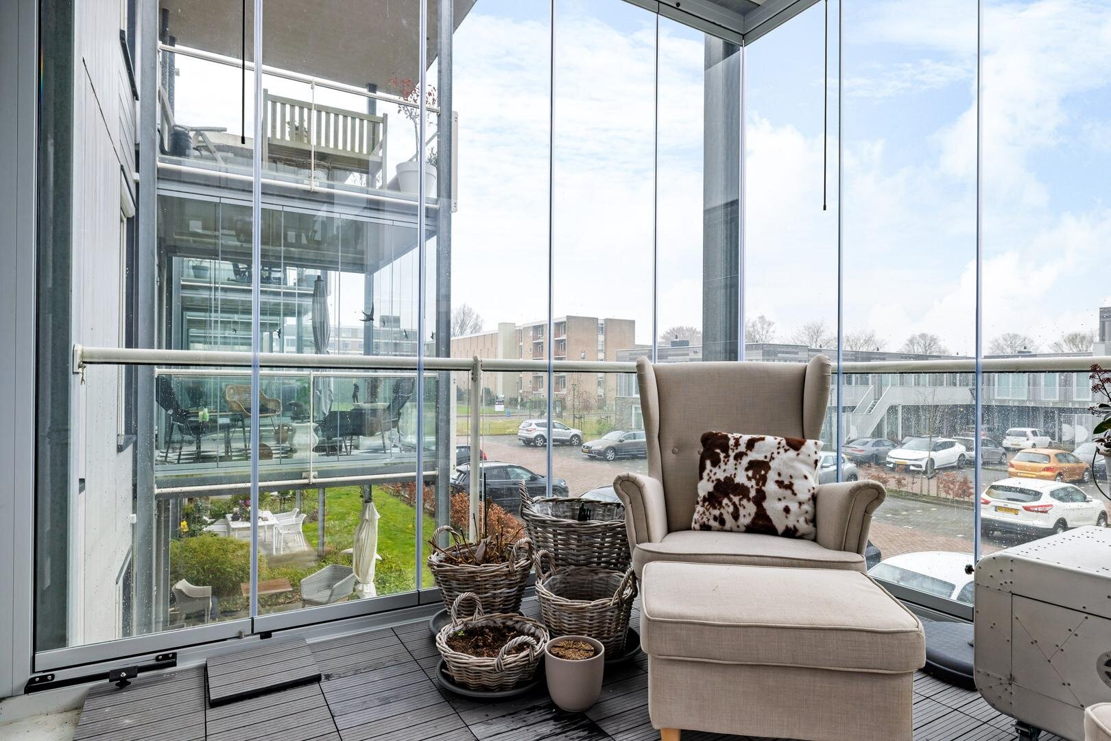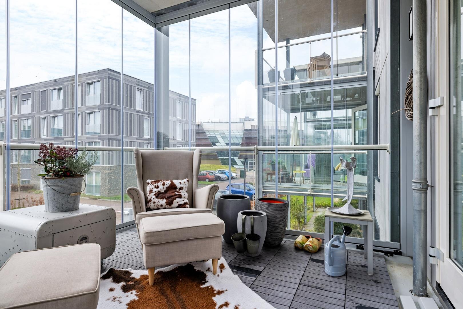 Vanuit de woonkamer geven de openslaande deuren toegang tot het ruime balkon. Hier is een glazen wand geplaatst, waardoor deze ruimte niet alleen als balkon, maar ook uitstekend als heerlijke tuinkamer gebruikt kan worden. Een fantastische plek om al vroeg in het voorjaar en tot laat in het najaar te genieten van rust, licht en comfort.
