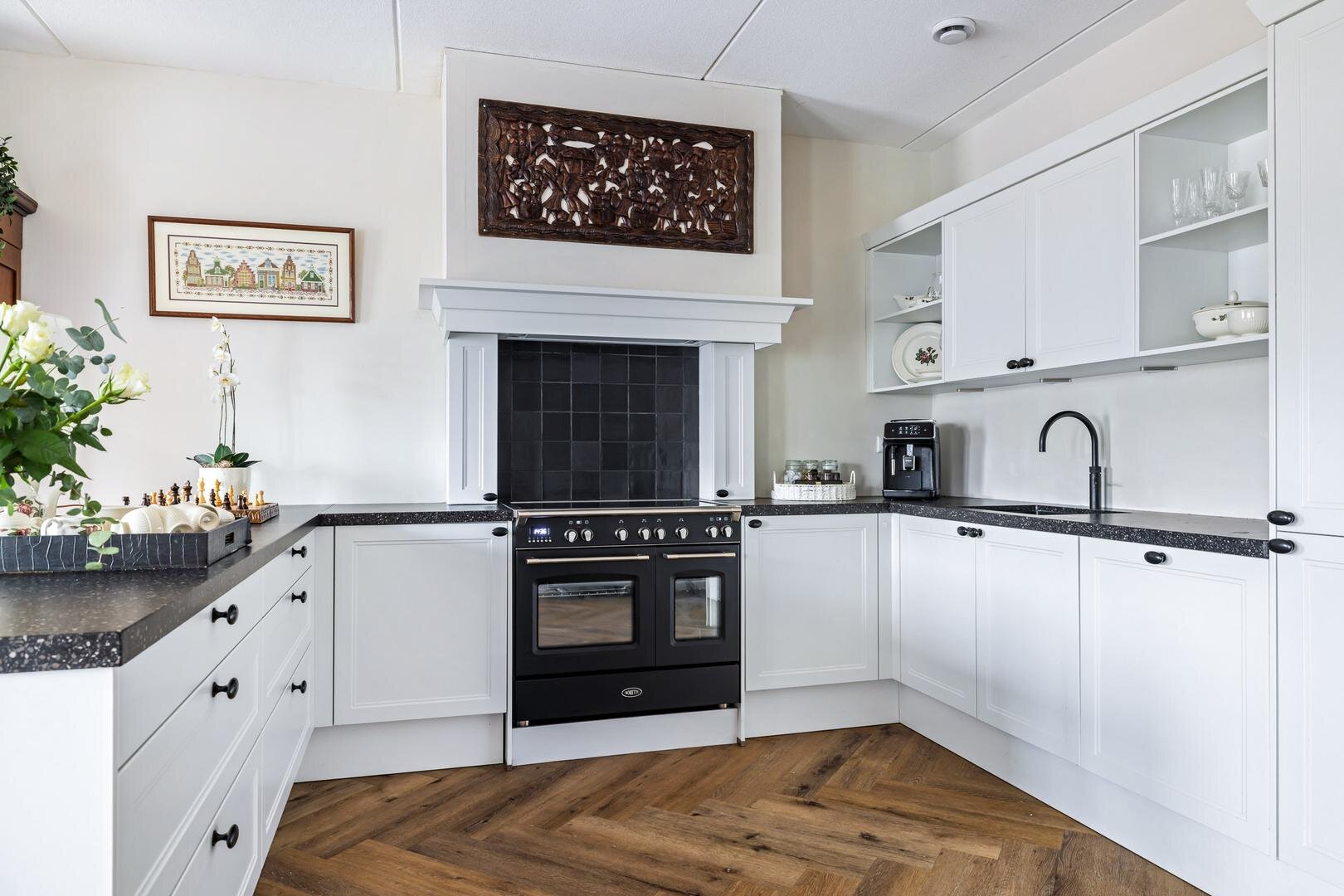 Aan de rechterzijde van de hal bevinden zich daarnaast een ruime wasruimte en een separaat hangend toilet met fonteintje. Aan het einde van de hal stap je de royale woonkamer binnen. Hier vallen direct de ruimte, het licht en de luxe afwerking op. Aan de rechterzijde vind je de stijlvolle keuken met eetgedeelte. De keuken is voorzien van hoogwaardige inbouwapparatuur, waaronder een vaatwasser, inbouw koel-vriescombinatie, Quooker en een Boretti fornuis met dubbele oven en inductiekookplaat met geïntegreerde afzuiging.