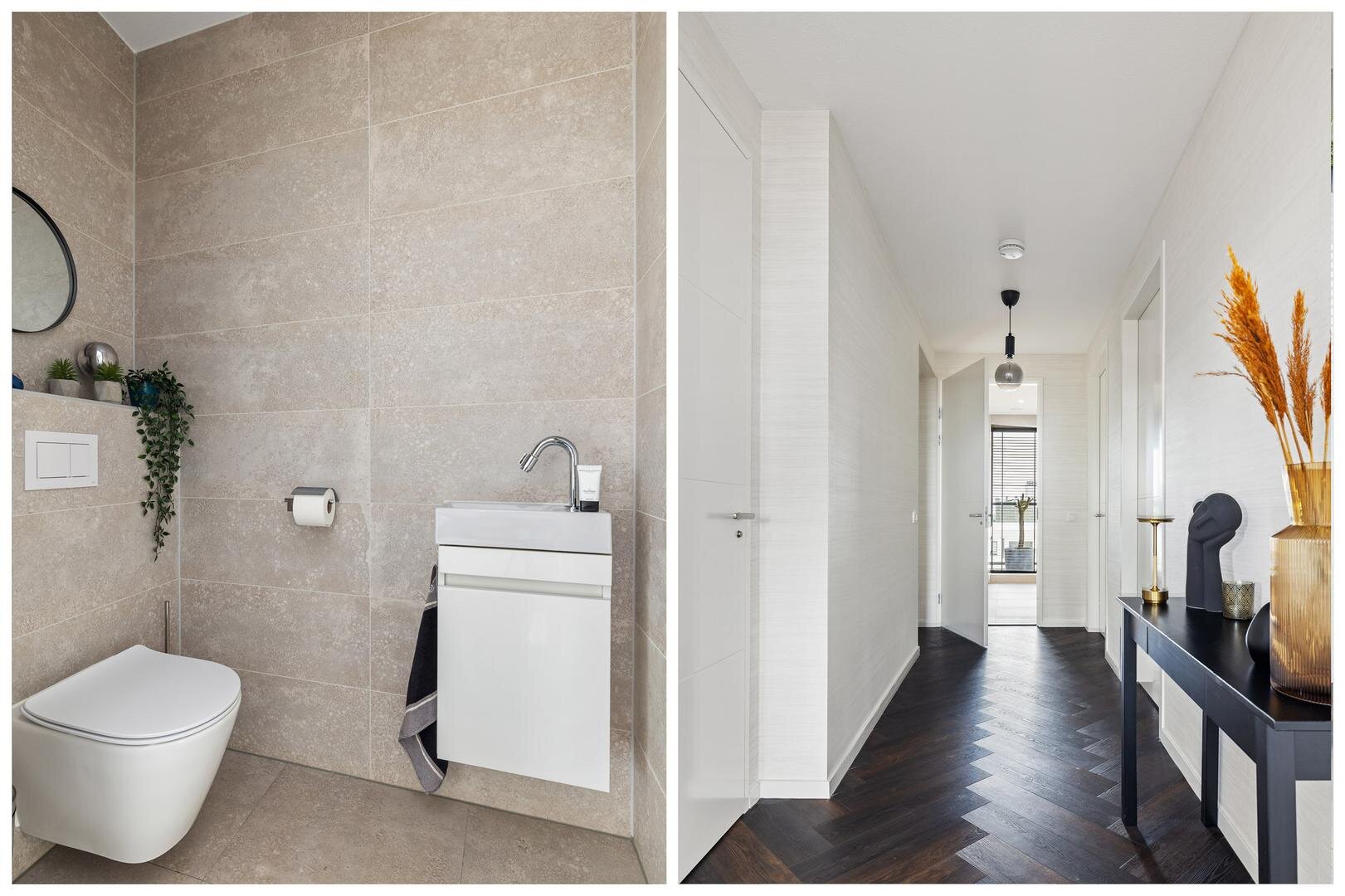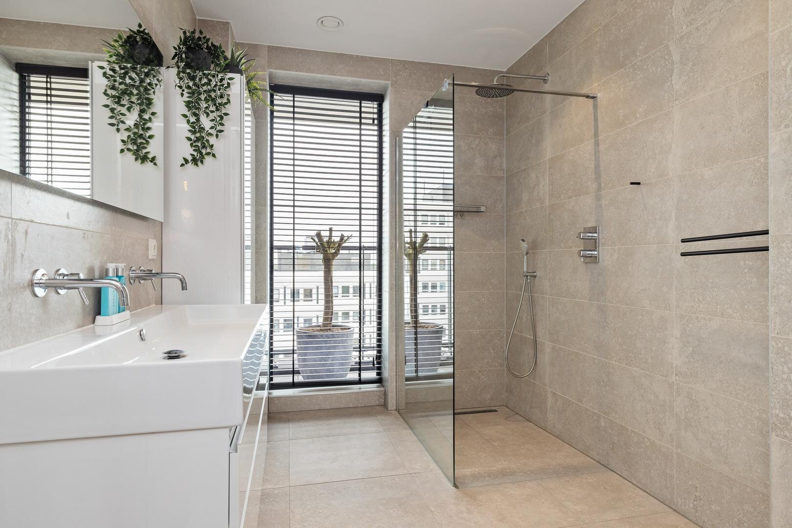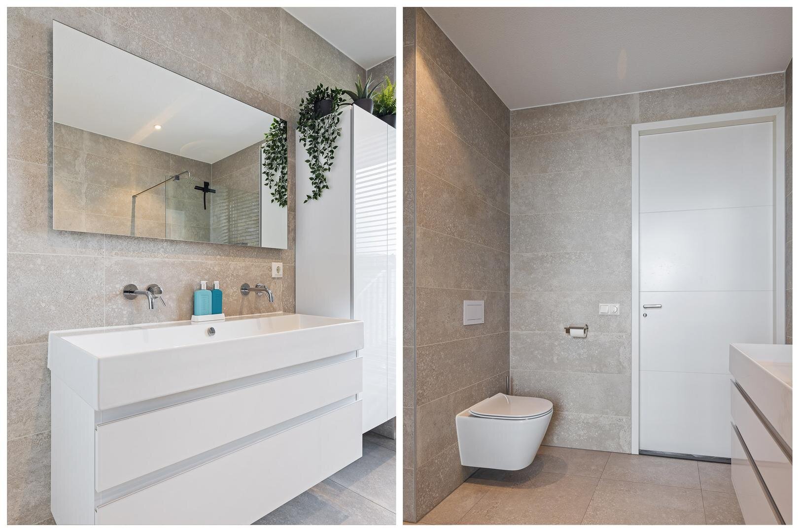 - stijlvolle badkamer met tweede toilet, ruime inloopdouche en dubbele wastafel.