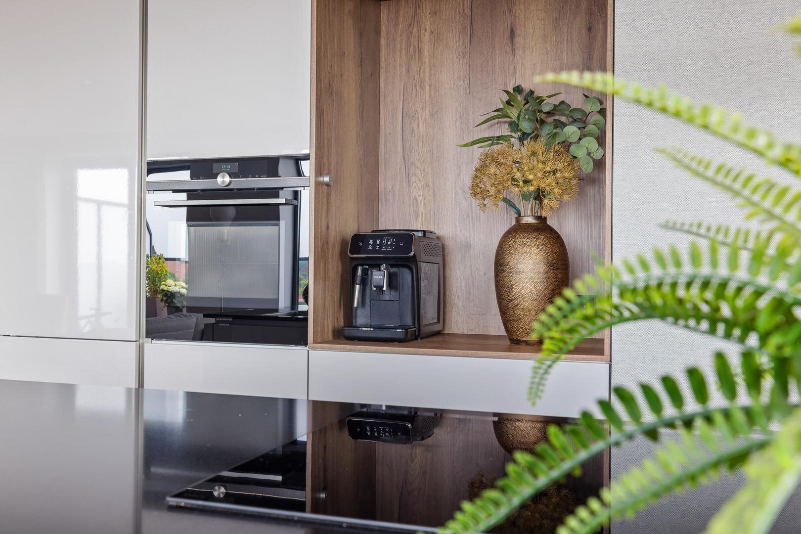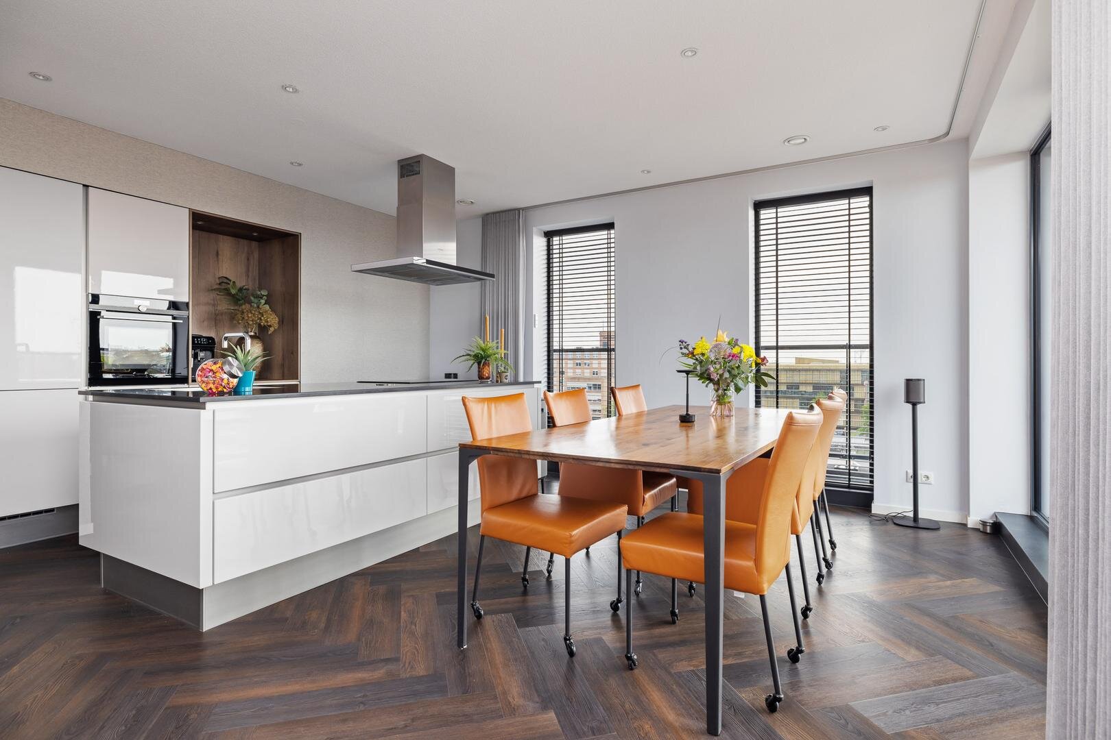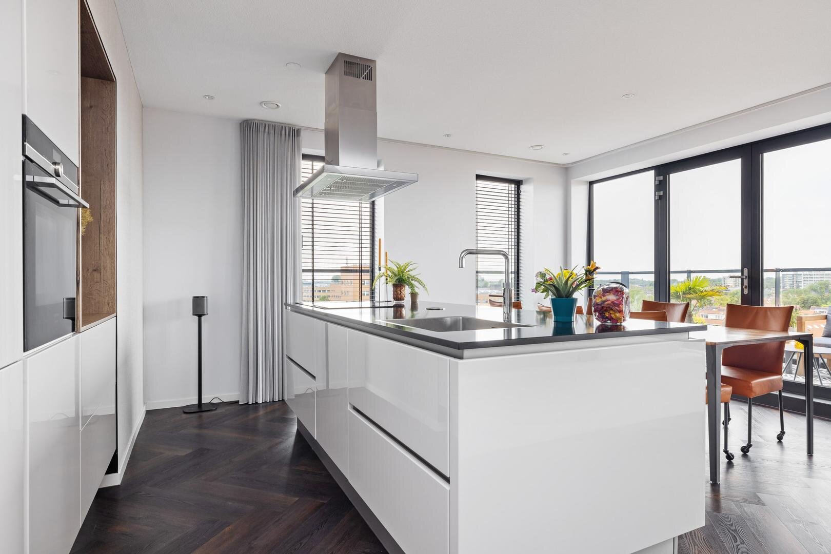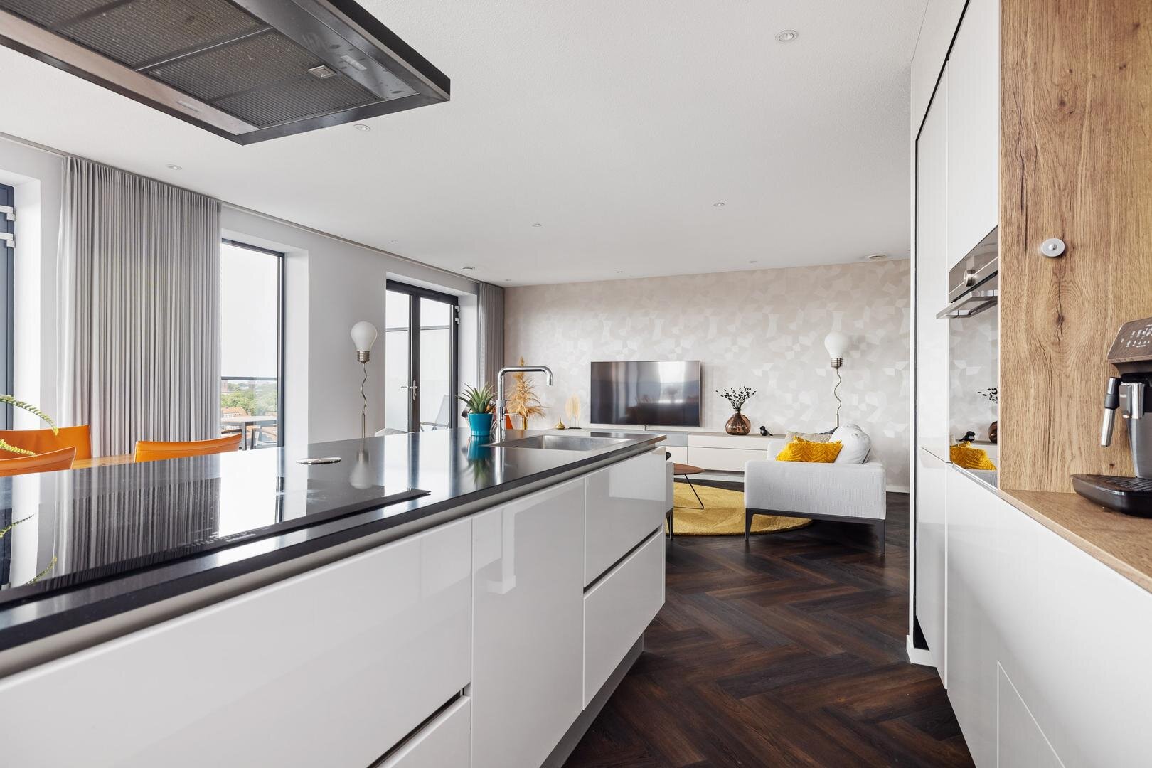 - moderne open woonkeuken in eilandopstelling, voorzien van diverse inbouwapparatuur;